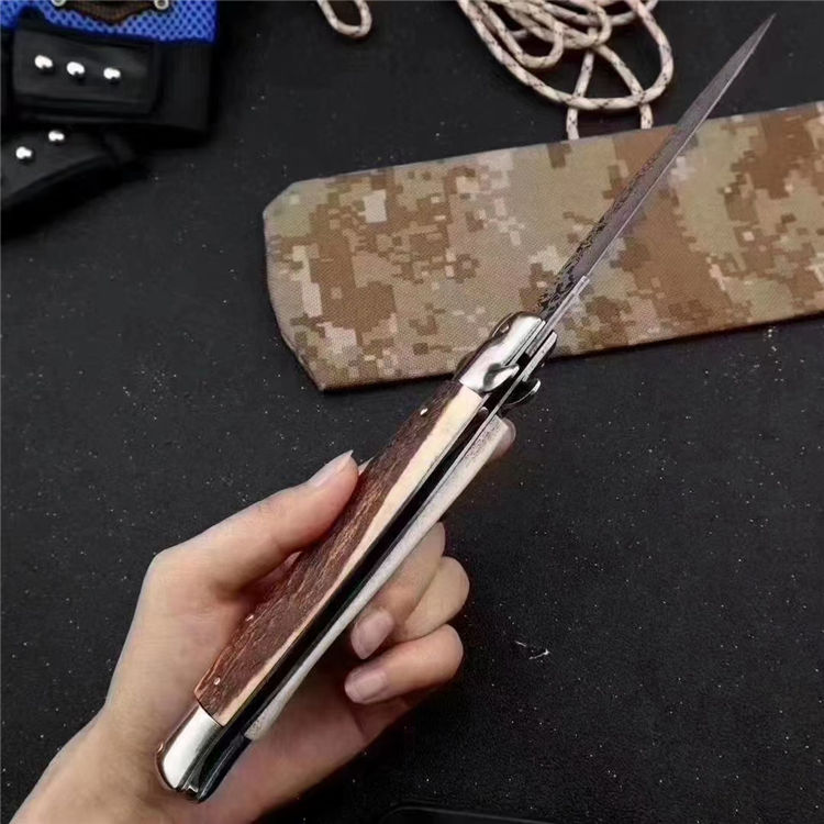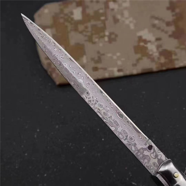 大马士革11英寸AKC鹿角柄黑手党侧开跳刀 全长:28cm 刃长:12.5cm 柄长:15.5cm 刃宽:1.3cm(最宽处) 刃厚:3.0mm 刃材:大马士革 刀柄:天然鹿角 开刀方式:弹簧 重量:150克