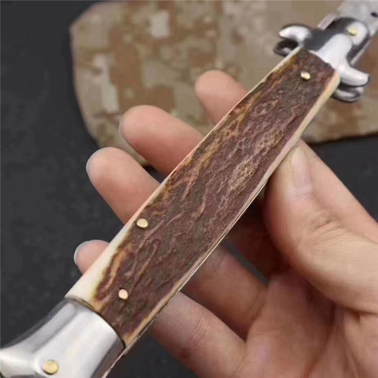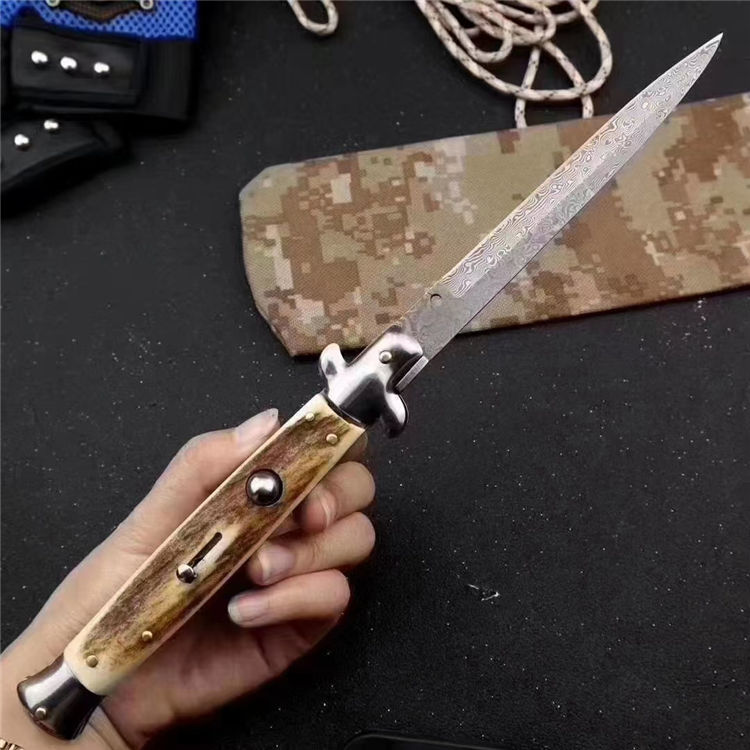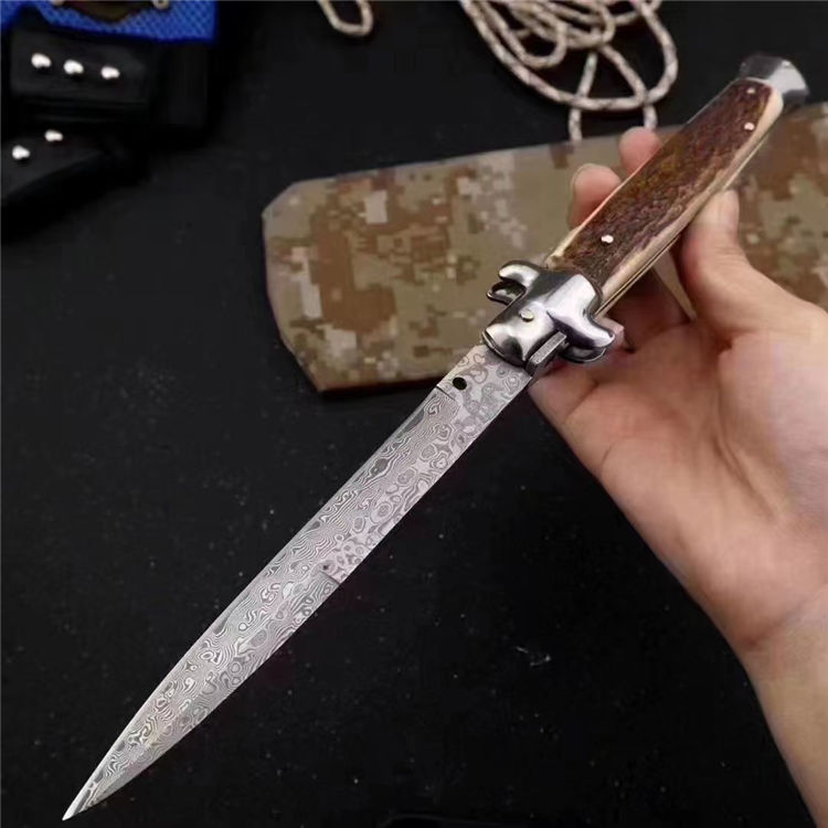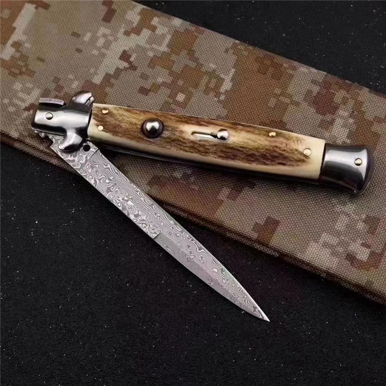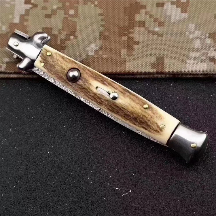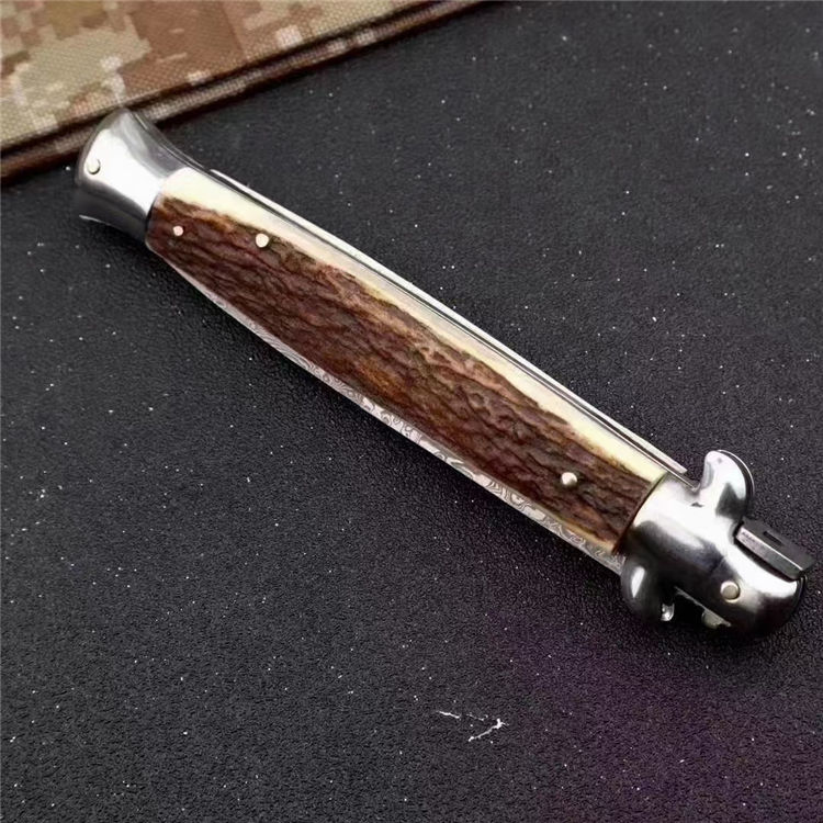 大马士革11英寸AKC鹿角柄黑手党侧开跳刀