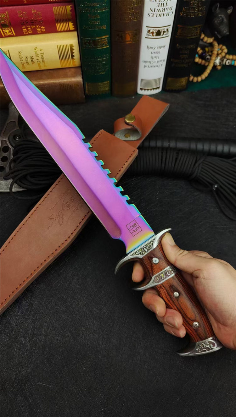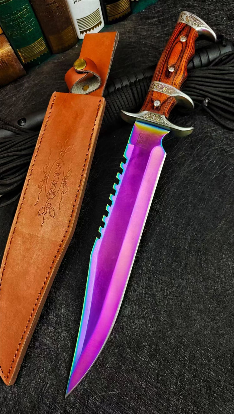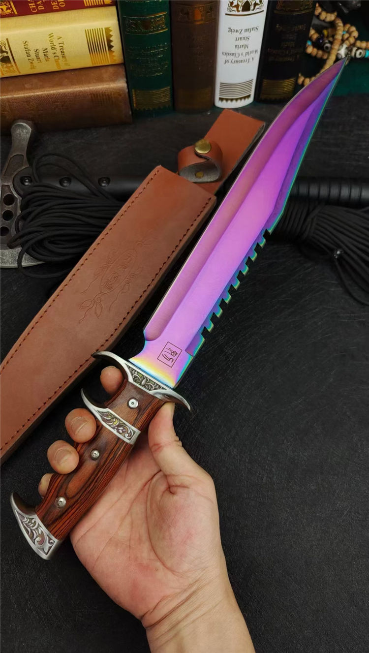 刀奴系列紫光战斗刀 全长:43.5cm 刃长:28cm 刃厚:4.5mm 刃材:N69特种钢 刃宽:4cm 柄长:13.5cm 硬度: 58-59HRC 表面:全彩钛偏紫 净重:789g 裸刀 重量:900g(含刀套) 刀柄:钢头雕花+进口彩木 刀鞘:硬质皮套+彩盒 全彩钛渐变技术渲染刀刃,钢材采用优质高碳钢N69打造!款式惊艳,收藏把玩