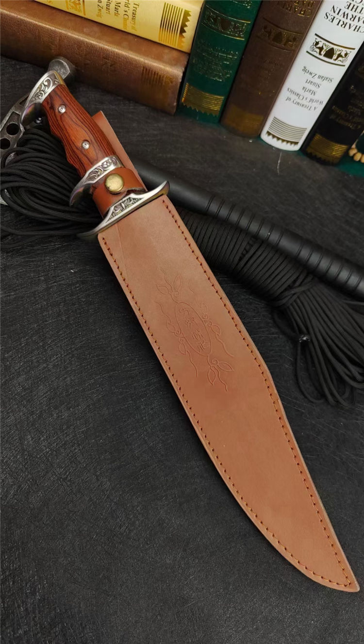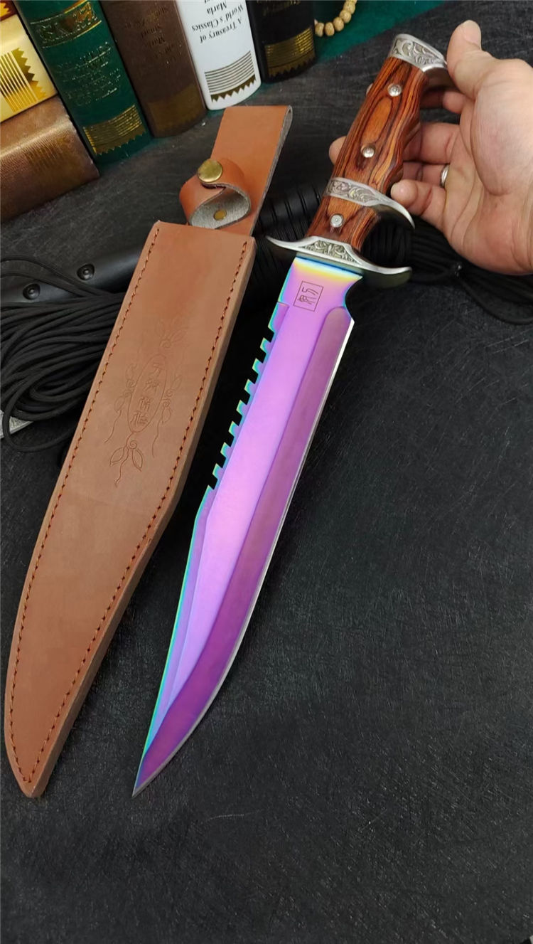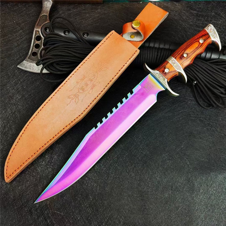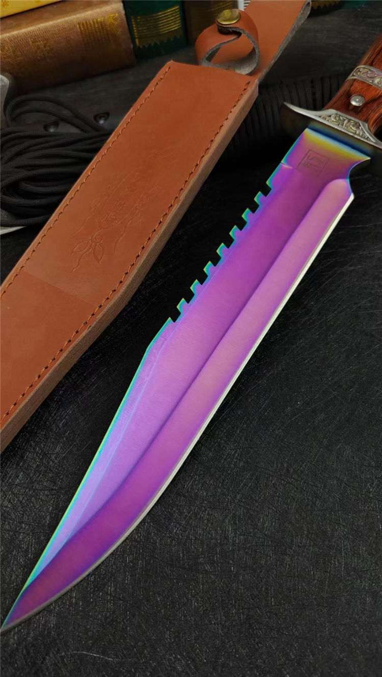 刀奴系列紫光战斗刀 全长:43.5cm 刃长:28cm 刃厚:4.5mm 刃材:N69特种钢 刃宽:4cm 柄长:13.5cm 硬度: 58-59HRC 表面:全彩钛偏紫 净重:789g 裸刀 重量:900g(含刀套) 刀柄:钢头雕花+进口彩木 刀鞘:硬质皮套+彩盒 全彩钛渐变技术渲染刀刃,钢材采用优质高碳钢N69打造!款式惊艳,收藏把玩