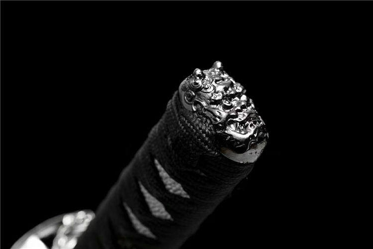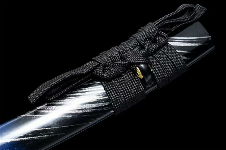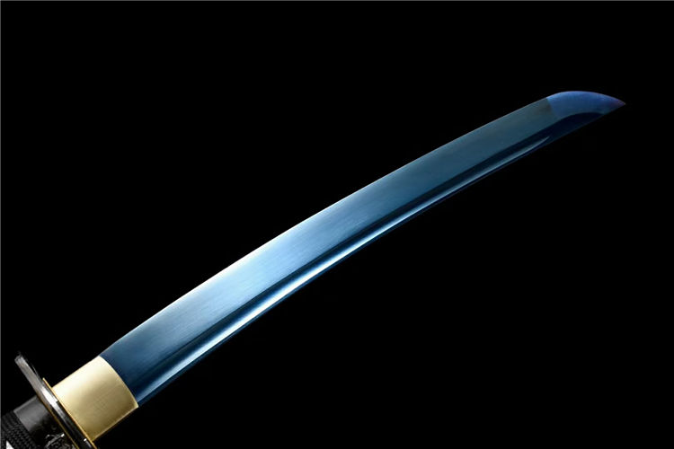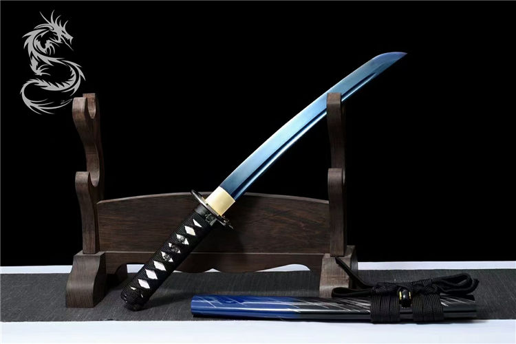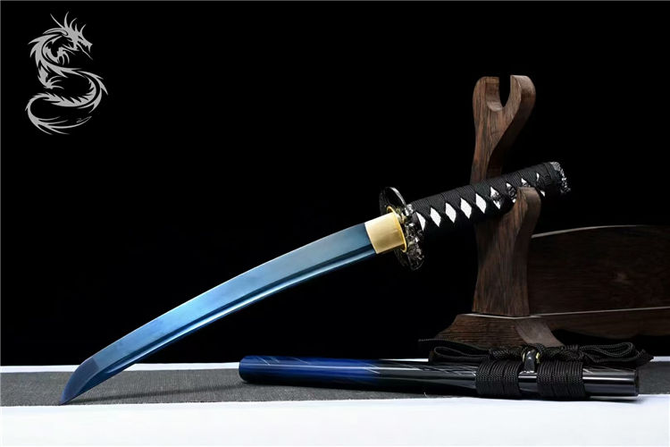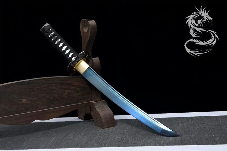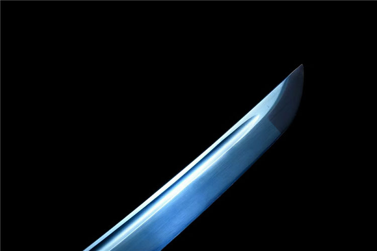 龙泉古法工艺,24道手工推磨,刀身开血槽烤蓝,锌合金镀黑刀盘,纯铜刀夹,配高端锦盒