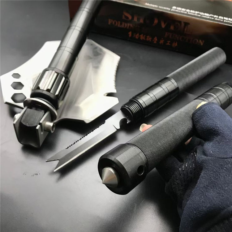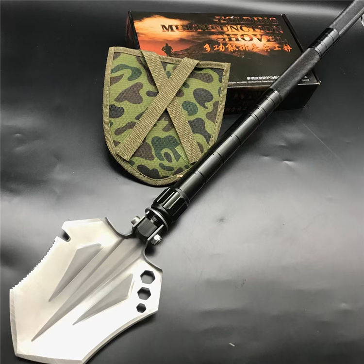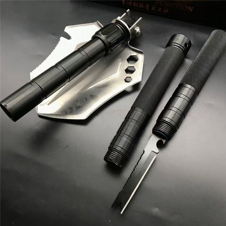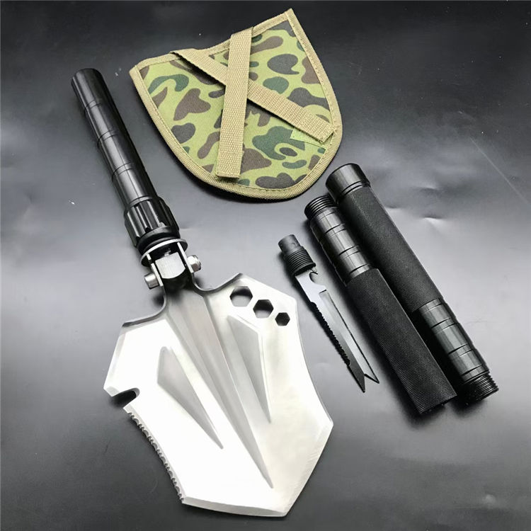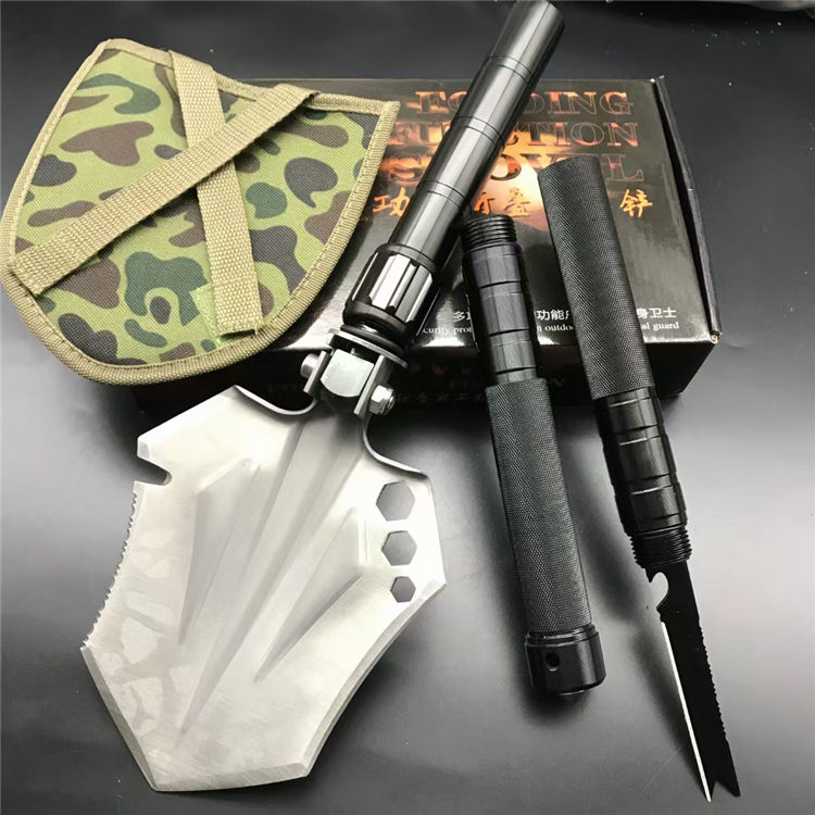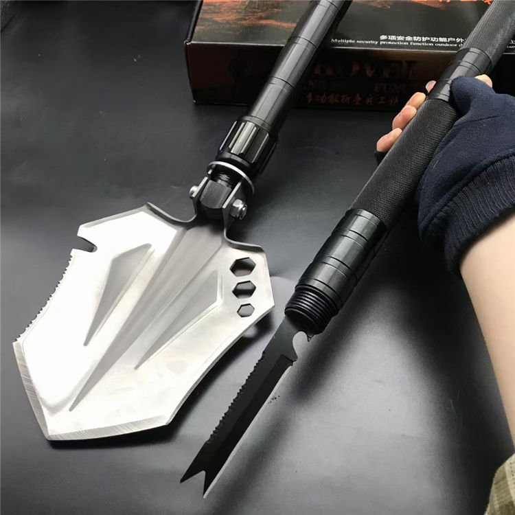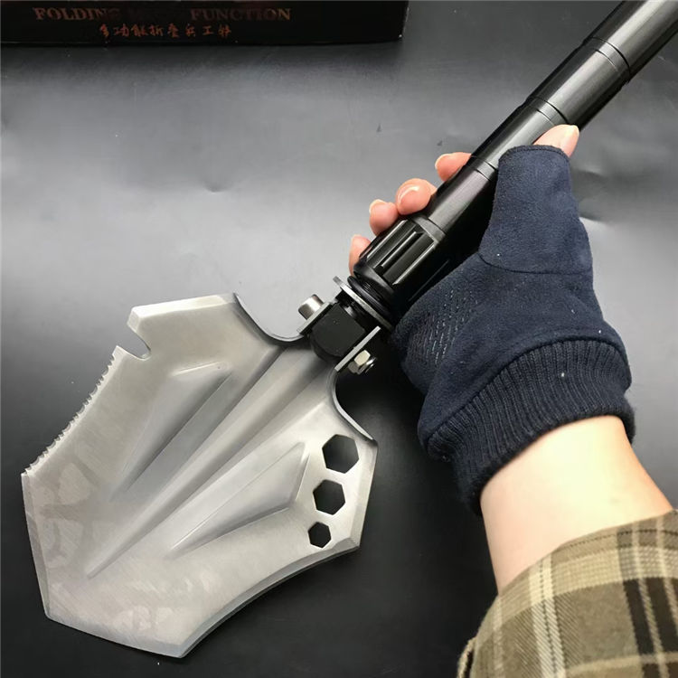 功能:V型铲面,轻松破土,有铲、锄、锯、刀,在生产工艺上采用上好淬火高碳钢,增加强度,抗磨损,抗腐蚀,耐高温等优势.有把铲在手,登山,外出永不怕
