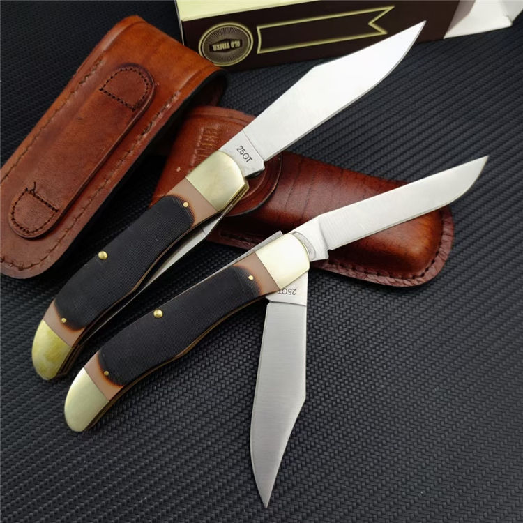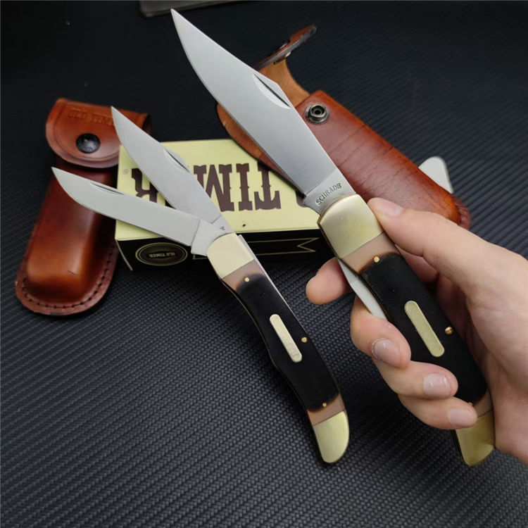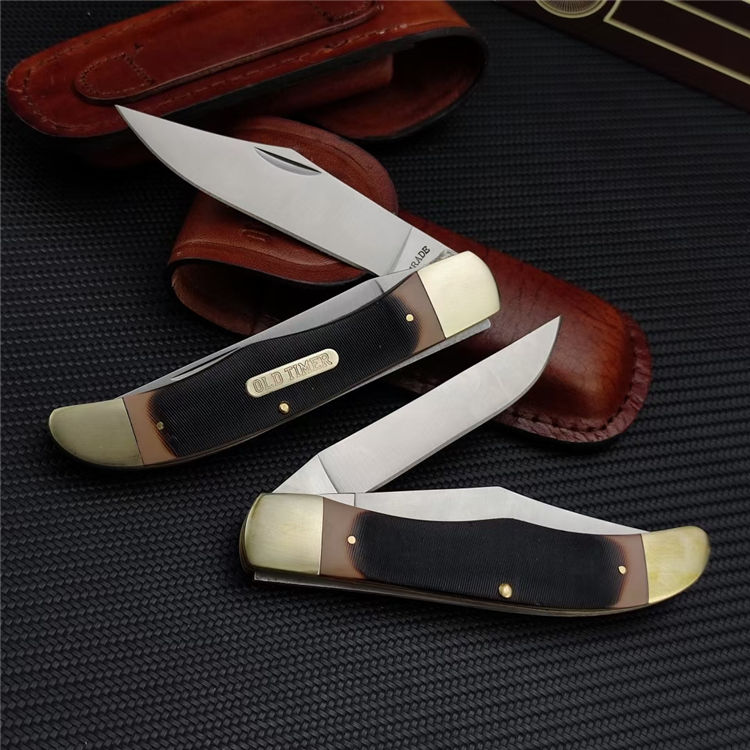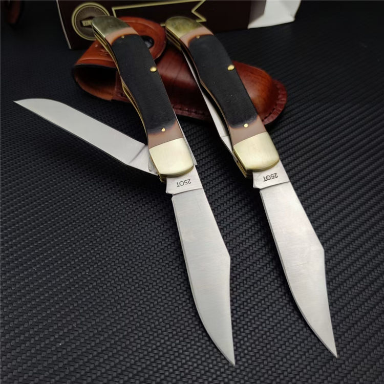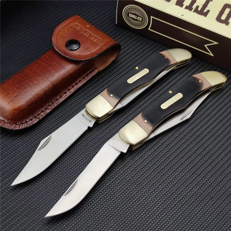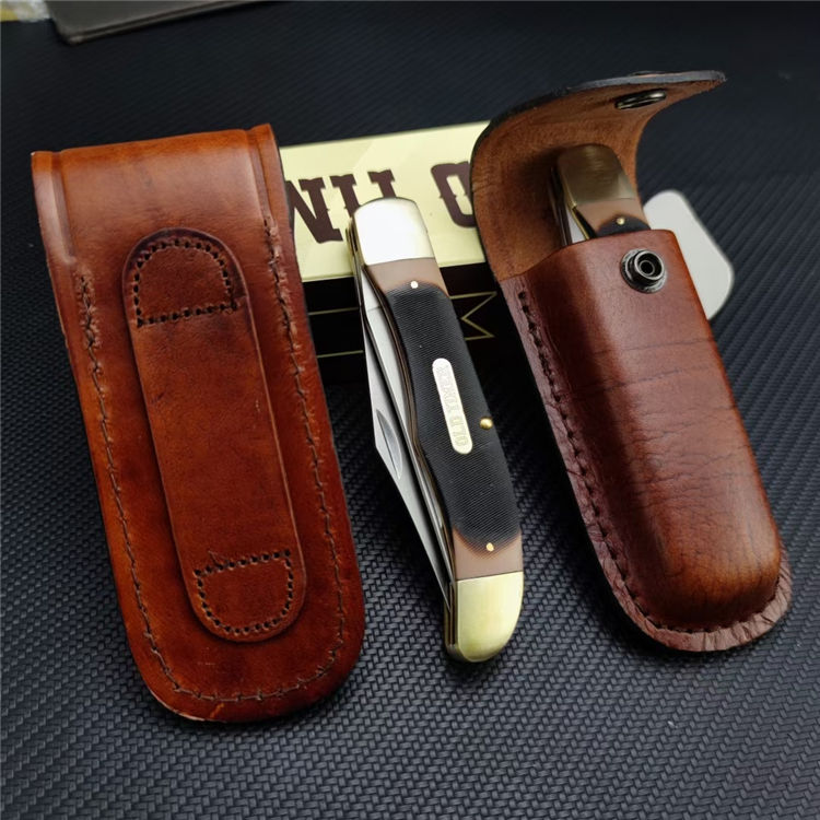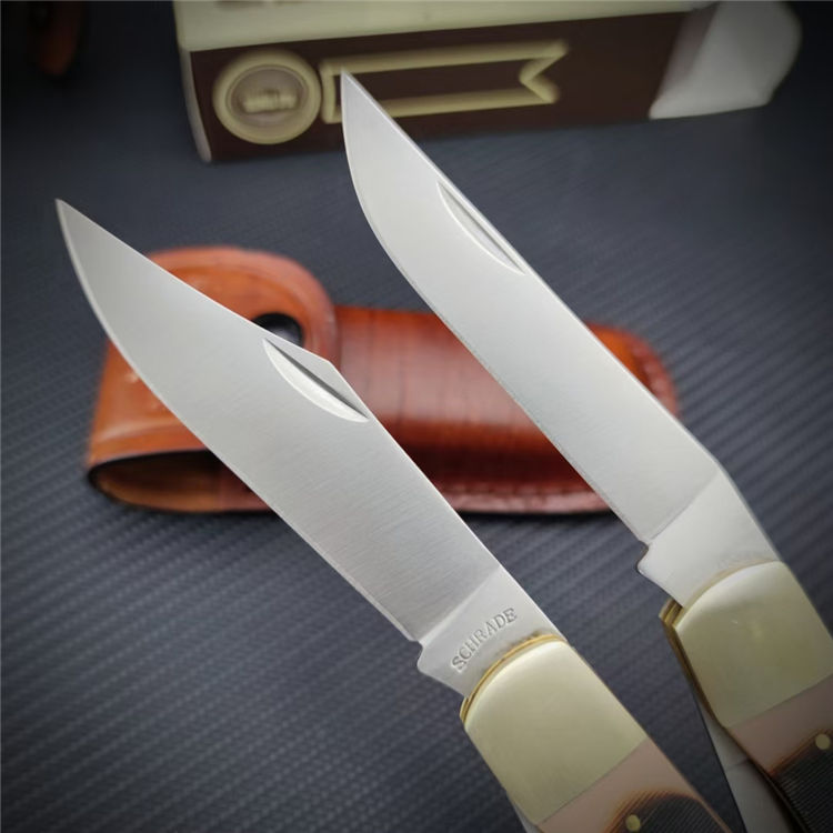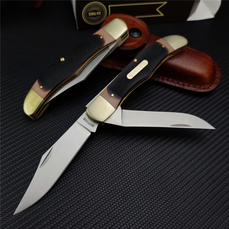 施拉德25OT双开折刀 总长:23.5CM 刃长:10.2CM 刃宽:2.3CM 刃厚:3MM 刃材:7Cr13Mov 柄材:黄铜+亚克力 柄长:13.3CM 柄宽:24MM 柄厚:15MM 净重:190G含刀鞘 鞘材:头层牛皮