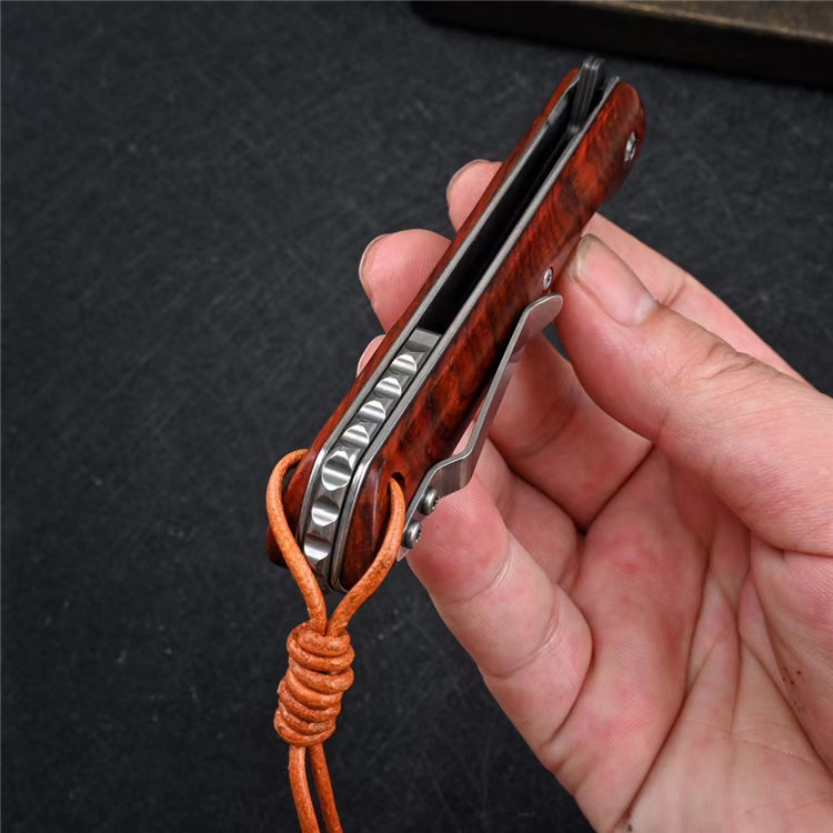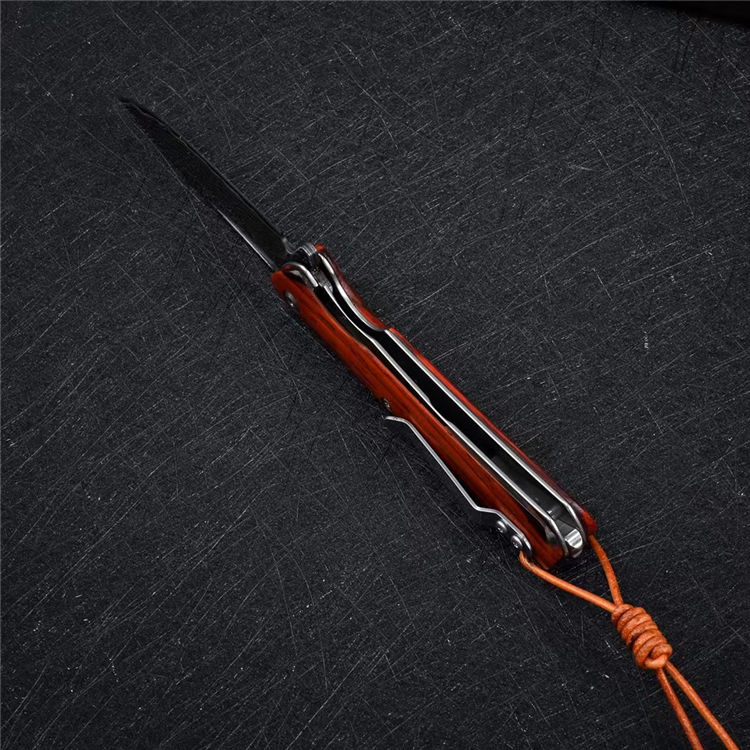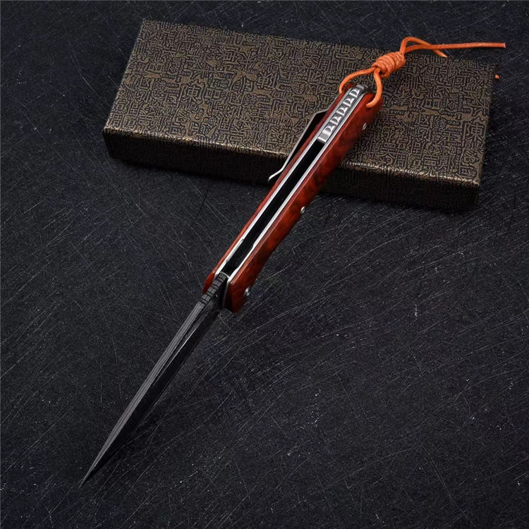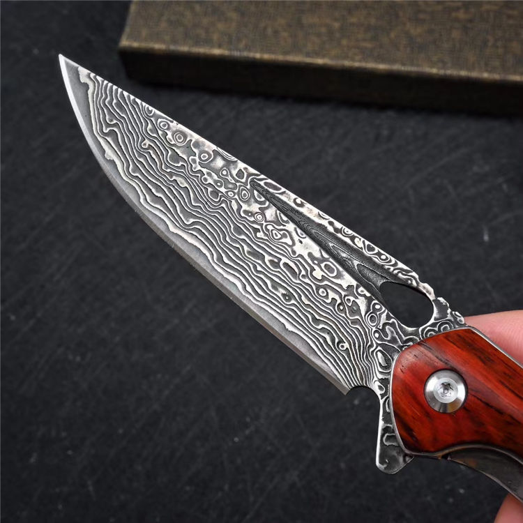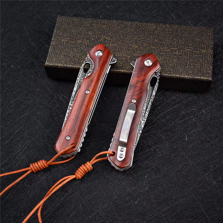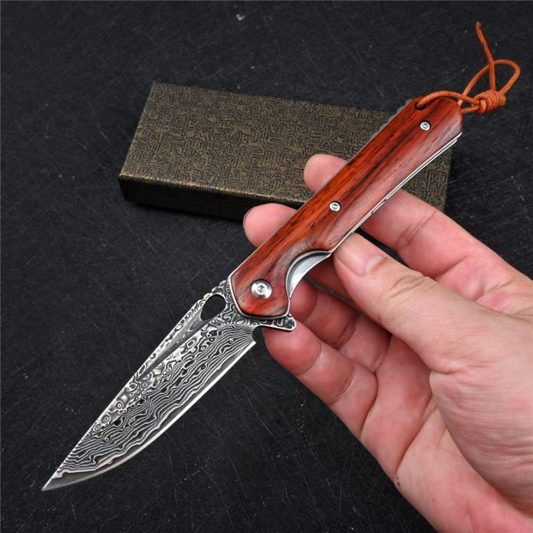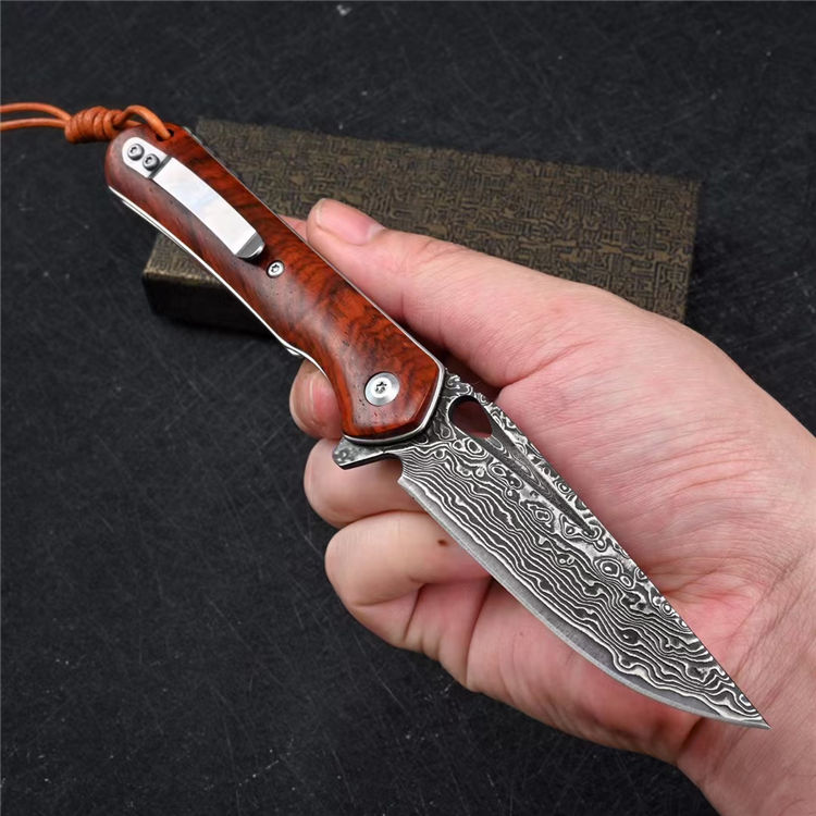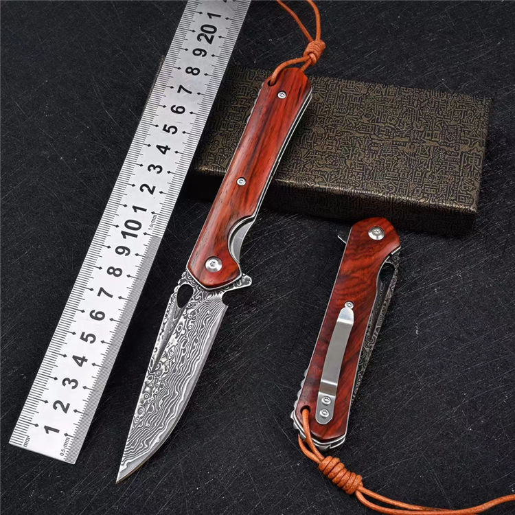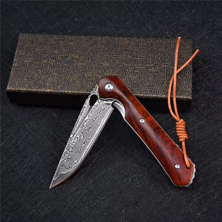 大马士革克里斯夫黄檀木大沙折刀 全长:19.5CM 刃长:8CM 柄长:11CM 厚度:2.8MM 宽度:2.3MM 净重:97G 毛重:164G 钢材:VG10大马士革钢 柄材:黄檀木 硬度:60-61HRC 包装:礼品盒
