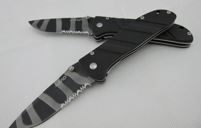 三刃木(LAND)GB9-907折刀(虎纹) 全 长: 20.3cm 刃 长: 8.8cm 刃 宽: 3.0cm(最宽处) 闭 合: 11.0cm(柄长) 刃 材: 440 不锈钢 硬 度: 56 HRC 表 面: 虎纹 刃 厚: 0.28cm 柄 材: G10 净 重: 80.0g 包 装:原厂纸盒 锁 闭: 线锁 其 他:配附背夹,半齿开锋