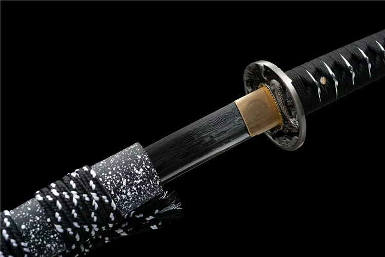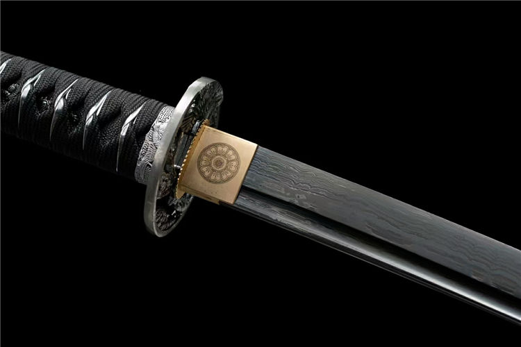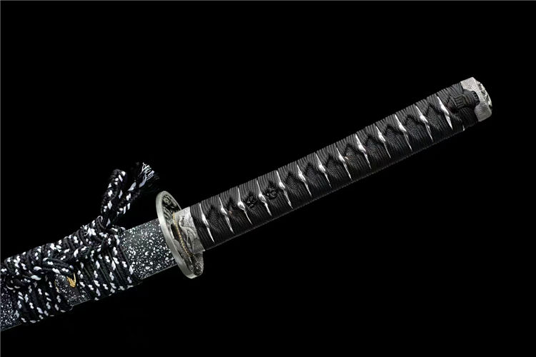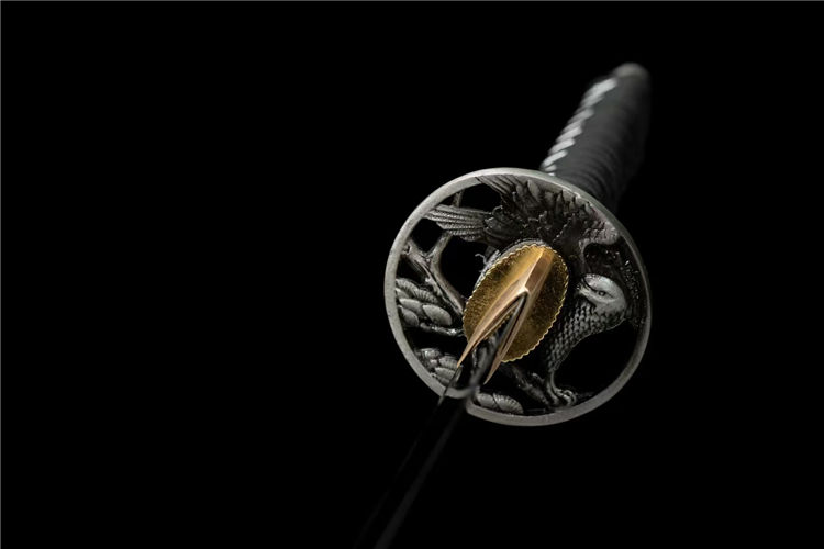 鹰眼武士刀 全长:103cm 刃长:72cm 柄长:26cm 刃厚:0.7cm 刃宽:3.2cm 重量约:1.25 KG 刃材:百炼花纹钢发黑工艺处理,锻打弯曲90度迅速回直高硬度高达60度 鞘材:实木刀鞘大漆 手柄:手工绕绳 赠品:高档锦盒