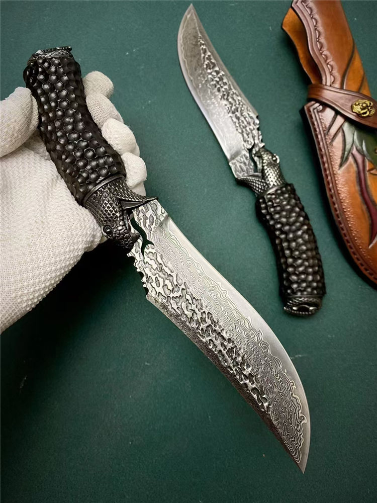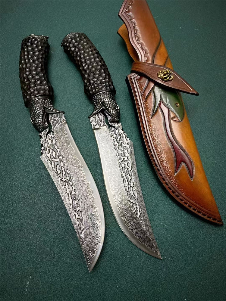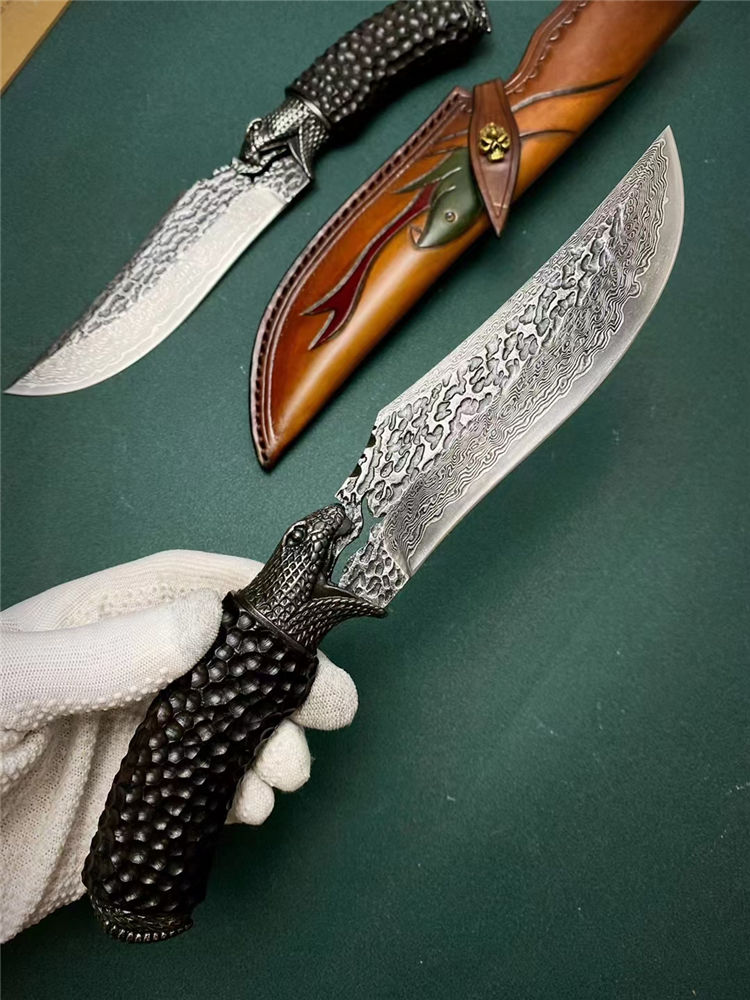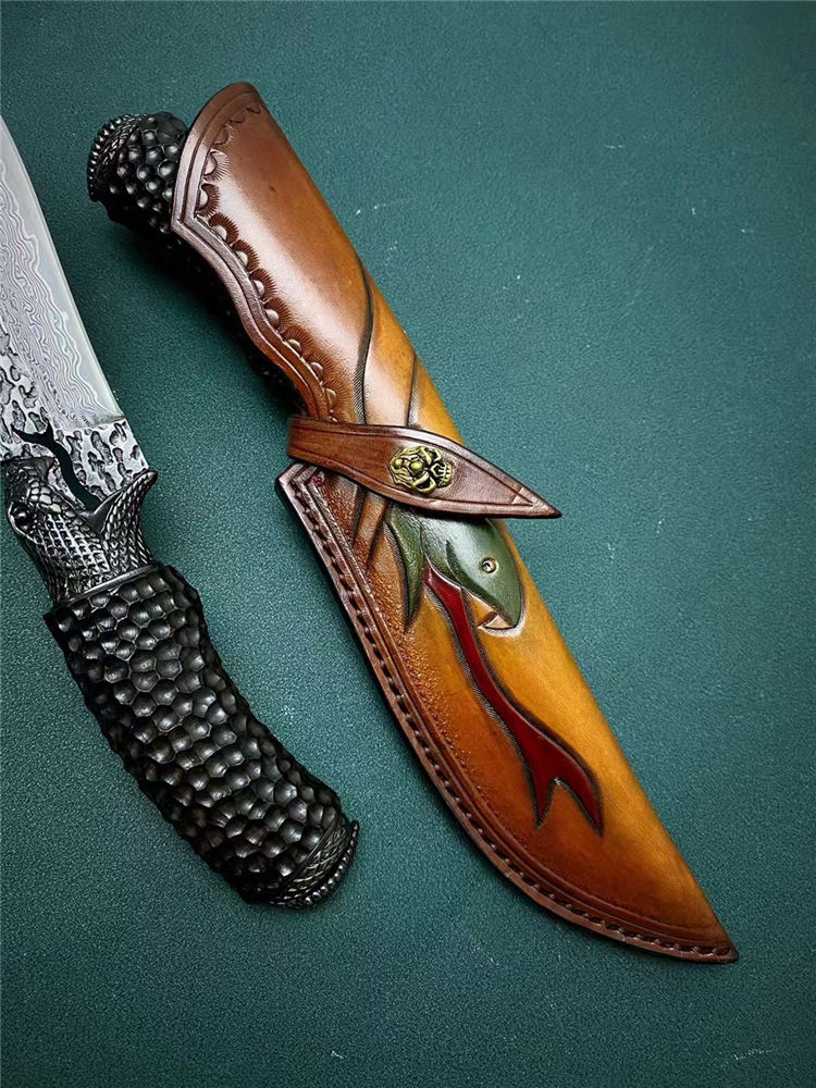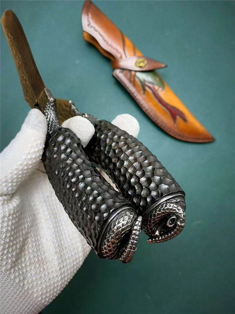 大马士革黑版响尾蛇直刀 全长:28cm 刃长:15cm 柄长:13cm 刃材:大马士革钢 刃厚:4.2mm 硬度:60HRC 柄材:发黑雕刻蛇头+黑檀木+发黑雕刻蛇尾 包装:手工盒 独特美观纯手作,家居办公镇宅辟邪神器,高端的作品。每一把设计到完成耗时漫长,喜欢的不要错过,刀片采用进口锻造大马士革钢(祥云抛光纹)真空加热处理过,经二次手工开刃保持耐久锋利、适用砍/割/等户外活动,手柄挡手镶嵌(蛇头+蛇尾 雕刻物件)、响尾蛇是一款高端品质猎刀,刀友们精品绝不可错过