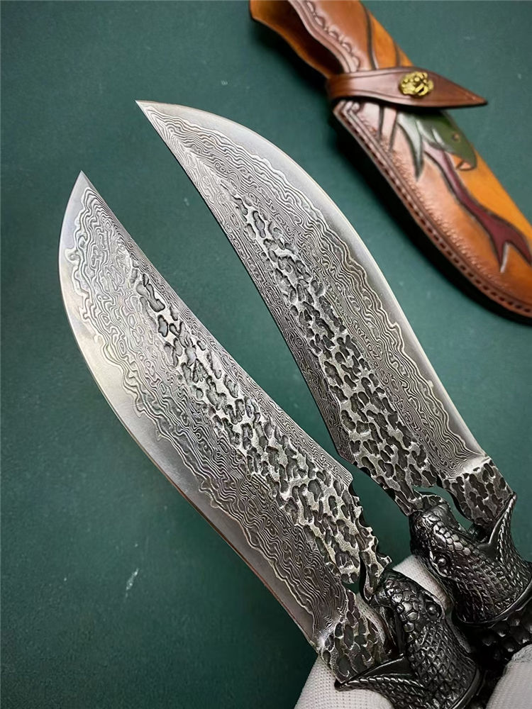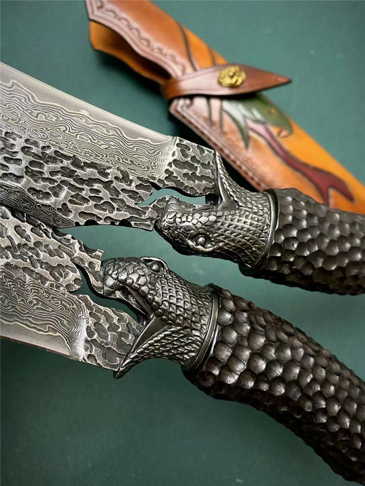独特美观纯手作,家居办公镇宅辟邪神器,高端的作品。每一把设计到完成耗时漫长,喜欢的不要错过,刀片采用进口锻造大马士革钢(祥云抛光纹)真空加热处理过,经二次手工开刃保持耐久锋利、适用砍/割/等户外活动,手柄挡手镶嵌(蛇头+蛇尾 雕刻物件)、响尾蛇是一款高端品质猎刀,刀友们精品绝不可错过
