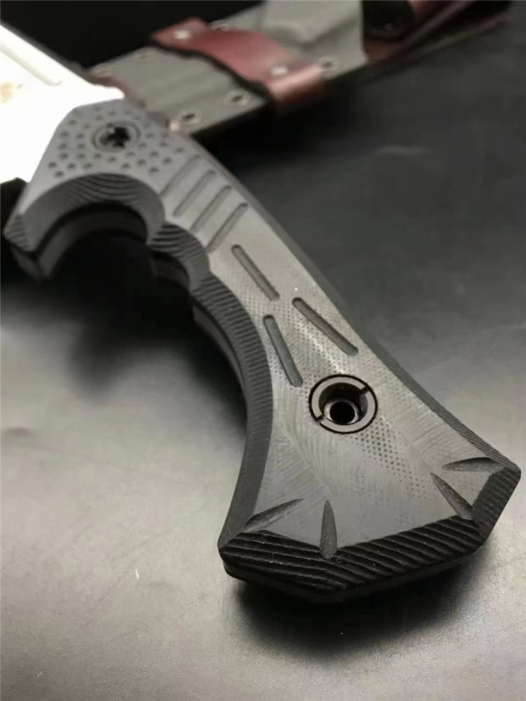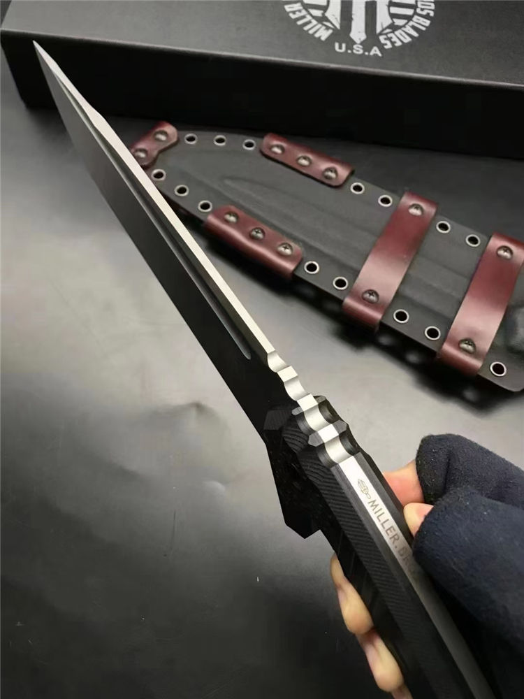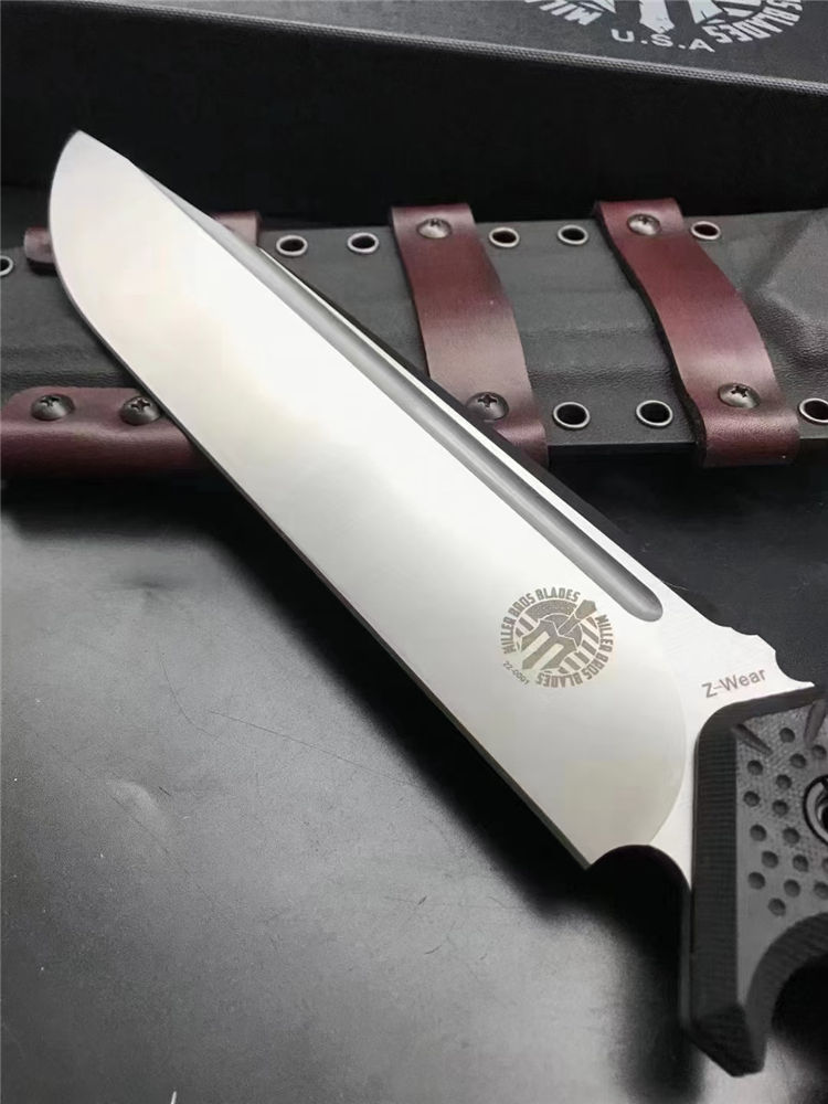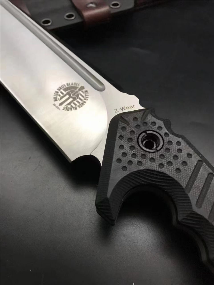 米勒战术直刀 全长:365mm 刃长:232mm 柄长:145mm 刃最宽处:50mm 刃厚:6mm 刃材:z-wear粉末钢 硬度:59-60RHC 开料:线切割开料 开刃方式:二次开刃,以锋利度为主 柄材:黑色G10柄材加钢钉 开V方式:精准数控水磨开V 刀鞘:手工进口K版鞘+意大利进口植鞣皮