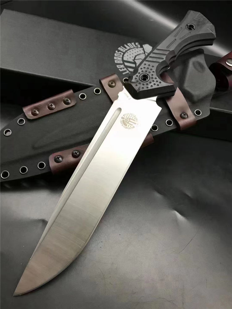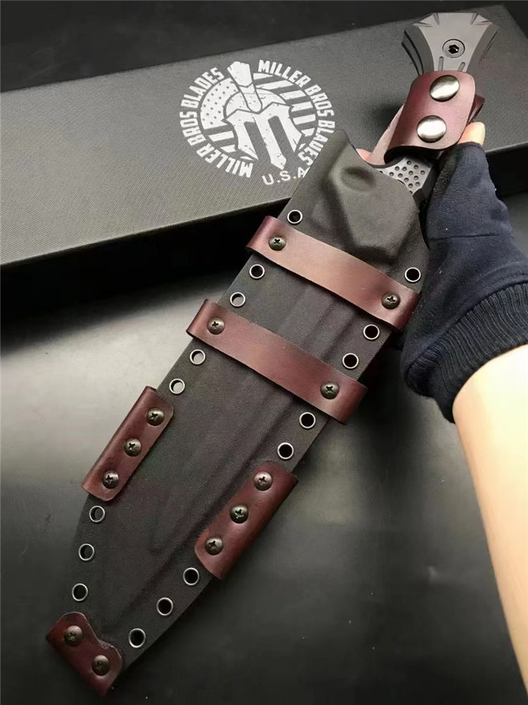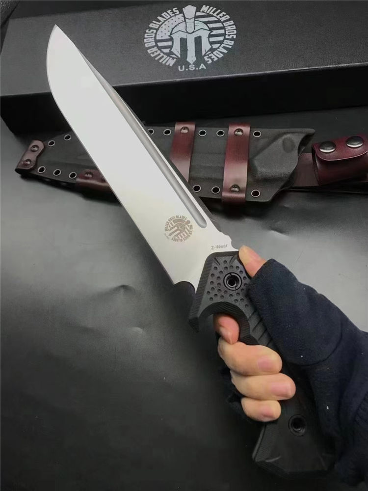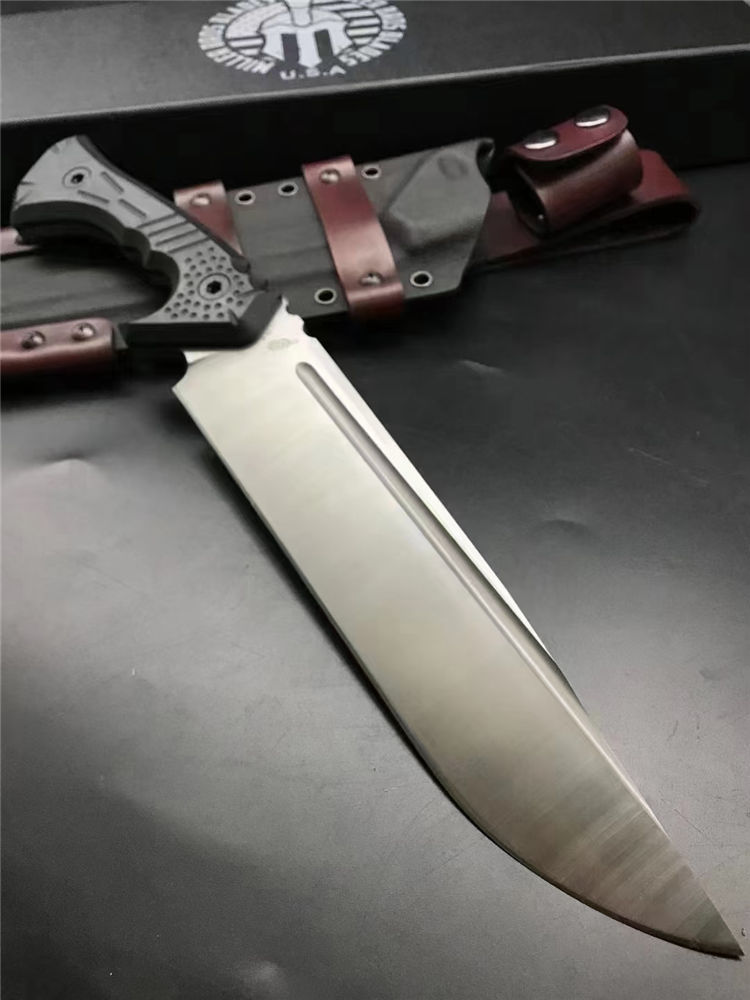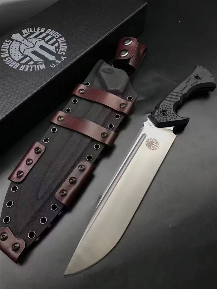 米勒战术直刀 全长:365mm 刃长:232mm 柄长:145mm 刃最宽处:50mm 刃厚:6mm 刃材:z-wear粉末钢 硬度:59-60RHC 开料:线切割开料 开刃方式:二次开刃,以锋利度为主 柄材:黑色G10柄材加钢钉 开V方式:精准数控水磨开V 刀鞘:手工进口K版鞘+意大利进口植鞣皮
