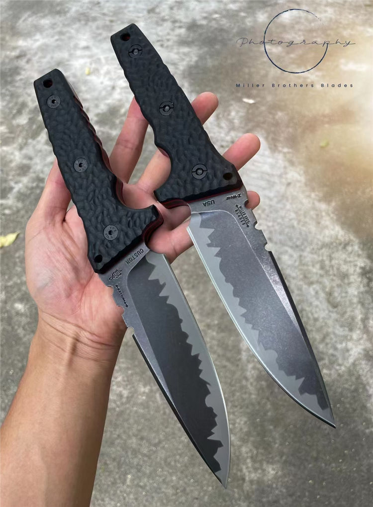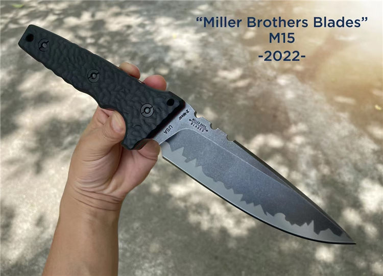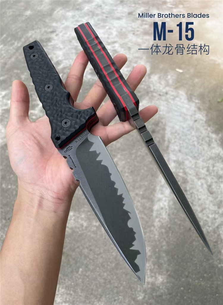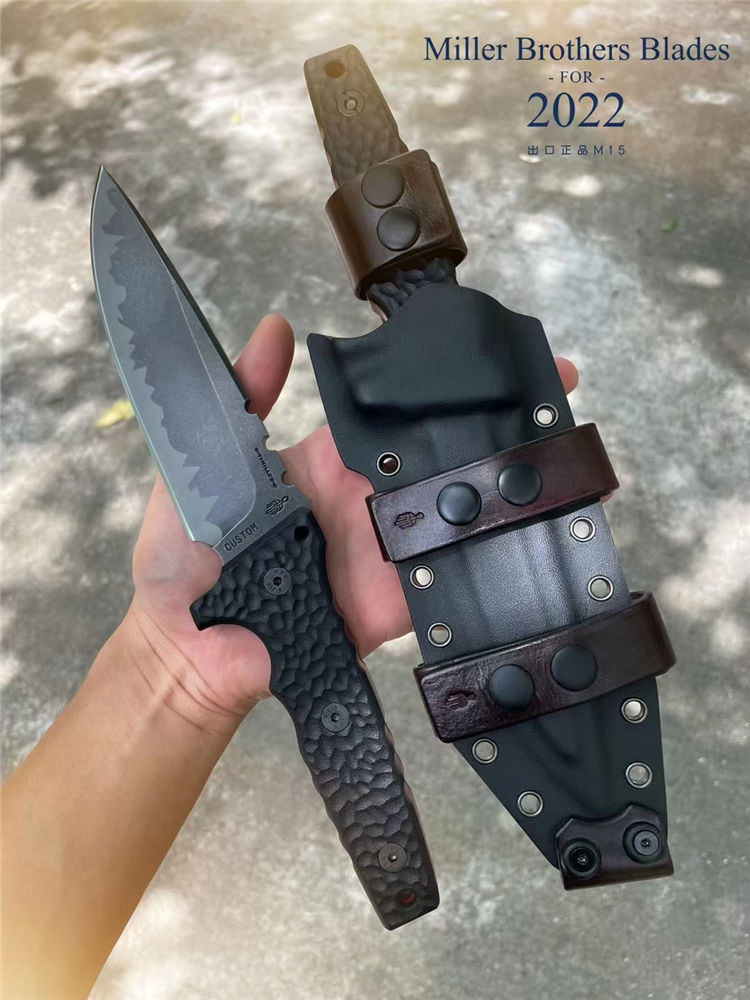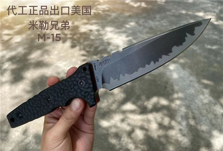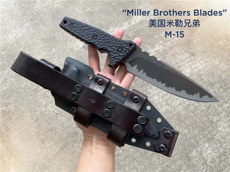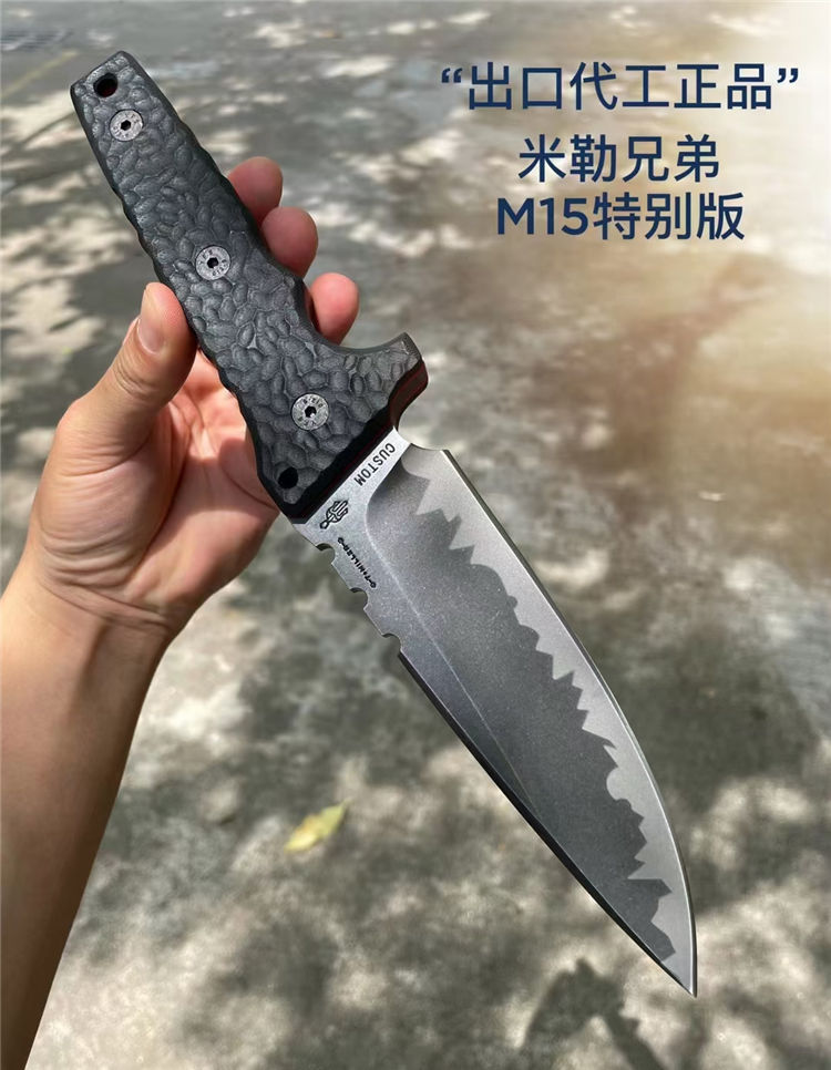 米勒兄弟M-15特别版直刀 型号:Custom M-15合作量产款 总长:29.2cm 刃长:14cm 厚度:7.1MM 刃宽:4.3cm 钢材:Z-Wear PM Steel 硬度:60-62HRC 热处理:专业真空深冷让处理油淬 柄材:G-10表面蜂窝设计 效果:迷彩石洗钢印LOGO 刀鞘:进口2.5厚K鞘+进口意大利手工制作植鞣皮 包装:黑色手工盒子(合作代工出口版简包)
