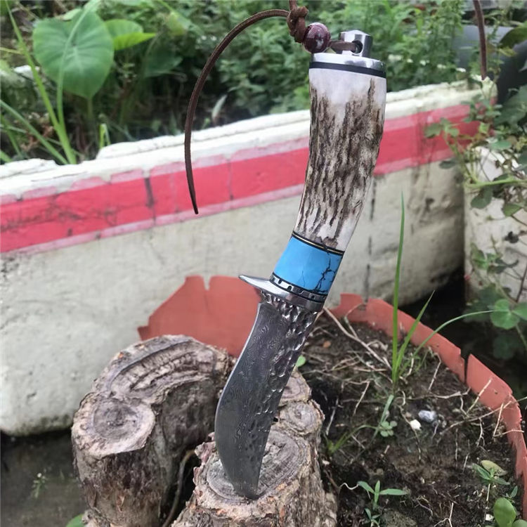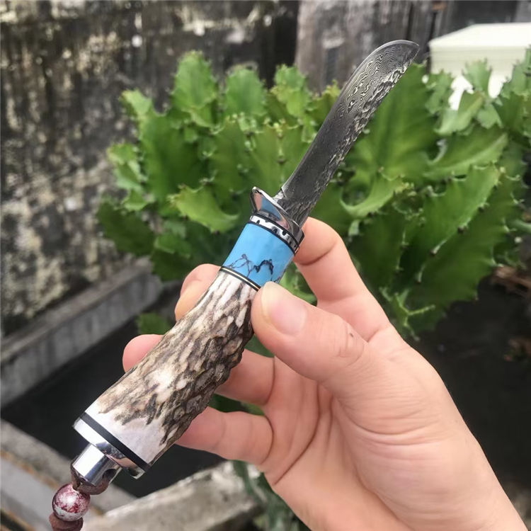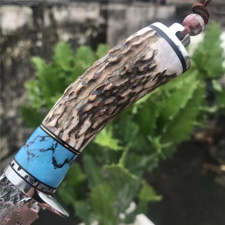 大马士革蓝月亮直刀 全长:18.5cm 刃长: 8.9cm 柄长: 9.6cm 刃宽:2.3cm (最宽处) 刃厚:0.35cm 硬度:59-60HRC 重量: 约180克(含包装) 表面:锻打大马士革雨滴祥云纹原色 刃材:Vg10大马士革钢 柄材:天然鹿角+蓝松石+不锈钢 配送:高档手工皮套+精美礼品盒+牛皮绳+彩珠子