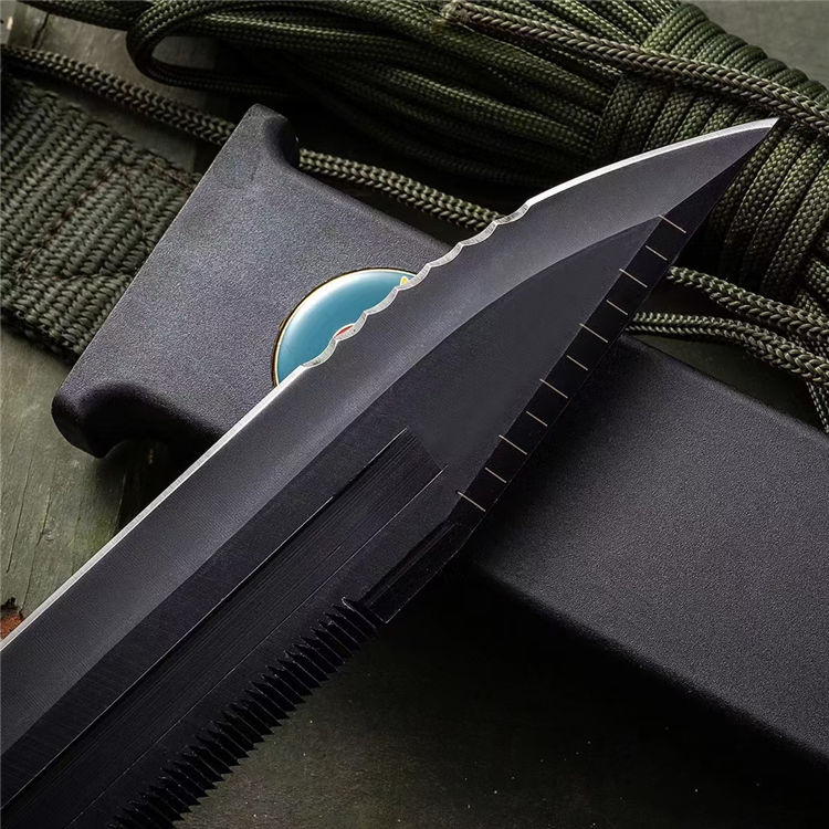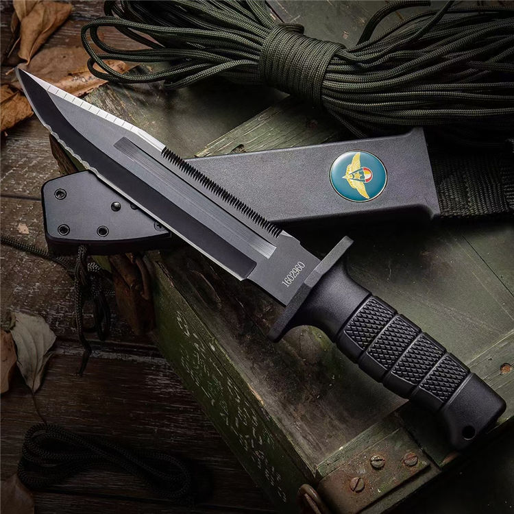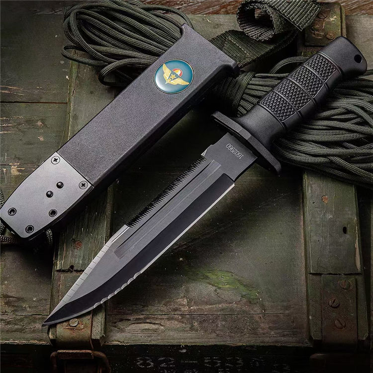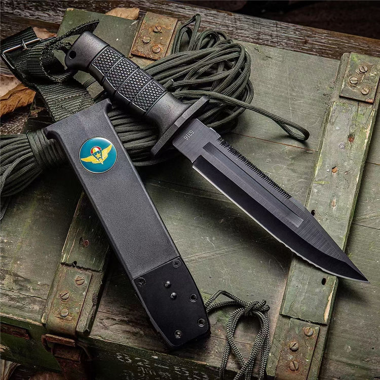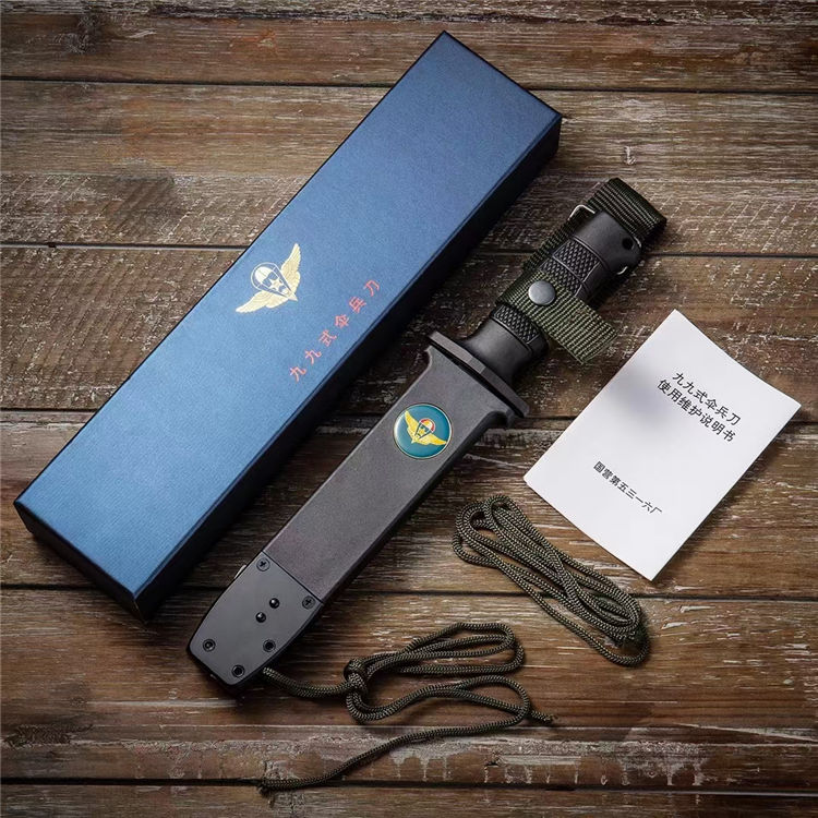 刀体为锋利的单面刃口,能快速割断降落伞伞绳和其它绳索。刀背有一段坚利锯齿,能锯断f飞机铝壳体和电缆。刀体刻有血槽,刺入敌人身体后,能顺利拔出,同时使刀体重量降低至320克,并增强了刀体的刚度,提高抗弯抗扭能力。刀体材料为高强度防酸高碳不锈钢。为防止刀体反光,提高隐蔽性,表面经喷砂处理使之呈暗灰色。
