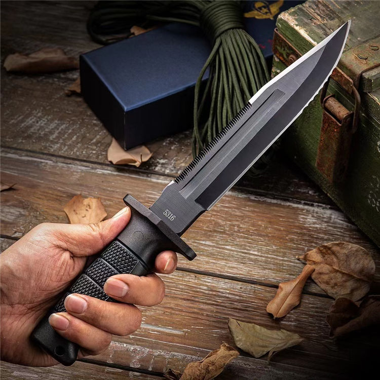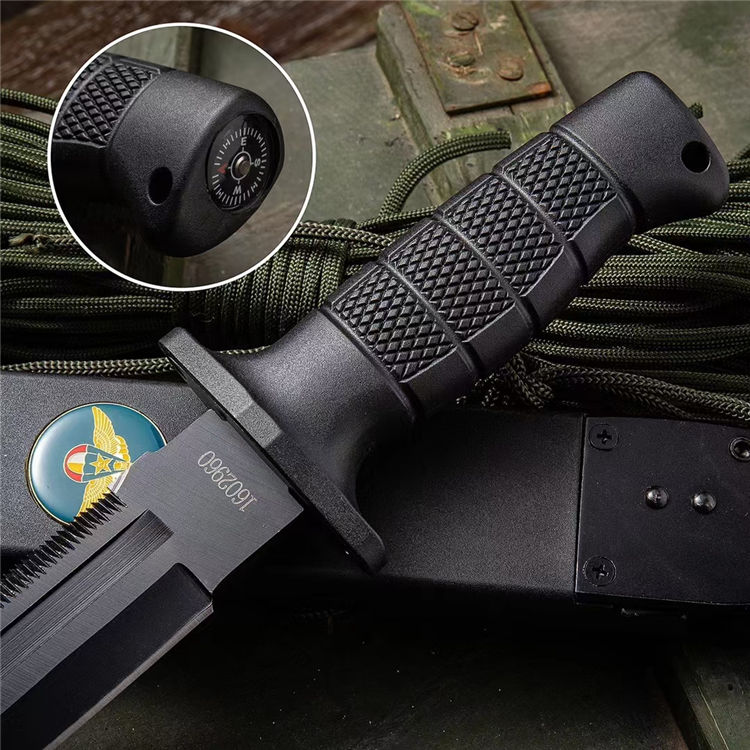 刀柄表面刻有网纹和环形槽,不但握持舒适,手感好,而且防滑、绝缘性能好。横截面为实心椭圆形,前段设有横挡护手,护手上有孔。尾部有小型防震指北|针和保险绳。刀柄材料选用黑色高强度工程塑料制成,具有比重轻,强度高,塑性好,耐冲击,耐高低温,耐腐蚀,耐老化等优点。
