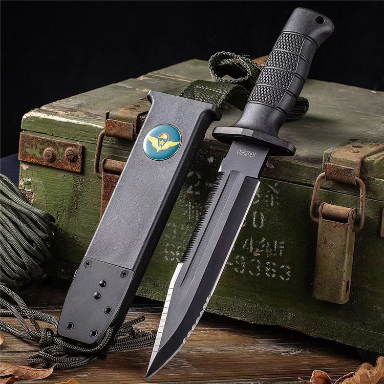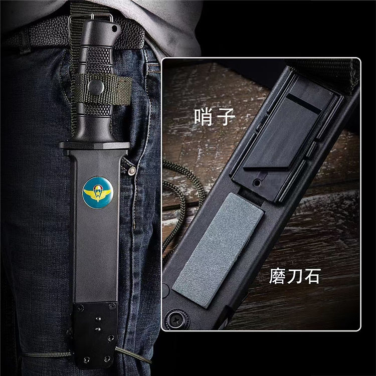 刀鞘用黑色高强度工程塑料制成,内有贴片,保证刀体不会晃动和自动掉落。前部设有泄物孔并系有捆绑绳,平时缠绕在刀鞘上,用时解开绑在腿上将伞刀固定牢靠,也可用绳索将伞刀绑在长杆或树枝上,作为长矛使用。刀鞘背面则镶有磨刀石和联络用哨子,并用织物制作的盖片加以保护。下端有一钢制镶件,装有螺丝刀、开瓶器和开罐头刀。刀鞘挂带用锦纶编织带制作,有金属扣环,能和伞兵携行具配套携带,很方便地从使用者身上将刀鞘取下或装上。为佩带更保险,还使用了尼龙搭扣,保证跳伞时不会脱离。刀鞘虽然配件多,但重量只有230克