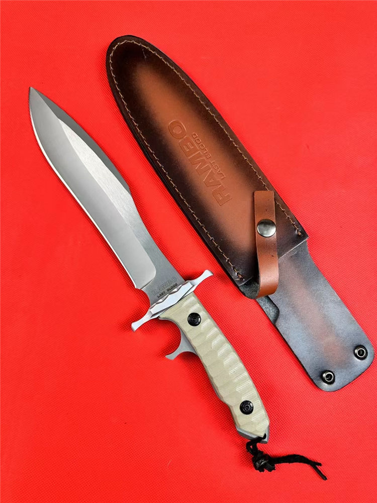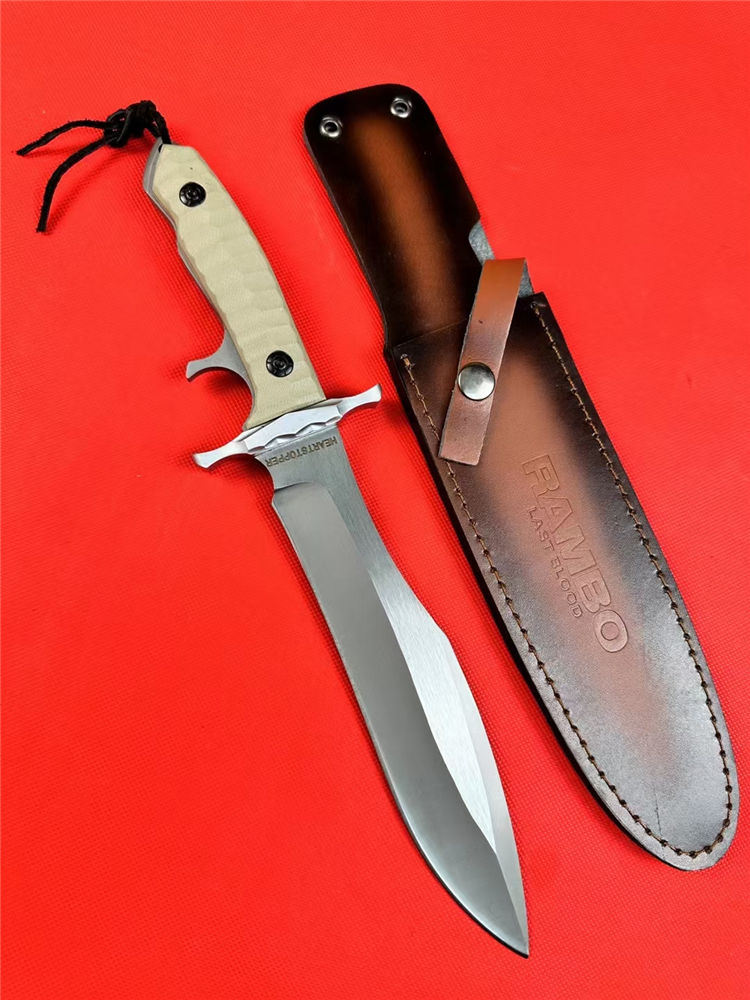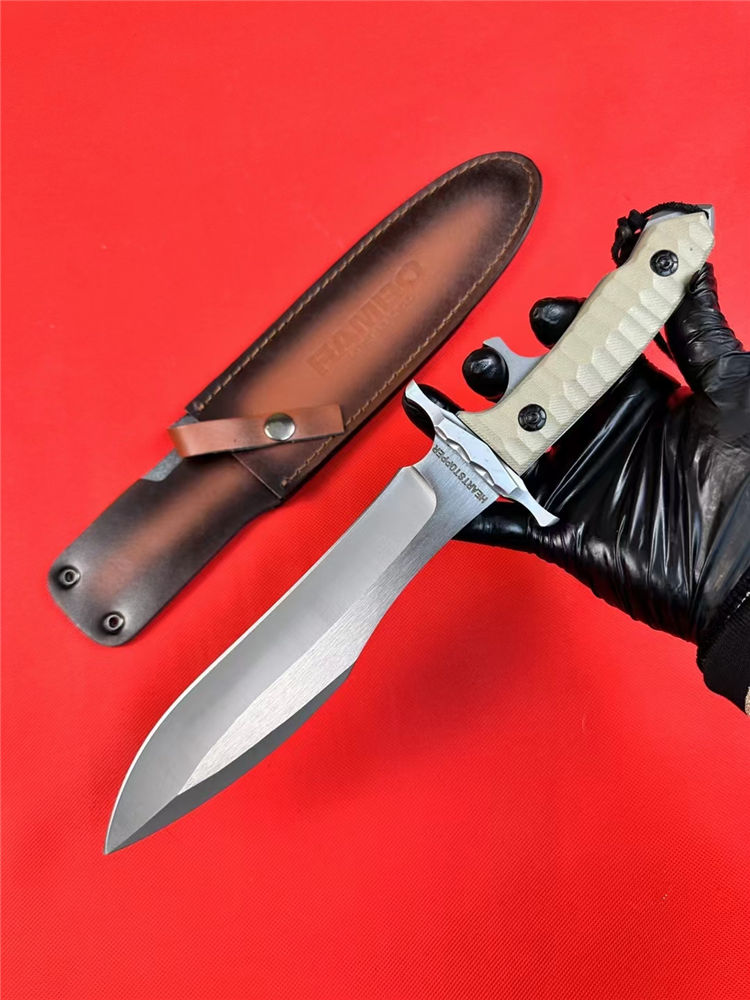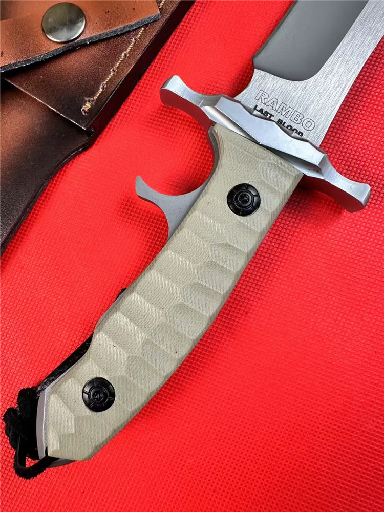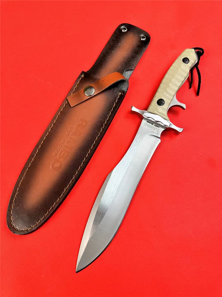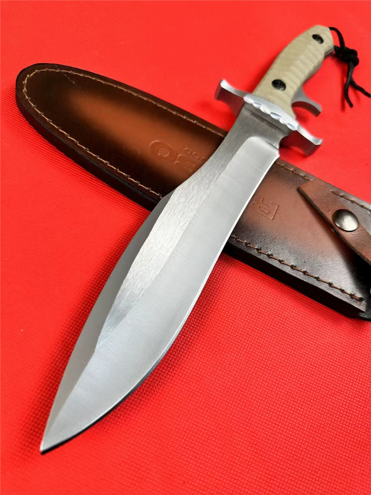 普通版史泰龙MK9直刀 总长:33.5cm 刃长:21cm 刃宽:4cm 刃厚:0.6cm 刃材:9Cr18Mov 柄材:G10+铝合金护手 柄长:12.5cm 柄宽:4.5cm 柄厚:2.5cm 净重:600G含刀鞘 鞘材:牛皮刀鞘