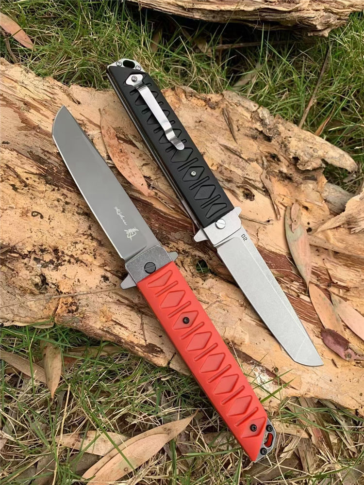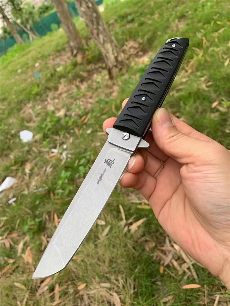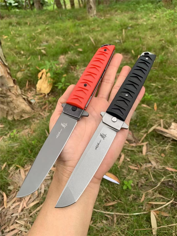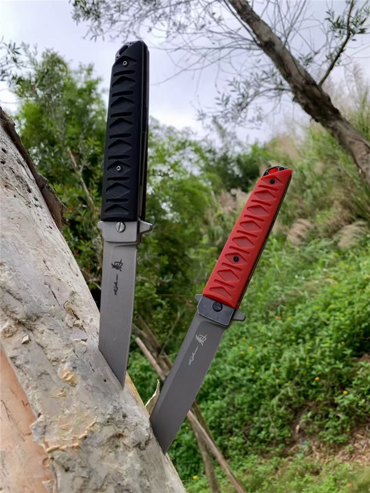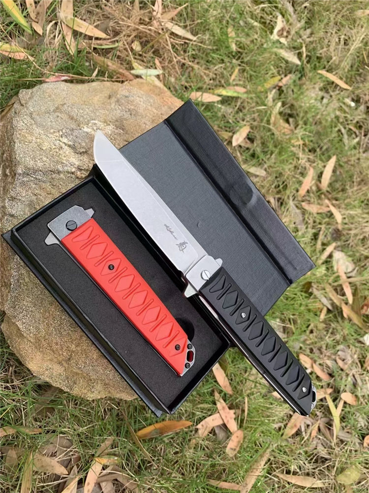 松田菊男武士折刀 全长:25cm 刃长:10.5cm 柄长:14.5cm 刃宽:2.5cm(最宽处) 刃厚:4mm 硬度:58-60HRC 刃材:D2 手柄:尼龙纤维+钢 结构:轴承 表面:石洗/镀钛 重量:169g/237g(含包装) 包装:黑盒GT-JN