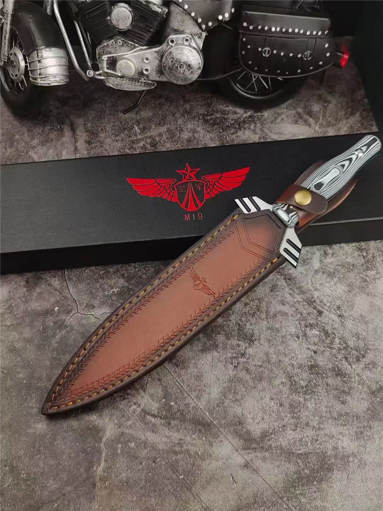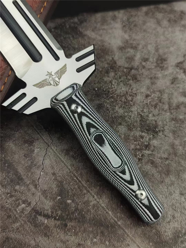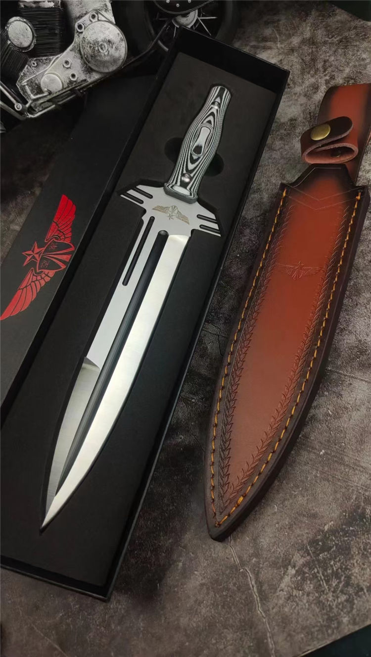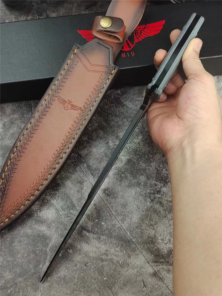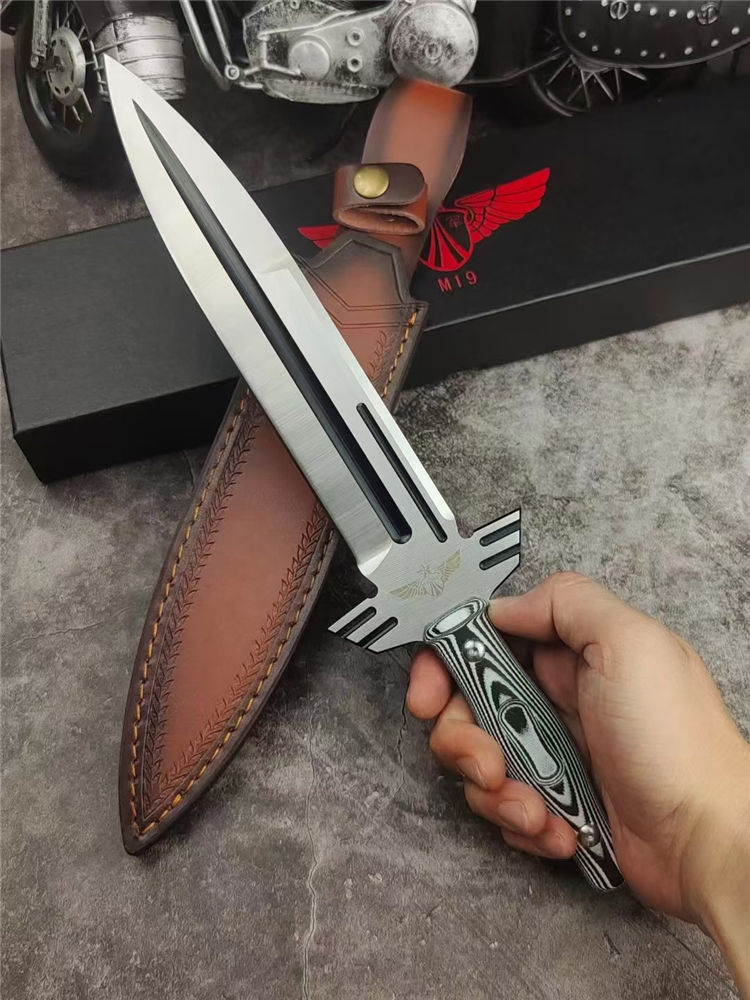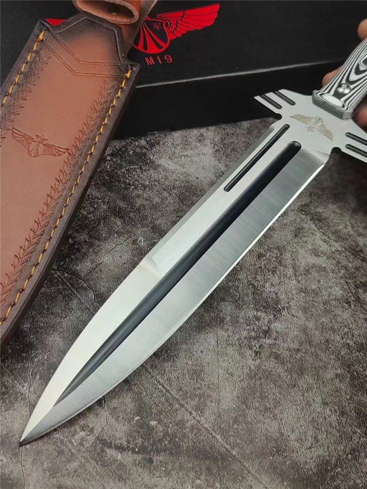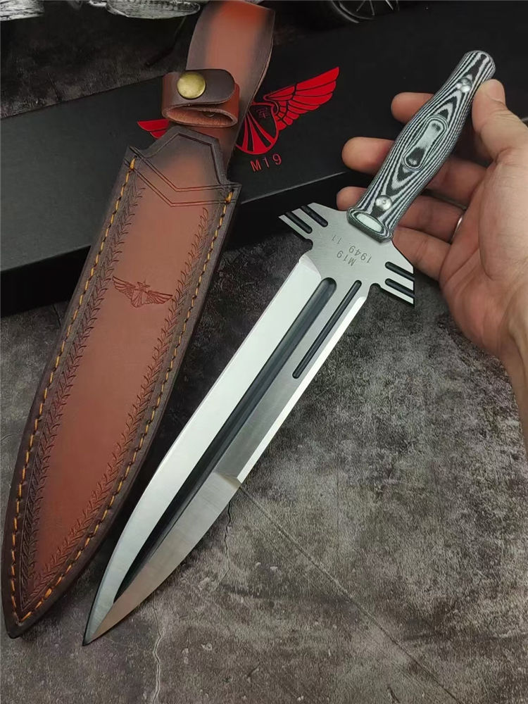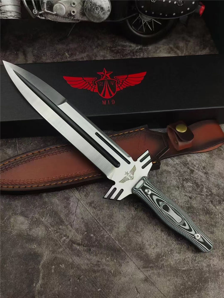 空军M19直刀 总长:36cm 刃长:22cm 手柄:11.5cm 厚度:5.8mm 刃宽:4.0cm 最宽处表面:数控水磨+拉丝砂光 刃材:DC53特种高碳钢 热处理:真空深冷热处理二次淬火 硬度:60+HRC 柄材:米克塔 结构:一体龙骨贯穿 包装:精美雕刻牛皮刀套+黑色礼盒