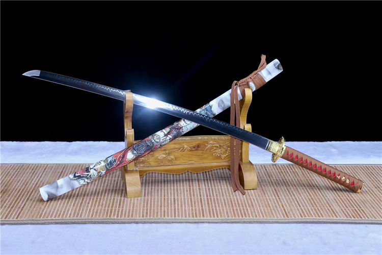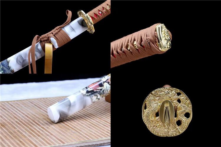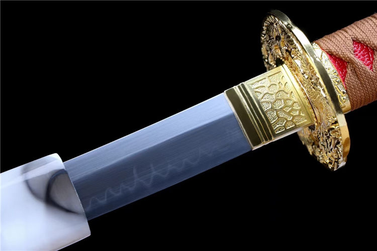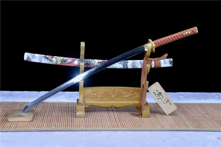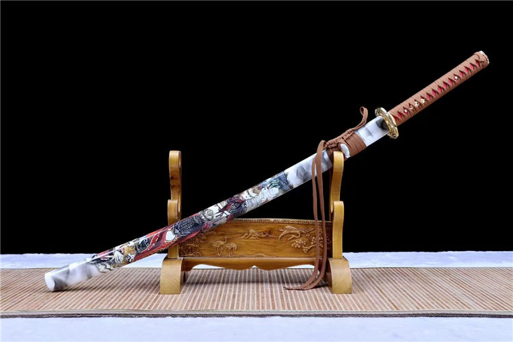 孙悟空武士刀 刃材:高硬度T10手工锻造、古法敷土烧刃、纯手工研磨工艺 装具:锌合金镀金 鞘材:实木上漆贴斗战胜佛图《值得收藏》 适合:收藏 防身 情侣配送 乔迁送礼 武术健身 精美摆设 赠品:精美锦盒、护理油 性能:锋利度极高、轻松横扫一排水、硬度杠杠的、秒斩草席 工艺:刀身千锤百炼、经打胚、热锻、铲、锉、磨、热处理(淬火)回火、初修、精修、等龙泉古法数十道手工制作而成. 刃材可换 高锰钢烤蓝研磨、高锰钢发黑研磨、羽毛纹、灵芝纹等价位不一
