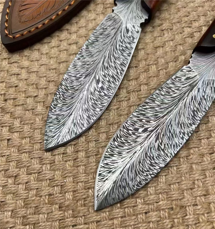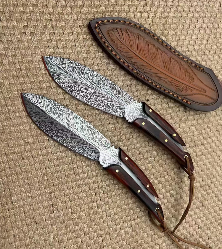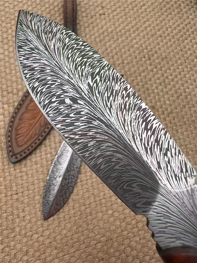 进口锻造一体龙骨羽毛纹钢,花纹触手可及真材实料,表面腐蚀处理。采用4mm原料厚钢板,真空回火热处理,手工二次开锋,剃毛削纸绝对飞快,锋利度无疑担心,柄部搭配进口微粒黄檀木,一木一柄手工研磨细腻,做工完美非常不错,皮套: 纯手工制作雕花擦色工艺“七彩羽毛”图案,复古刀套,精致高端收藏版
