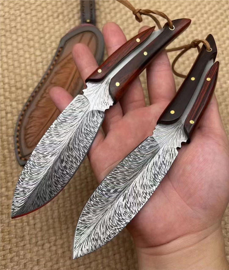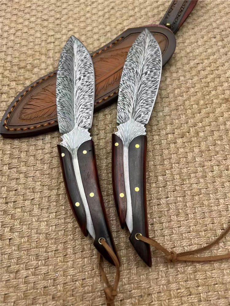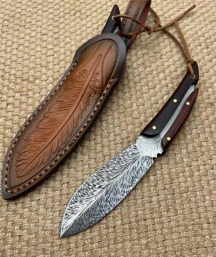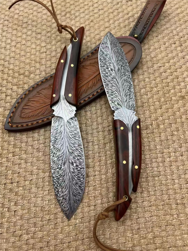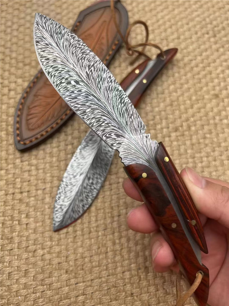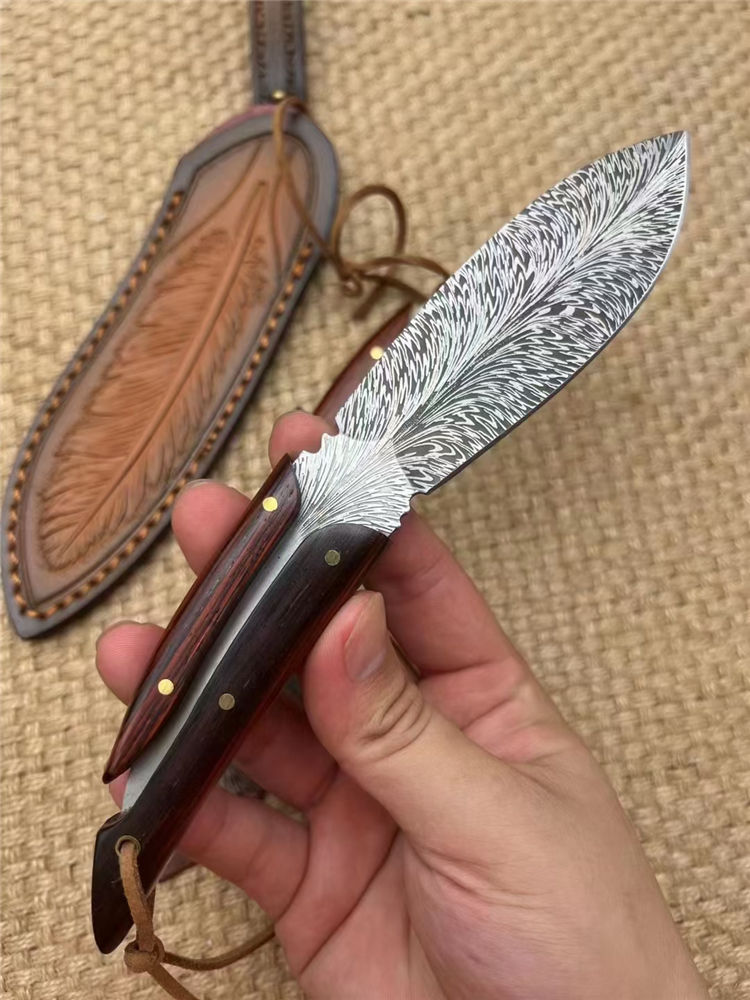 腐蚀灵羽直刀 全长:20cm 刃长:11cm 手柄:9cm 厚度:龙骨4MM 刃宽:3.5cm 钢材:D2 硬度:61HRC 柄材:进口黄檀木 包装:礼品盒+羽毛皮套 进口锻造一体龙骨羽毛纹钢,花纹触手可及真材实料,表面腐蚀处理。采用4mm原料厚钢板,真空回火热处理,手工二次开锋,剃毛削纸绝对飞快,锋利度无疑担心,柄部搭配进口微粒黄檀木,一木一柄手工研磨细腻,做工完美非常不错,皮套: 纯手工制作雕花擦色工艺“七彩羽毛”图案,复古刀套,精致高端收藏版