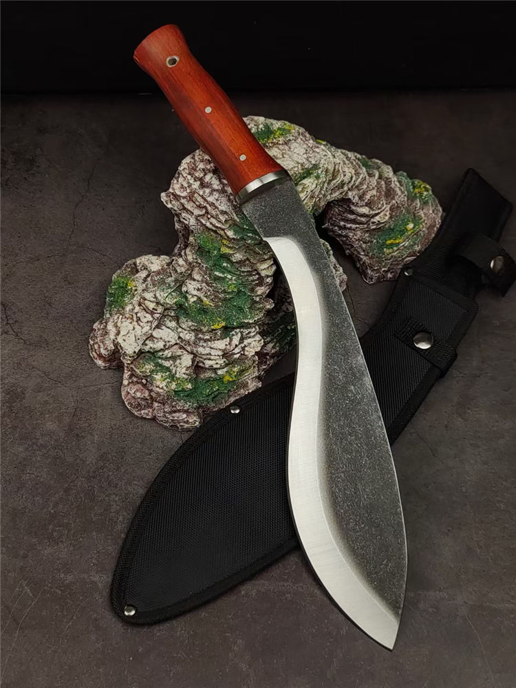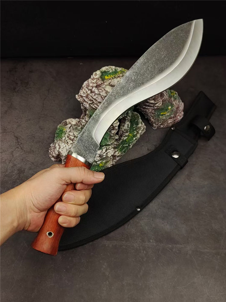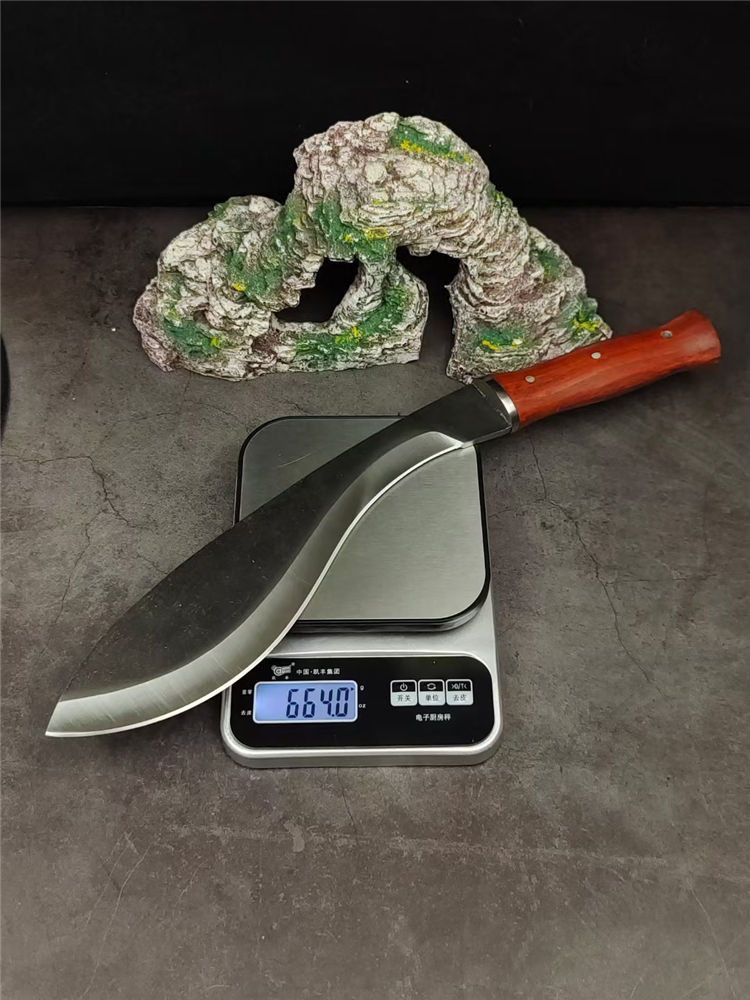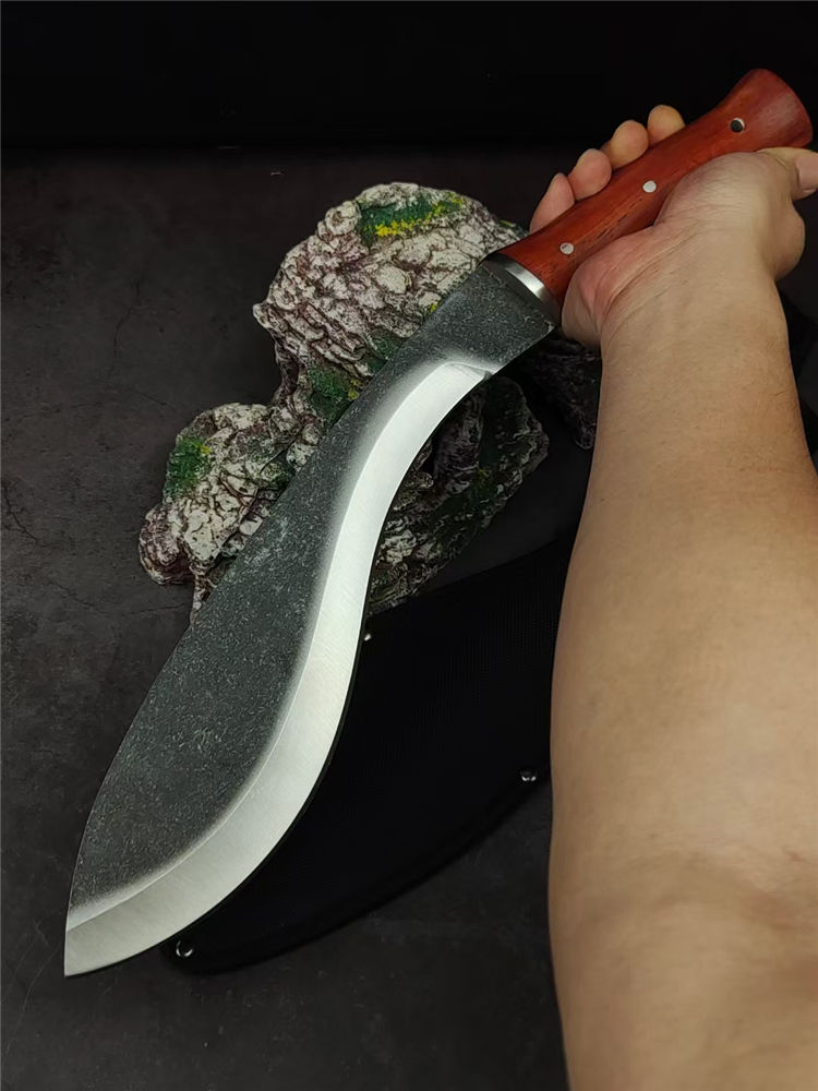 黑山锻打尼泊尔弯刀 全长:50CM 刃长:30CM 柄长:15.5CM 刃厚:5.5CM 刃宽:4.2CM 钢材:混合高碳钢锻打 硬度:59HRC 柄材:红酸枝 表面:锻打黑+砂光 重量:752克含套 配套:尼龙套