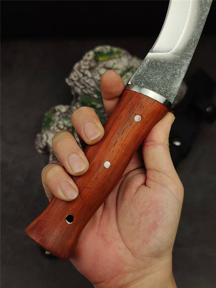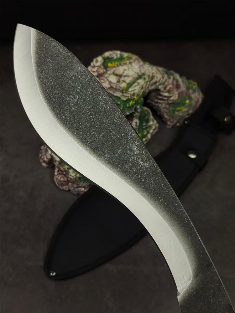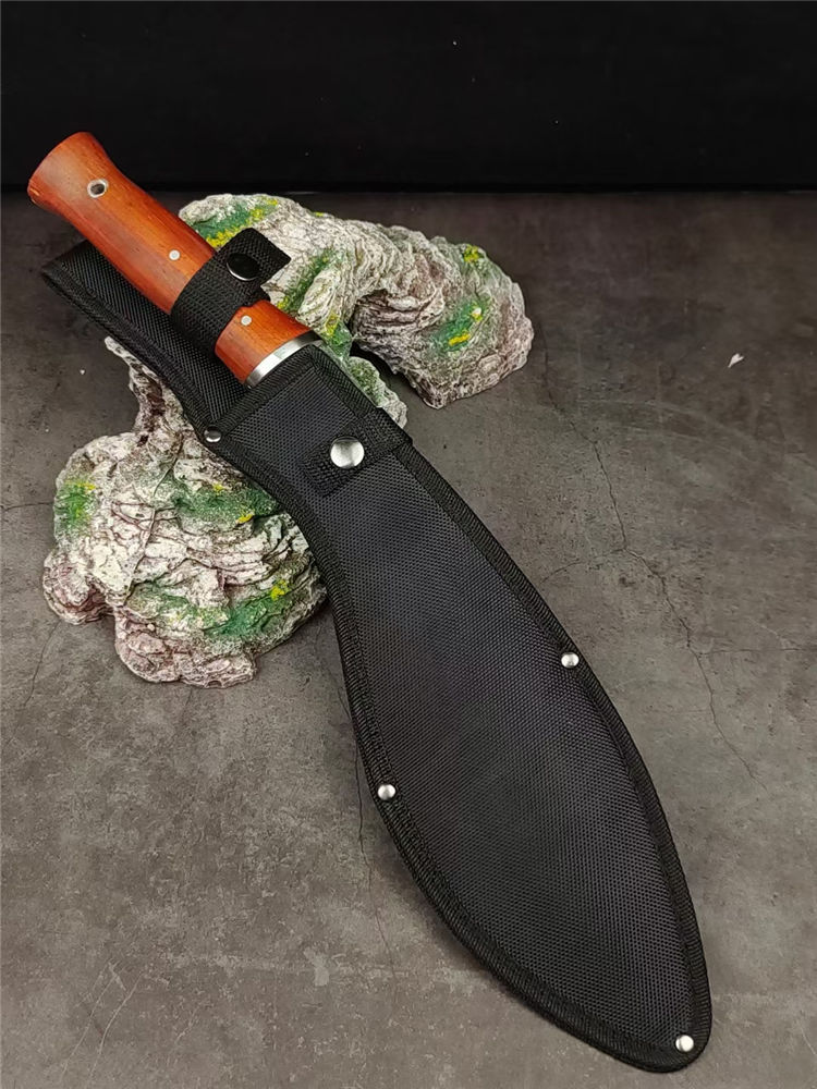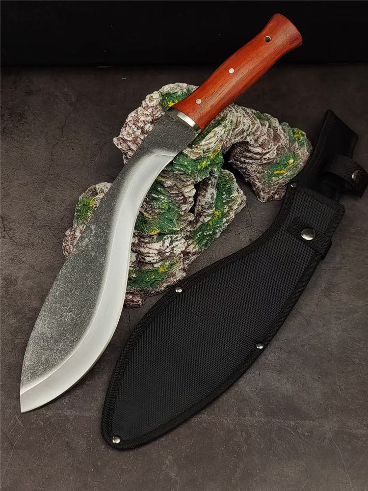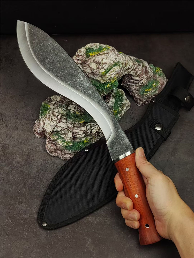 黑山锻打尼泊尔弯刀 全长:50CM 刃长:30CM 柄长:15.5CM 刃厚:5.5CM 刃宽:4.2CM 钢材:混合高碳钢锻打 硬度:59HRC 柄材:红酸枝 表面:锻打黑+砂光 重量:752克含套 配套:尼龙套