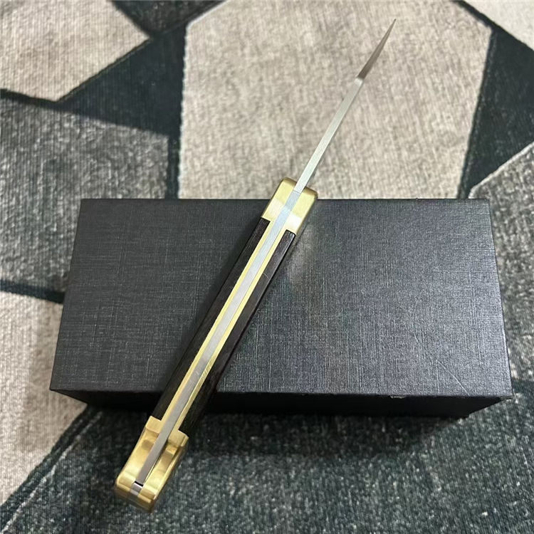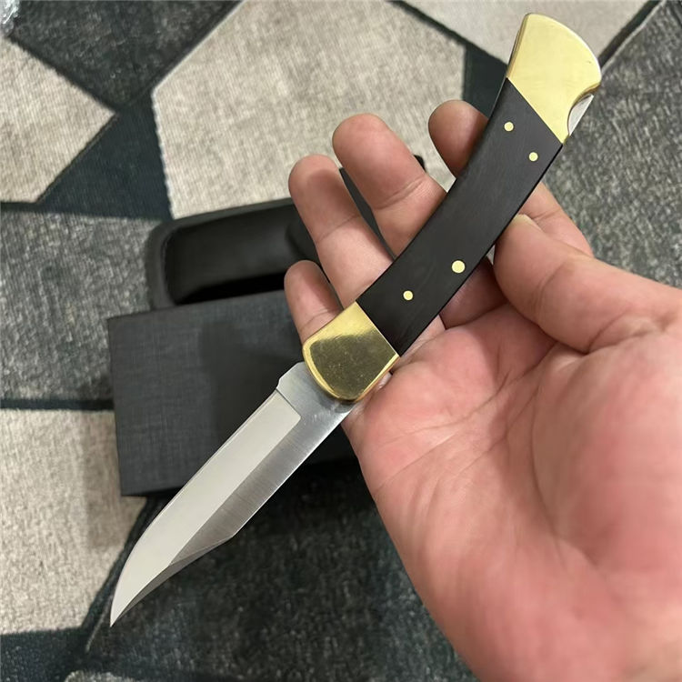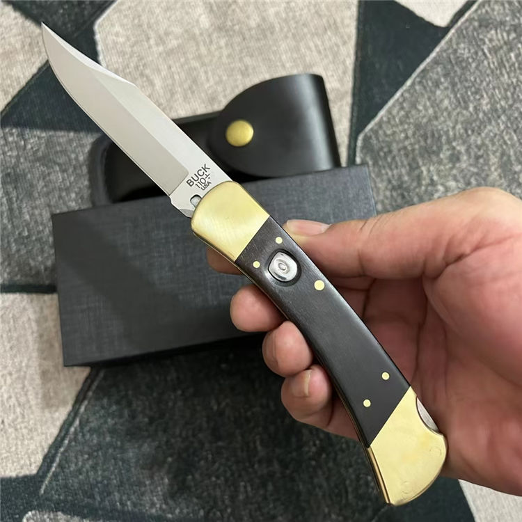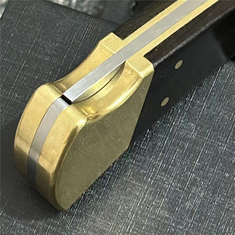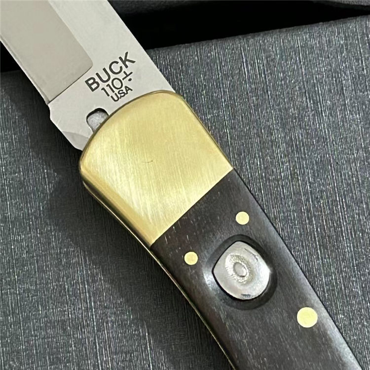 巴克110半自动跳刀 全长:22cm 刃长:9.5cm 刃材:440C 刃厚:0.3cm 硬度:58(实测硬度) 手柄:一体黄铜+黑酸枝实木(铜铆钉凸出,有效防滑) 重量:280克