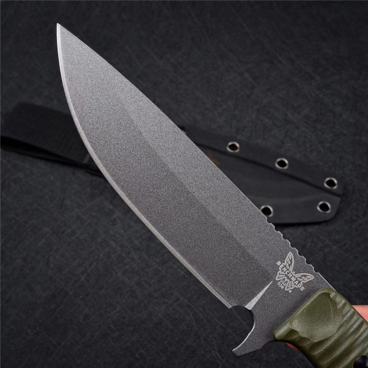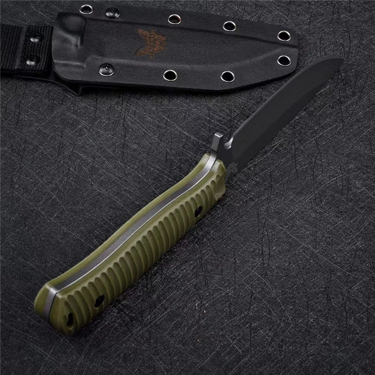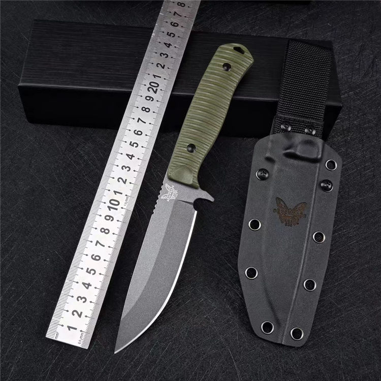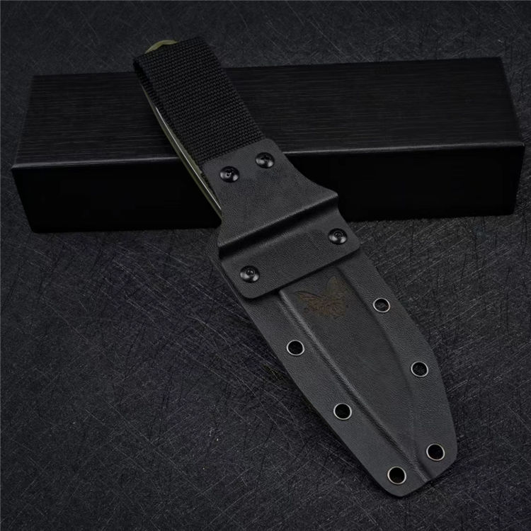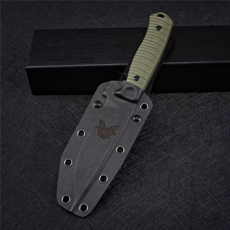 复刻版蝴蝶539GY直刀 全长:250mm 刃长:112mm 柄长:123mm 刃厚:4.2mm 刃宽:31mm 刀重:238g 毛重:434g 钢材:DC53钢 柄材:绿色G10 硬度:60-61HRC 表面处理:新工艺镀钛(不掉色) 刀鞘:Kydex鞘 包装:礼盒