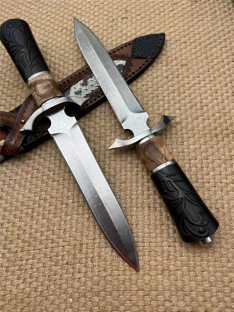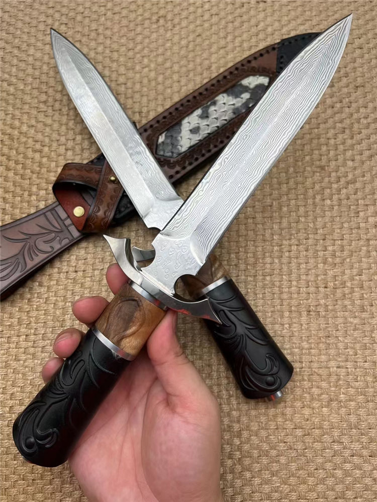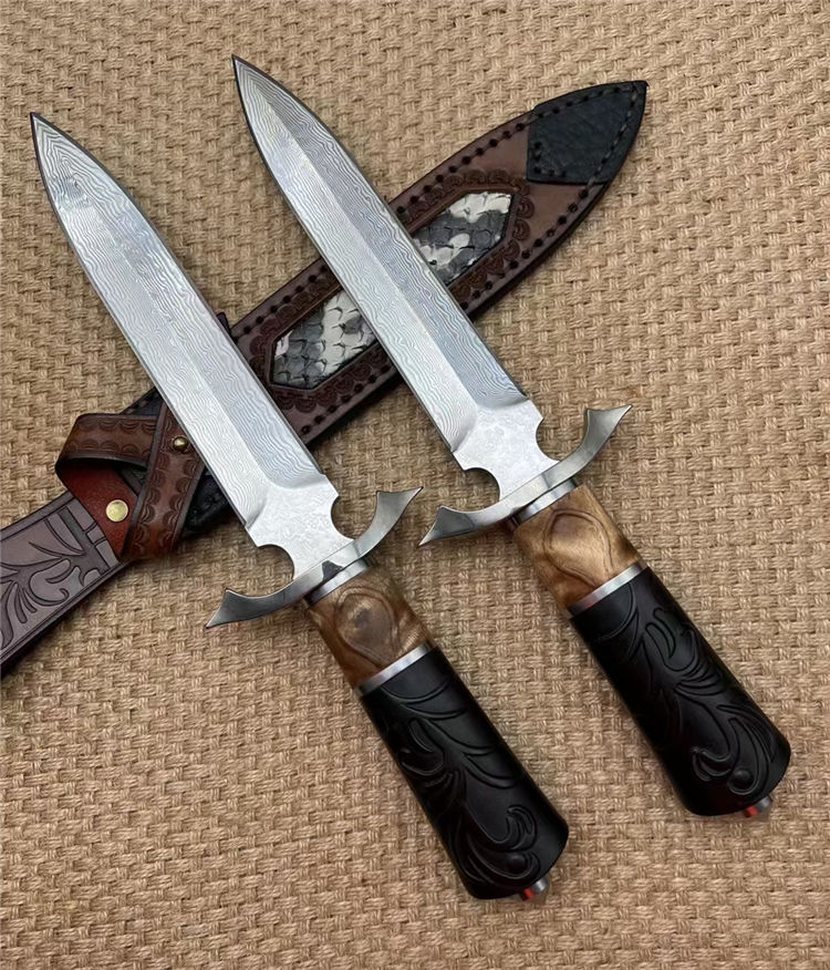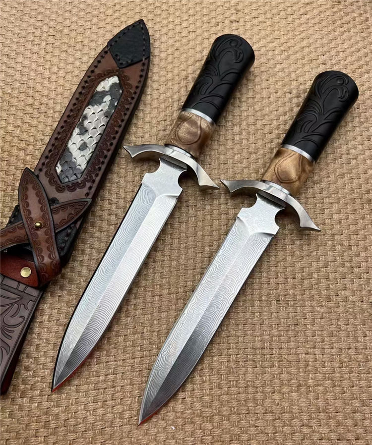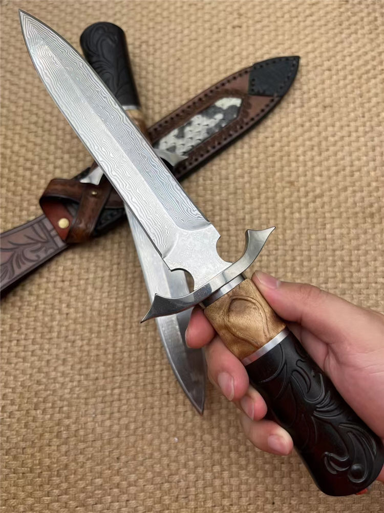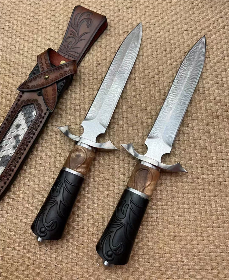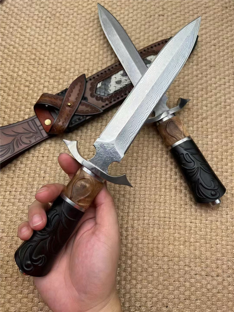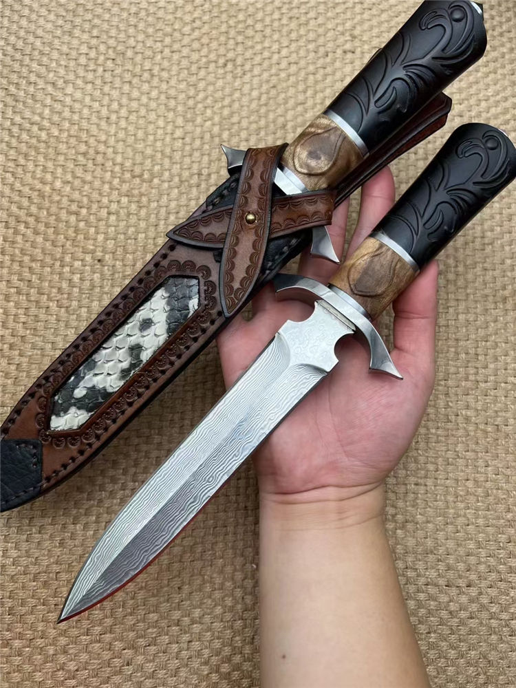 大马士革罗曼神剑直刀 总长:31cm 刃长:18.5cm 手柄:11.5cm 厚度:4mm 刃宽:3.2cm 钢材:进口锻造大马士革钢(乌波纹) 硬度:60-61HRC 皮套:意大利进口植鞣皮纯手工雕花镶嵌蛇皮 热处理:真空深冷高温热处理 柄材:304不锈钢头+进口影木+黑檀木 包装:高端手工木盒+皮套