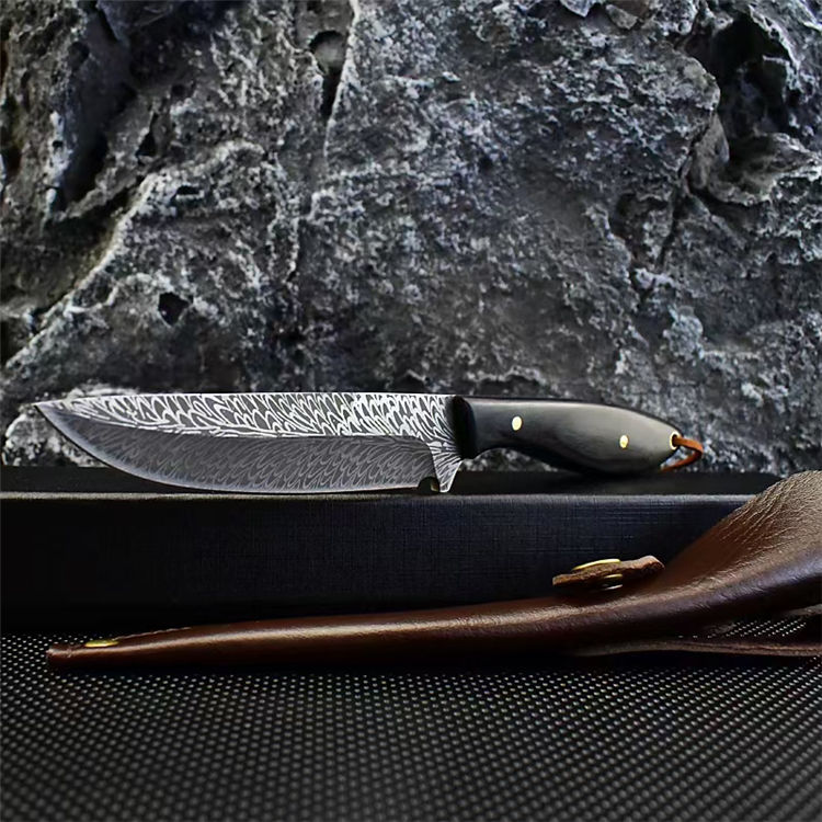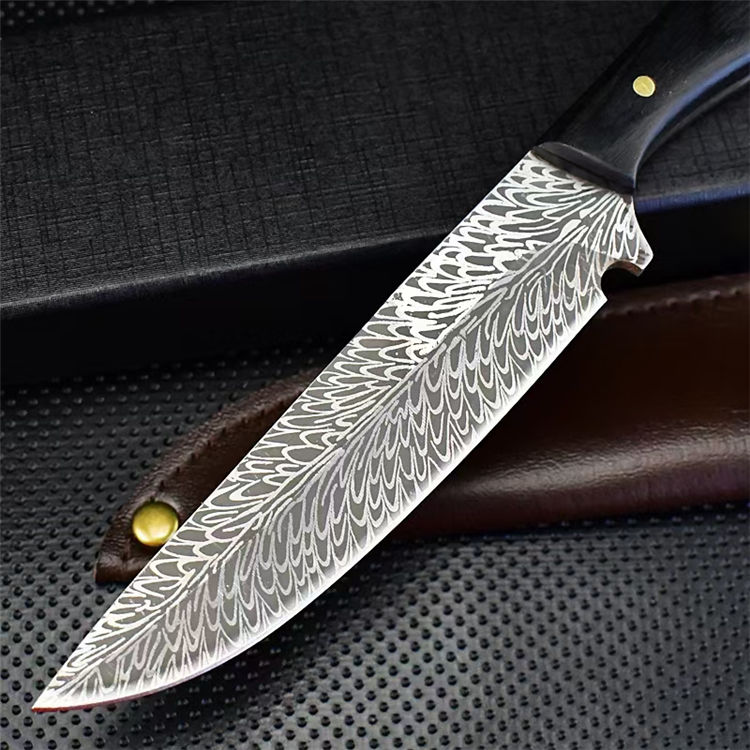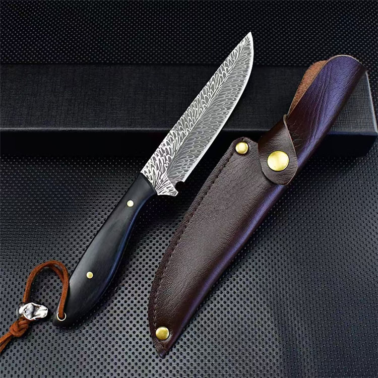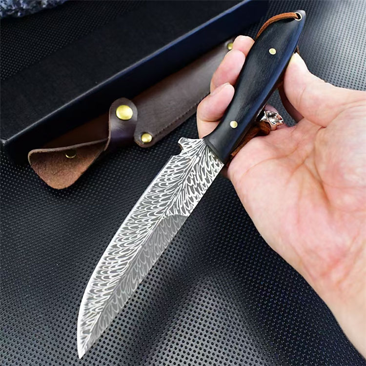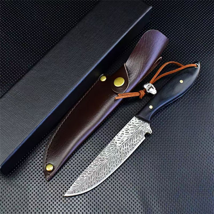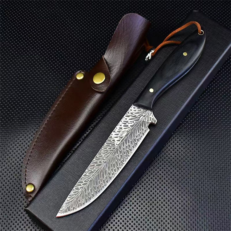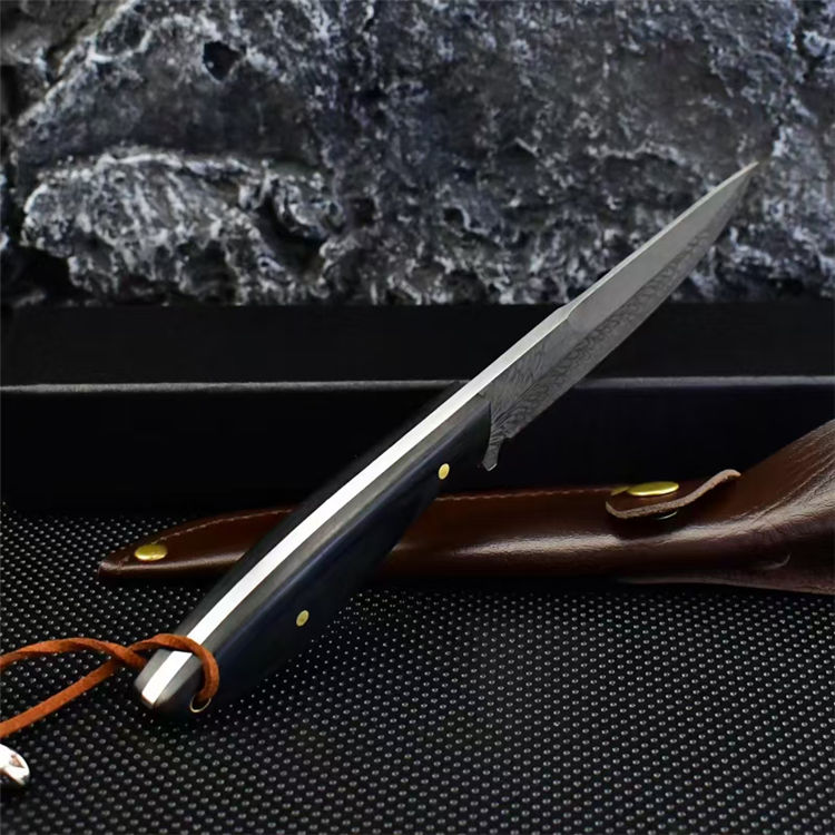 黑羽直刀 全长:21.7CM 柄长:10.2CM 刃长:11.5CM 钢材:9CR18MOV 硬度:60HRC 刃厚:4MM 结构:一体龙骨 柄材:黑彩木 重量:约122克 其他:皮套,礼盒,挂绳