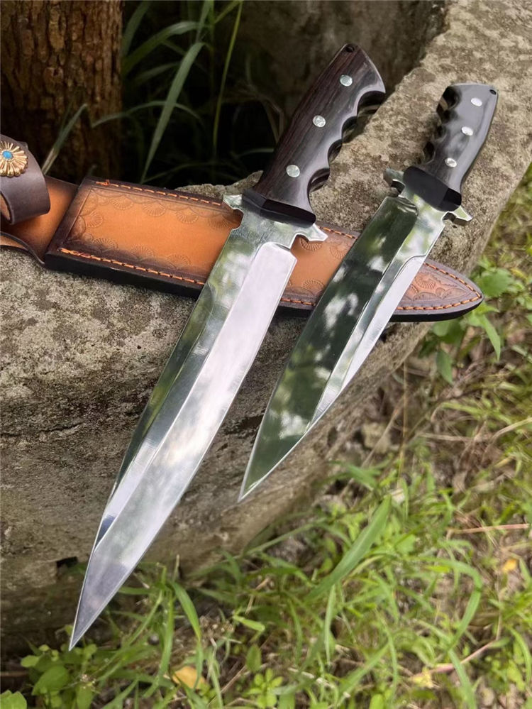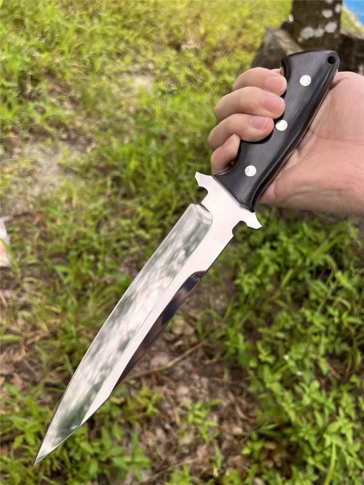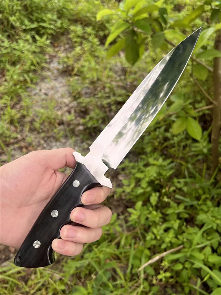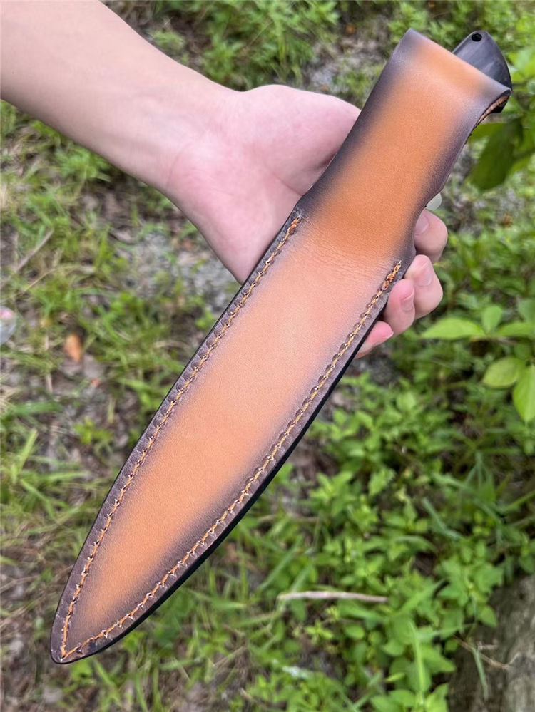 凤凰AUS-8直刀 总长:31cm 刃长:18cm 手柄:13cm 刃宽:3.6cm 厚度:4.5mm 材质:AUS-8钢 硬度:59-60HRC 柄材:黑檀木 皮套:进口植鞣革皮复古效果 包装:黑色盒 一体钢制作、数量不多,优惠性价比高,进口AUS-8高性能一体钢,表面镜面处理、高硬度真空热处理,黑檀木手柄握感超好的一款凤凰