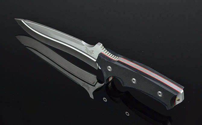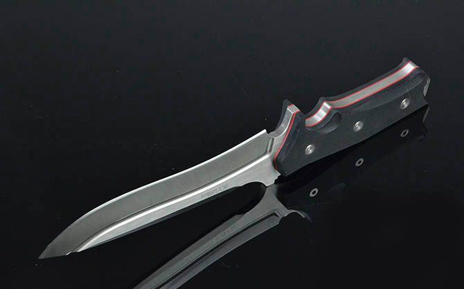 蝴蝶—半步颠刺客战刀 全 长:29cm 刃 长:16cm 刃 宽:4.5cm(最宽处) 刃 厚:5.8mm 柄 长:13cm 表 面: 砂光+拉丝 刃 材: 9Cr18Mov 硬 度: 57HRC 柄 材: G10 重 量:473克(含包装) 包 装:皮套