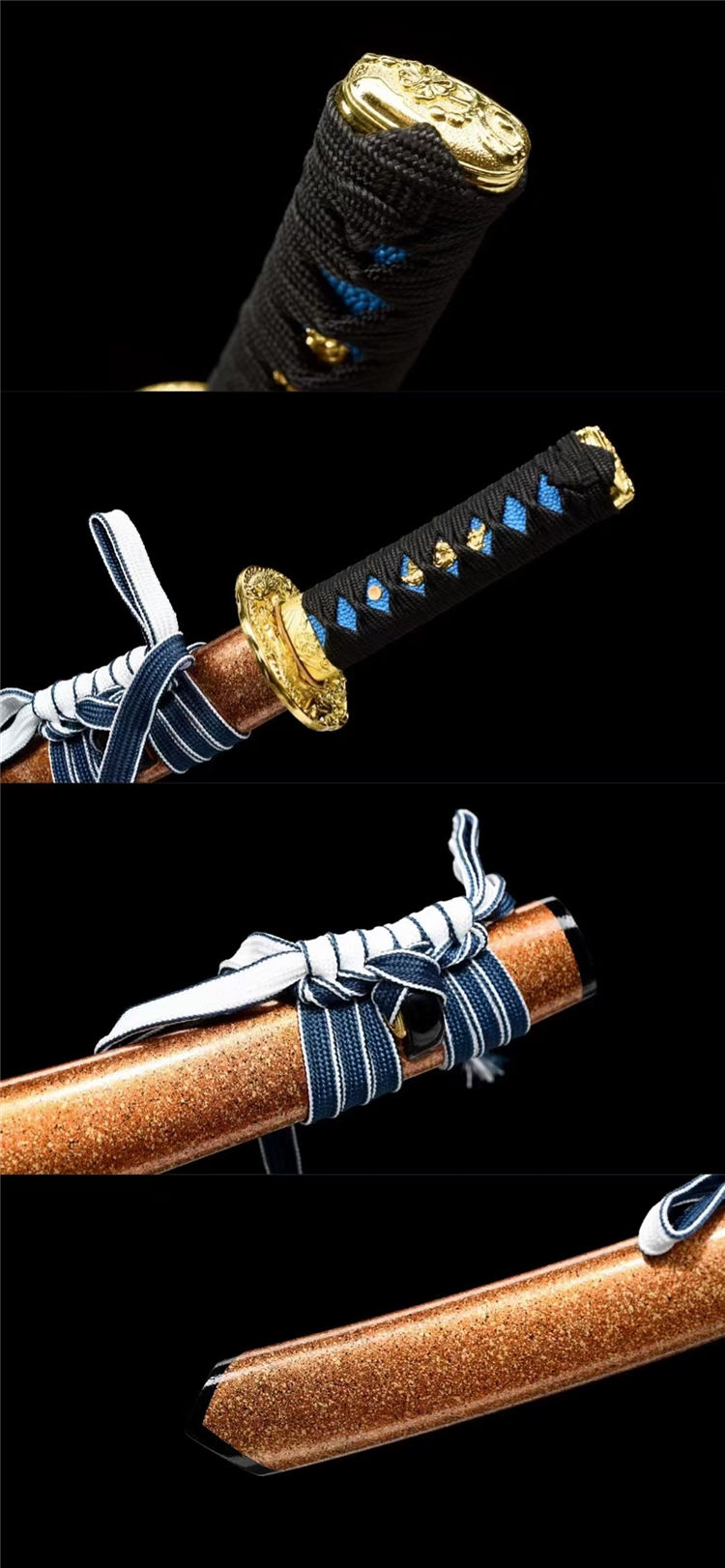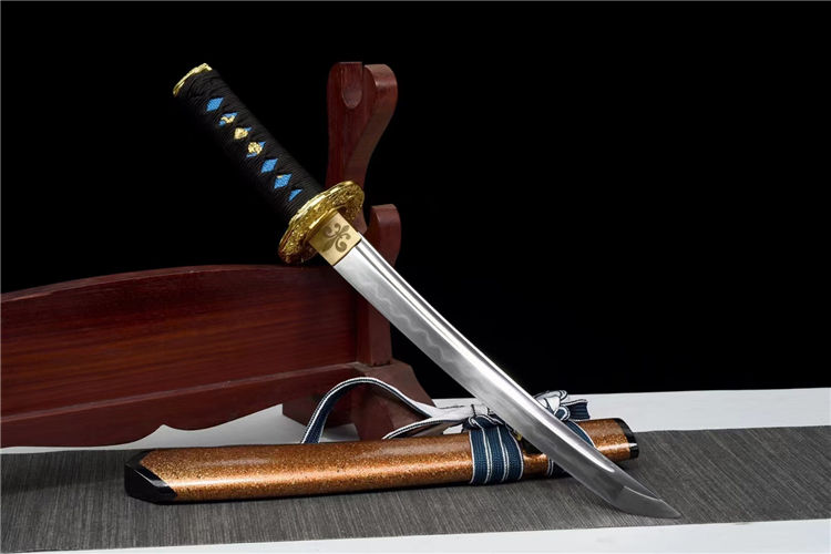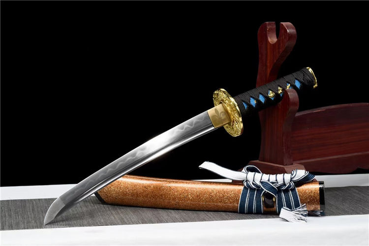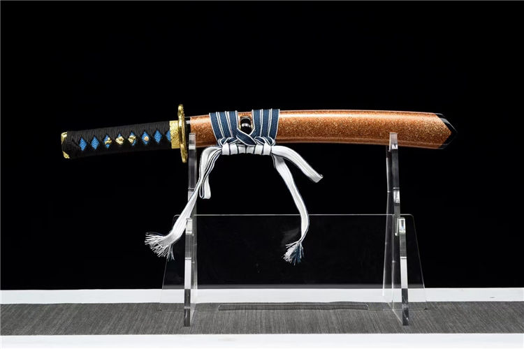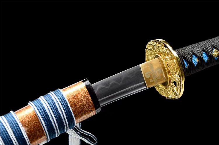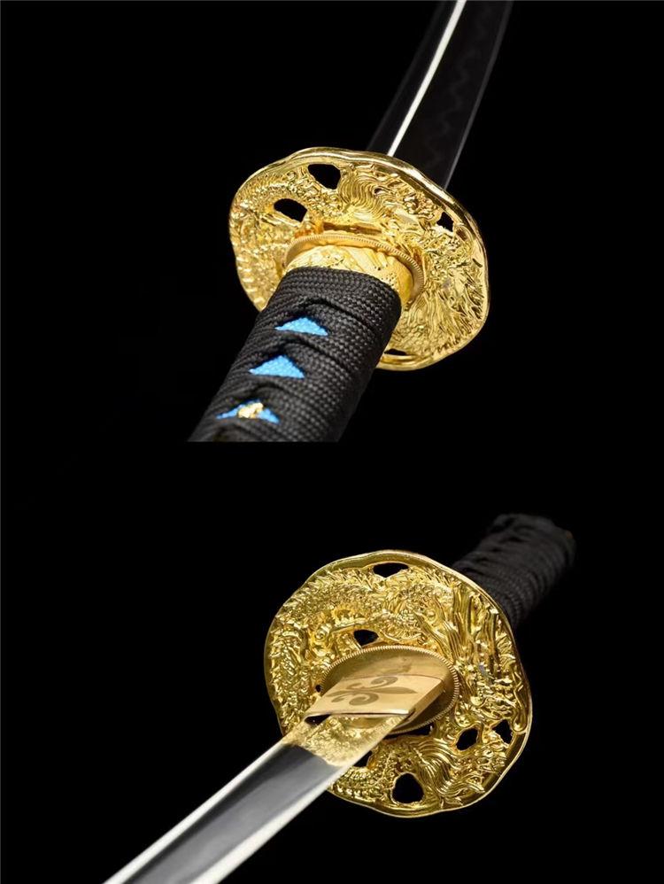 避尘武士刀 刃材:高硬度T10钢手工锻打、血槽设计、纯手工精细研磨工艺 装具:锌合金镀金镂空雕刻金龙刀镡、纯铜雕花刀镞,纯铜切羽 鞘材:实木上漆大头鞘《值得收藏》 柄材:重蚁木缠绕精美添丝绳《防滑设计》 适合:收藏 防身 情侣配送 乔迁送礼 武术健身 精美摆设 赠品:精美锦盒、护理油 性能:锋利、劈竹、削A4 无压力、韧性极佳 工艺:刀身千锤百炼、经打胚、热锻、铲、锉、磨、热处理(淬火)回火、初修、精修、等龙泉古法数十道手工制作而成