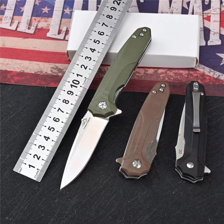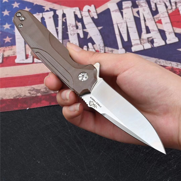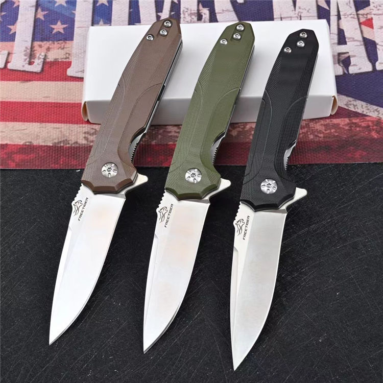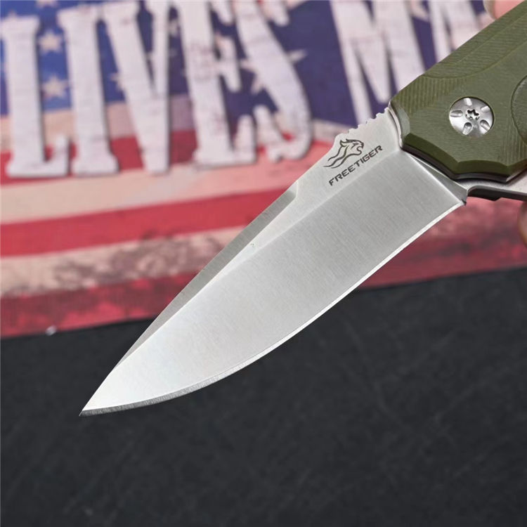 代工正品FREETIGER高端折刀 总长:180mm 刃长:76mm 刀刃: D2 硬度: 60º 刃厚:3.0mm 表面:砂光 内衬:2.0mm不锈钢减重内片 手柄:黑色G10,绿色G10,泥色G10 重量:91g