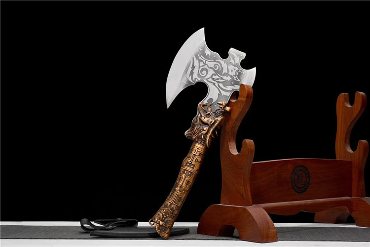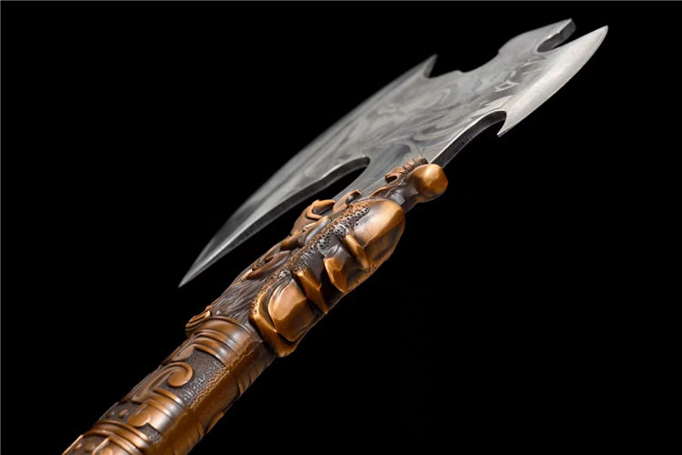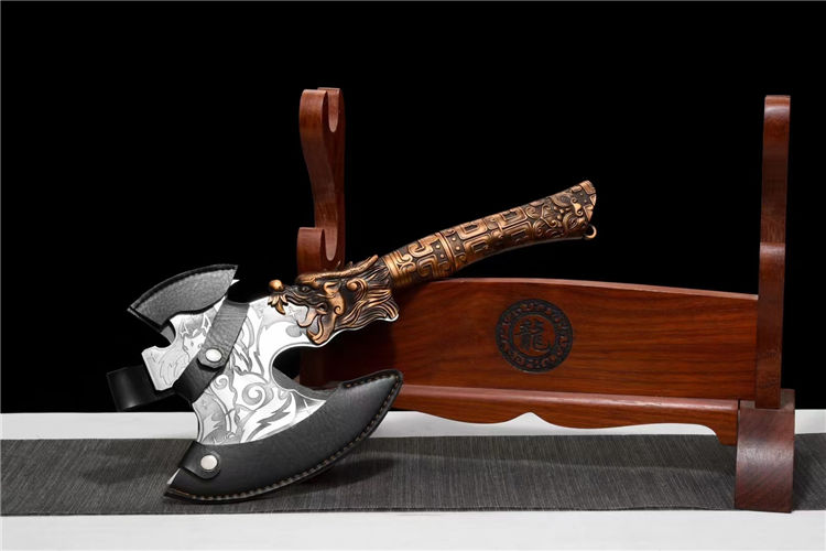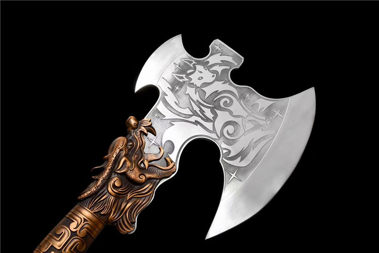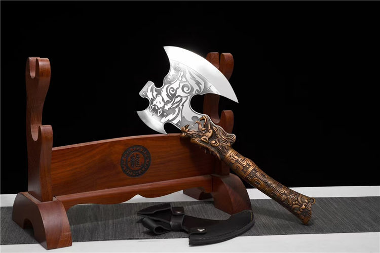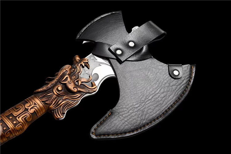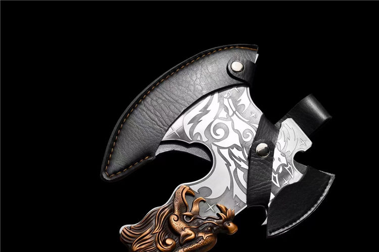 火狐战斧 全长:37.5cm 韧长:15.5cm 柄长:16cm 韧宽:16cm 刃厚:0.5cm 重量:1.04kg 手柄:咖啡色合金 斧刃:弹簧钢烙花
