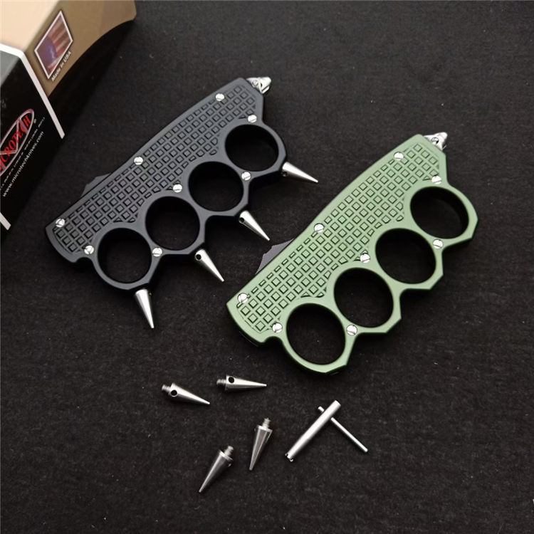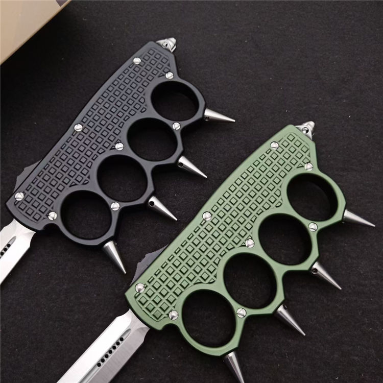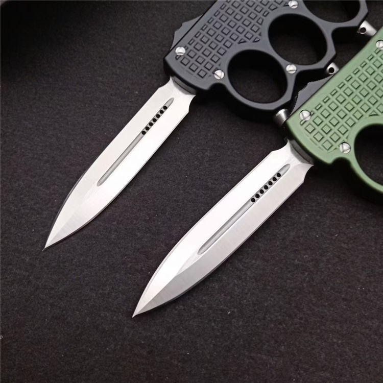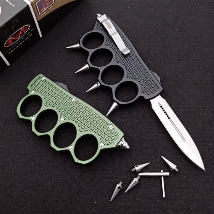 微技术拳套2直出跳刀 全长:24.5CM 刃长:9.5CM 柄长:15.0CM 刃宽:2.1CM 刃厚:0.3CM 刃材:7CR17 柄材:铝合金镀黑钛 刀型:直跳 锁定:按钮锁 重量:250克(含包装) 附件:彩盒,送拆刀工具整刀用CNC,电脑锣,线切割制作而成,手工,精密度非常高,很值得收藏的一把刀
