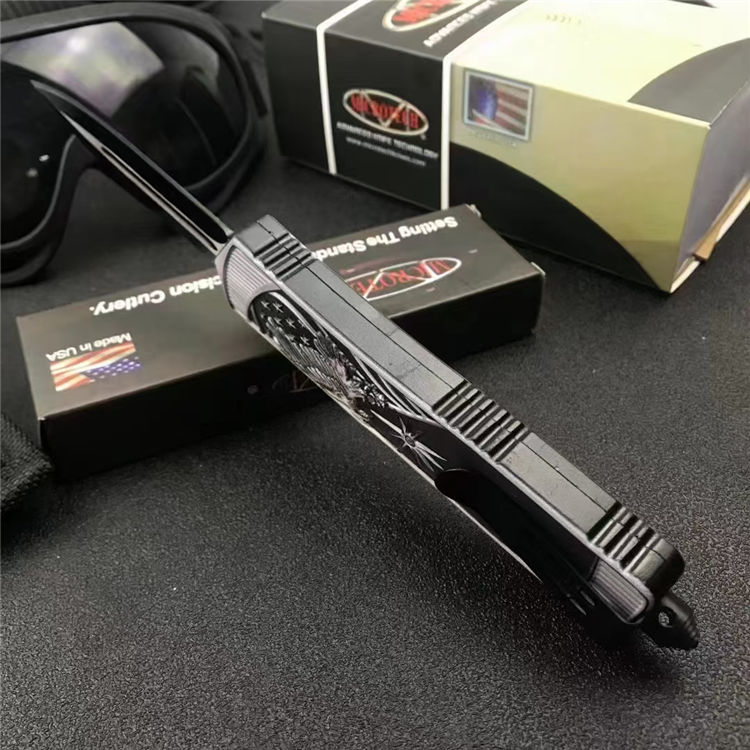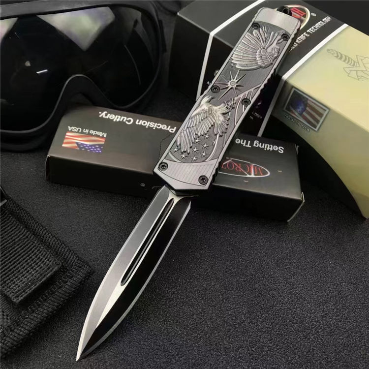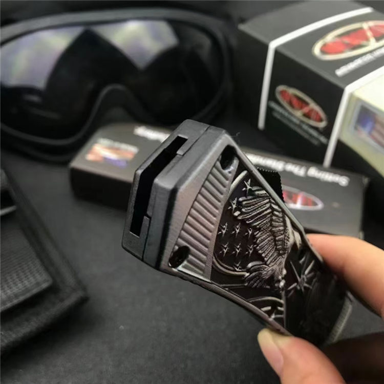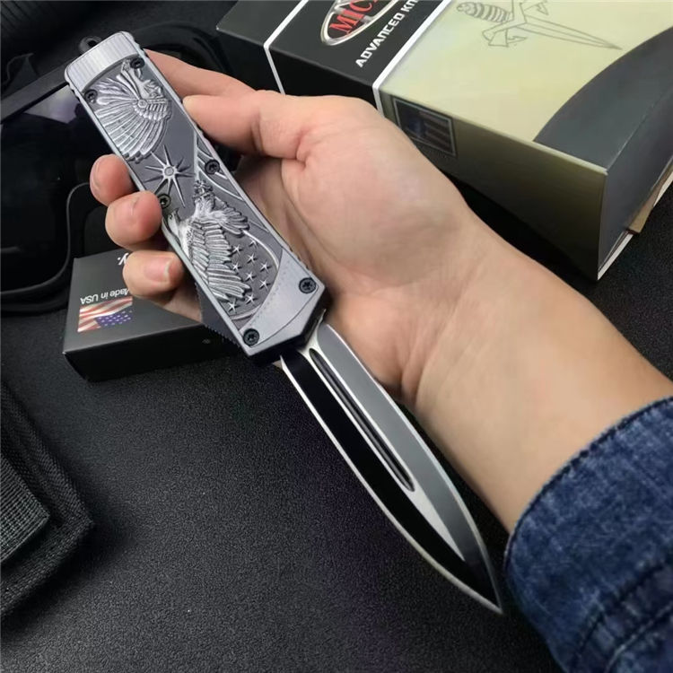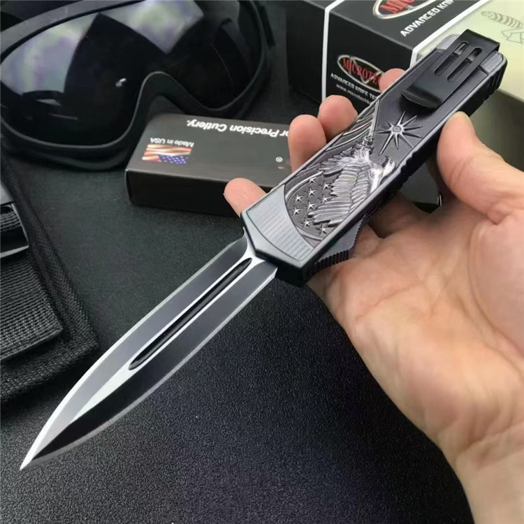 微技术神鹰直出跳刀 全长:22cm 刃长:8.5cm 刃厚:2.5mm 刃材:440C 闭合:12cm 硬度:57HRC 刀重:220g 毛重:340g 表面:氧化白 柄材:锌铝合金+3D打印 锁闭:直出弹簧 包装:尼龙袋+原装盒
