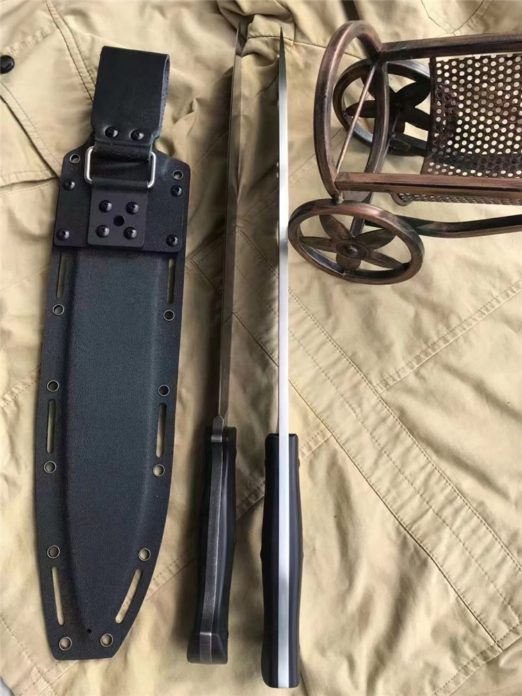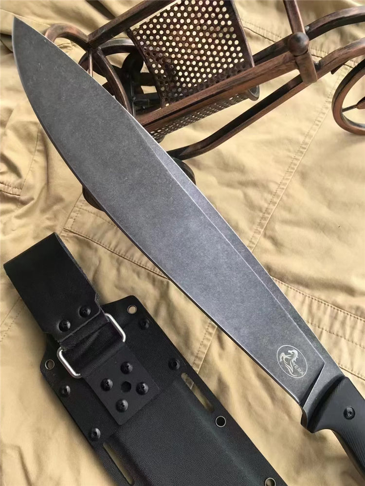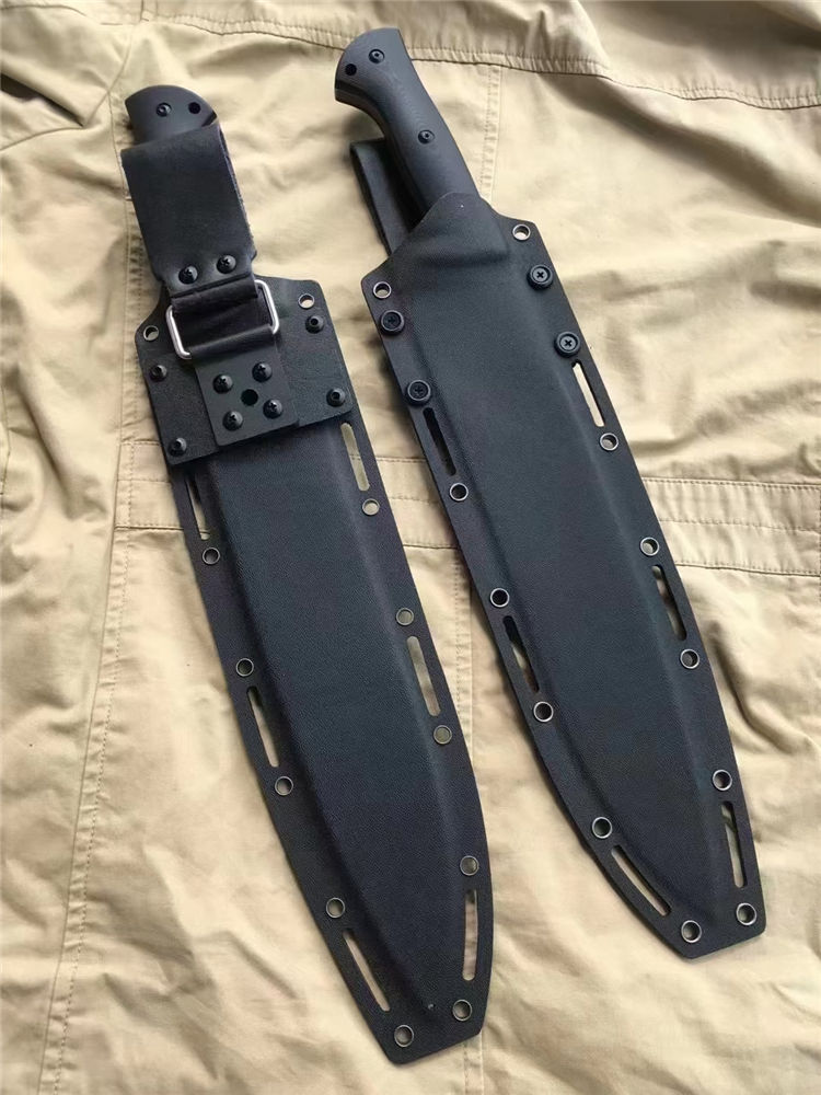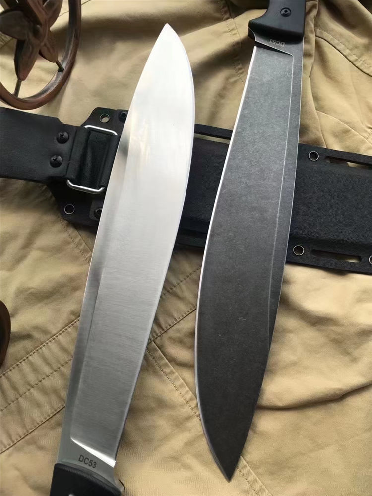 野马屠妖直刀 全长:45.3cm 刃长:31.2cm 柄长:14.1cm 刃厚:0.63cm 刃宽:5.4cm(最宽处) 手柄:G10 刃材:DC53磨具钢(材料保真) 硬度:60-61HRC 附件:进口美版2.0K鞘 重量:裸刀700克、鞘200克