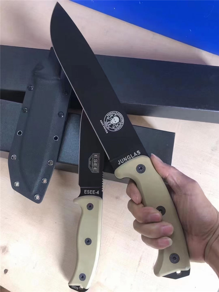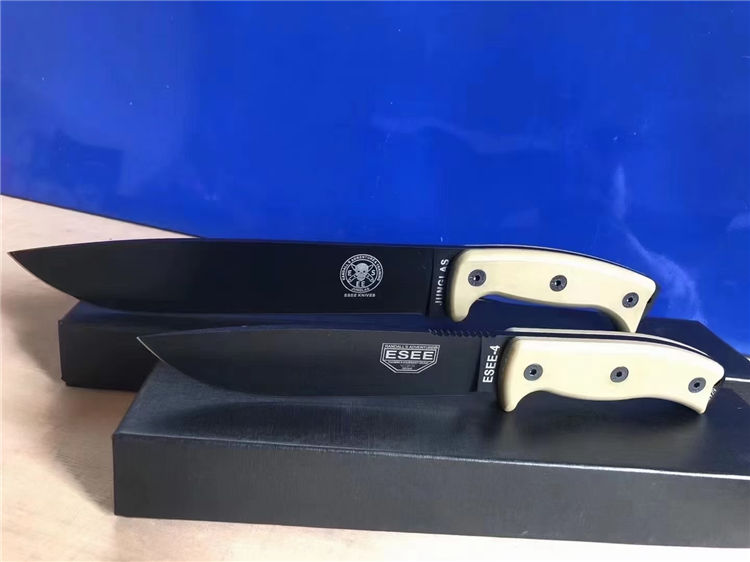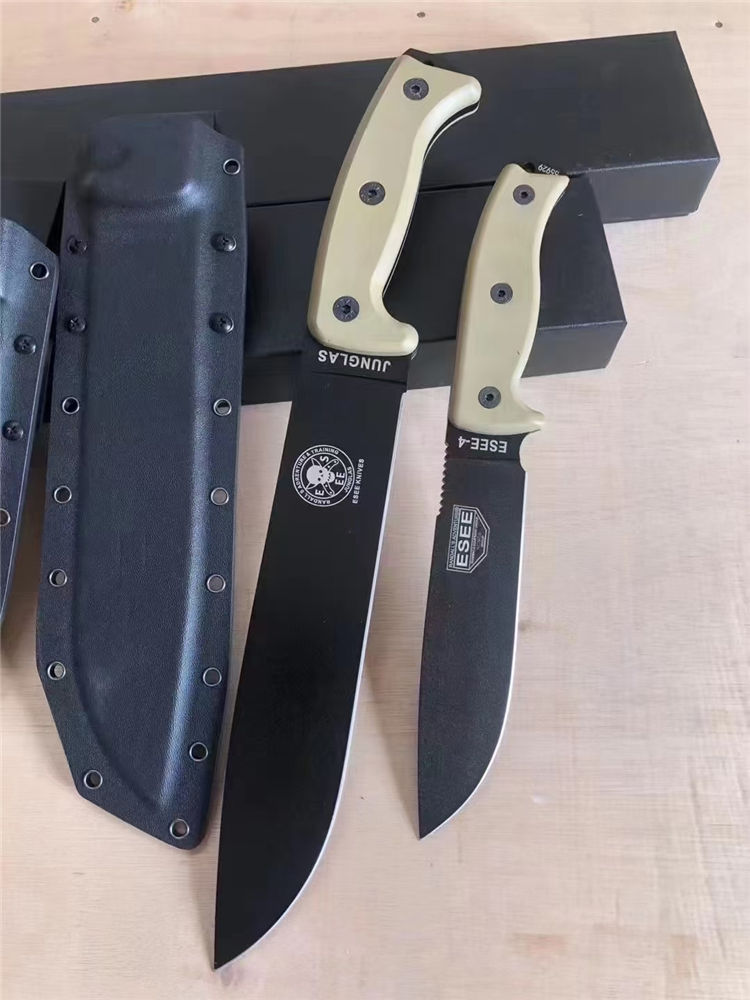 ESEE直刀 小号型号: RAT ESEE-RC4PCP 340元 全长:310mm 刃长:170mm 刃材:1095 硬度:59HRC 表面:环氧化物涂层 刃厚:5mm 柄长:140mm 柄材:帆布米卡塔 重量:210g 刃套:Kydex 大号型号:ESEEJUNGLASIIE 全长:420mm 刃长:250mm 刃材:1095 硬度:59HRC 表面:环氧化物涂层 刃厚:5mm 柄长:170mm 柄材:帆布米卡塔 重量:560g 刃套:Kydex