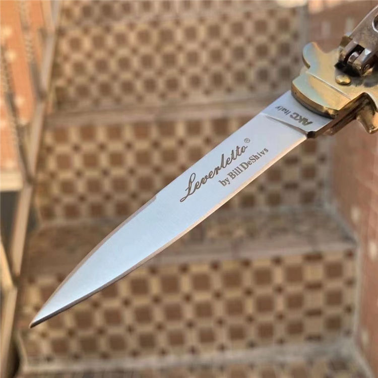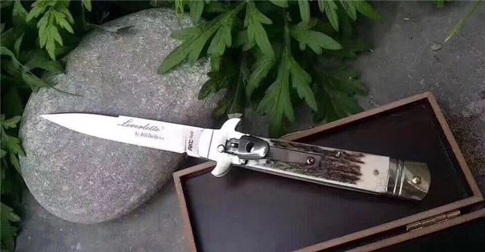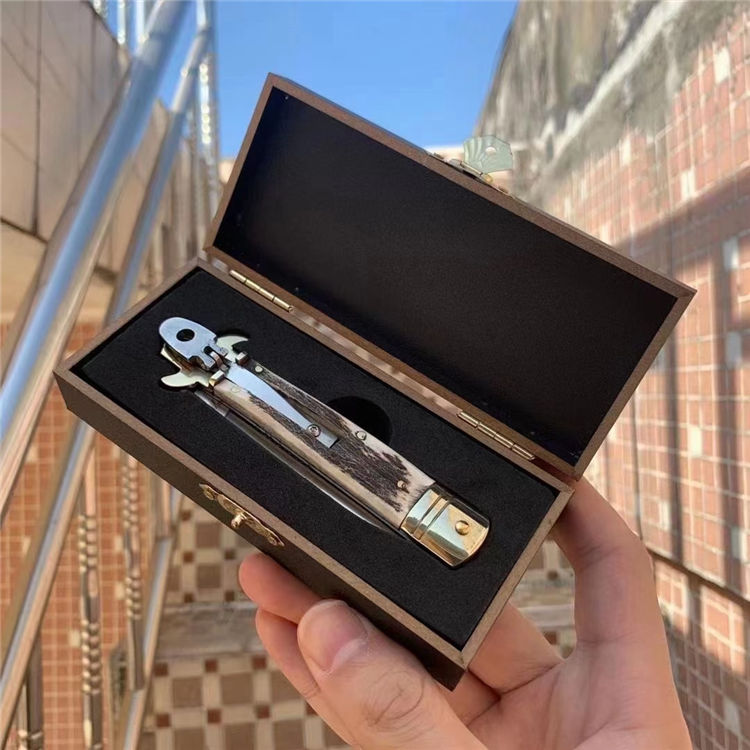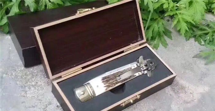 精仿意大利AKC鹿角柄弹跳刀(中号) 全 长:195mm 刃 长:78mm 柄 长:111mm 刃 宽:19mm 刃 厚:2.6mm 刃 材:进口D2钢 重 量:210g(含包装) 硬 度:58-60HRC 表 面:砂光 柄 材:鹿角 锁 型:弹簧刀 其 他:配木盒