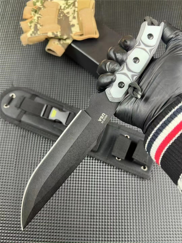 复刻版TOPS阿拉斯加捕鲸叉直刀 全长:30.4cm 刃长:17.1cm 切割刃长:14.9cm 刃材:1095HCA高碳钢钢材 硬度:58-60 HRC 刃厚:5mm 柄材: Black Linen Micarta黑色米卡塔 表面处理:黑色防反光涂层 重量:410克 刀鞘:尼龙刀鞘
