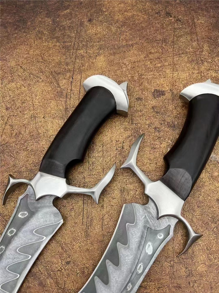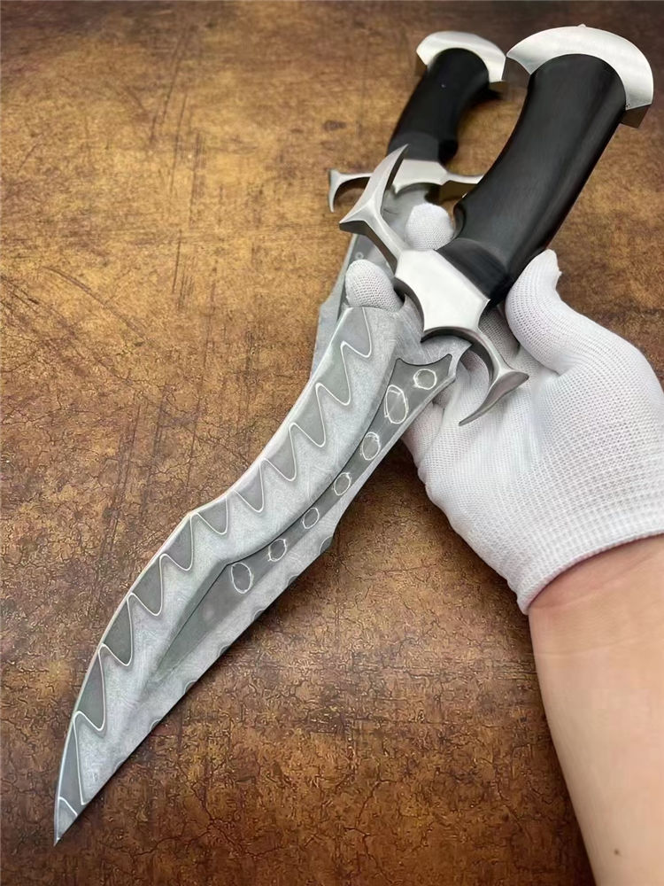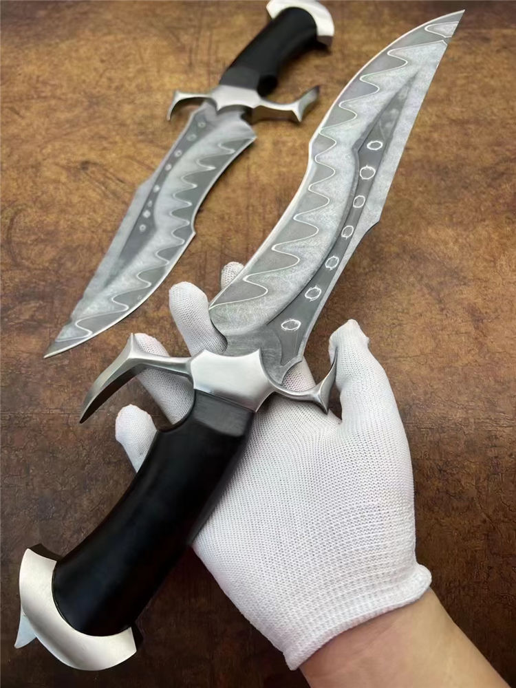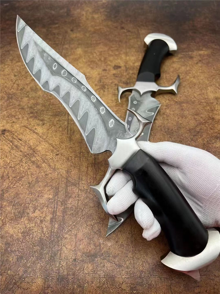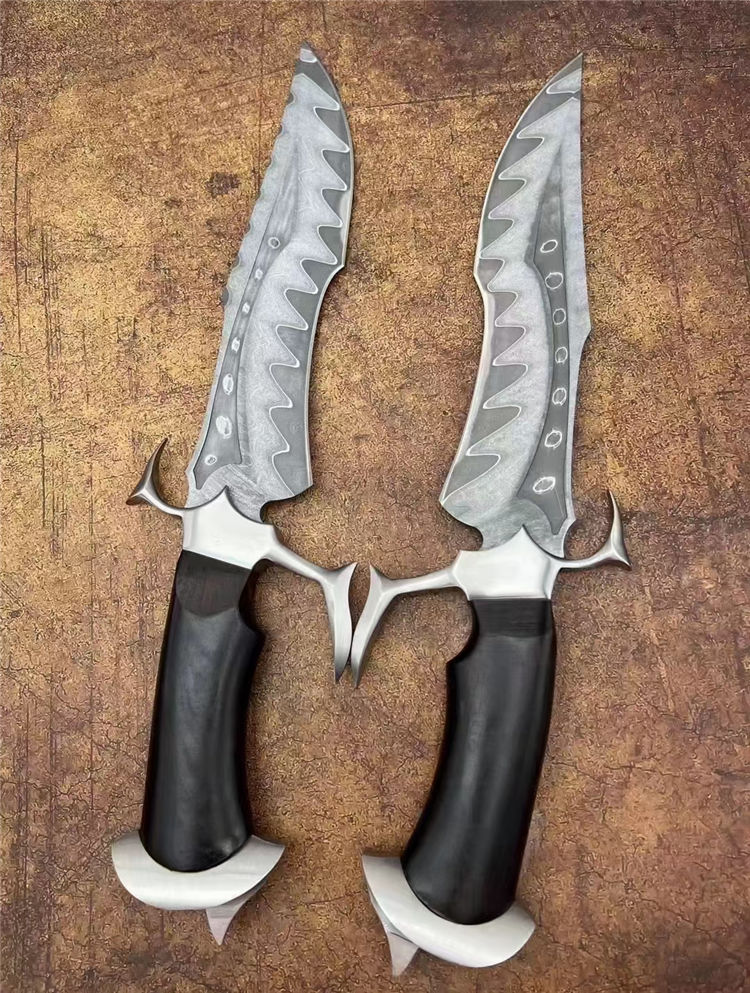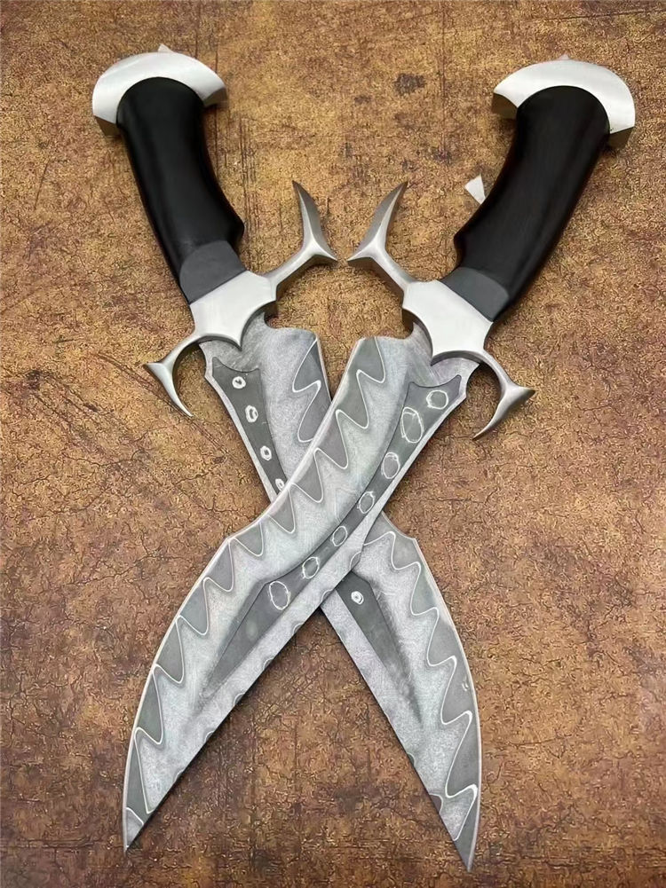 手工制作质量上绝对放心,采用进口云锻VG10日本夹钢复古工艺,硬度达到60-62HRC,每一个细节蕴含着浓浓的手工味道,,用心制作,工期历经6个月完成!双钢头一体线切割 每个钢头经过几十刀切割出来 +CNC加工完成,非常难得,你看到每一把刀都是给你独特个性风格,粗中有细,细中有腻!这就是匠心精神!你沉稳冷静.霸气、强悍、不甘平庸!意大利进口优质植鞣皮国内大师纯手工雕刻着色缝线!每一个皮套都是匠人的心血换来的
