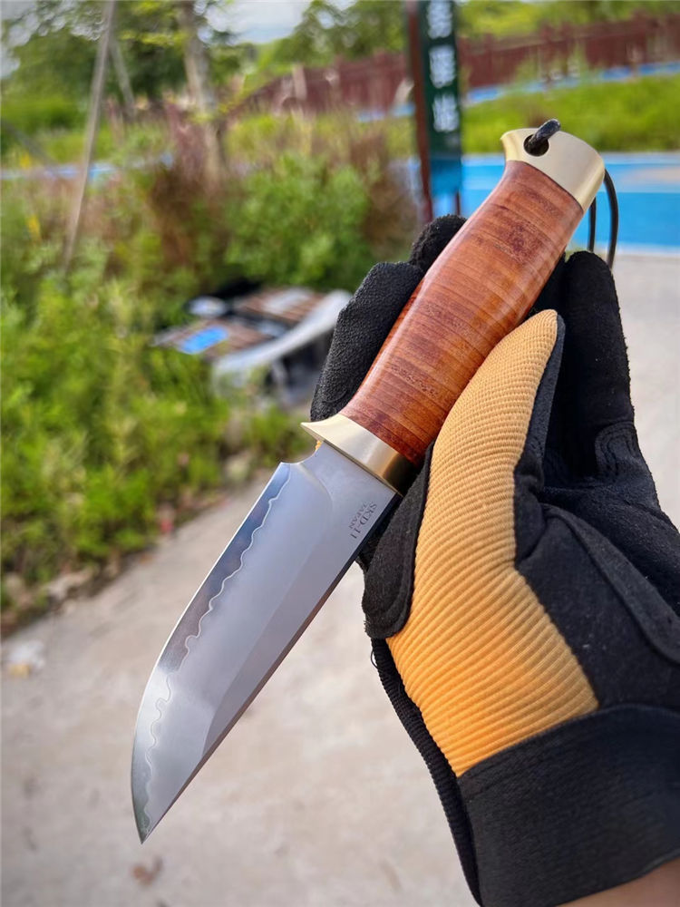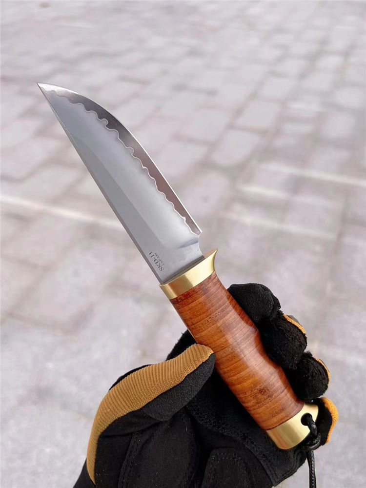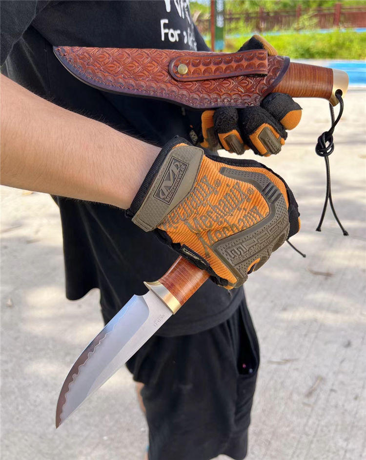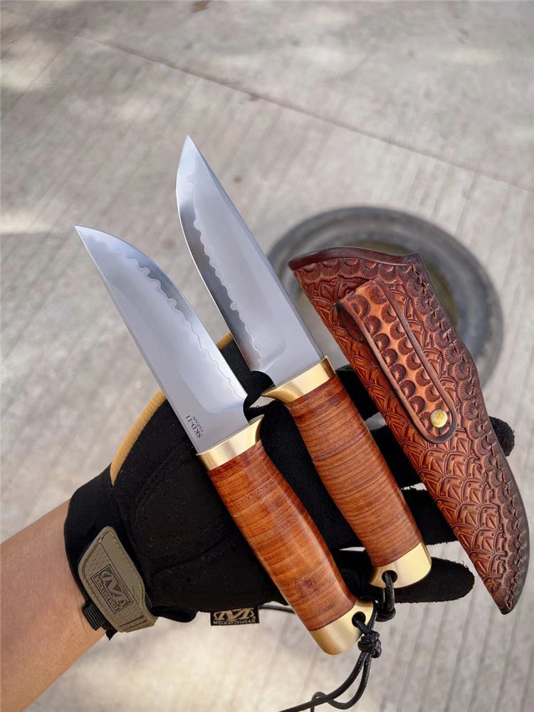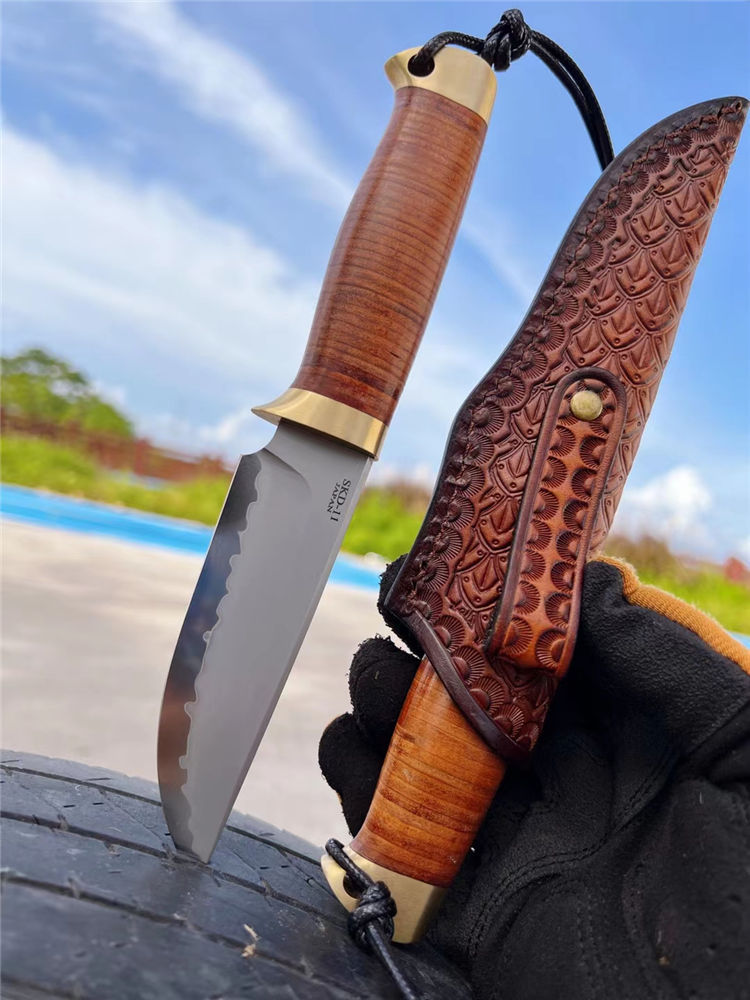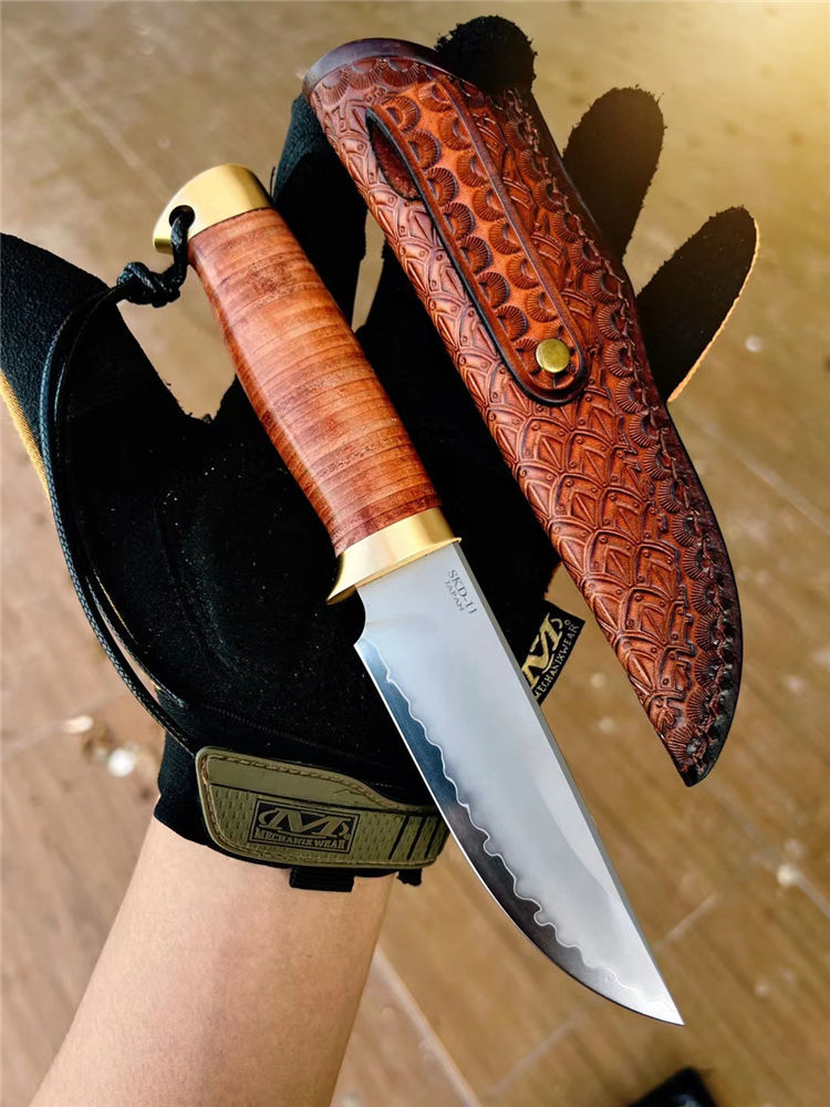 著名手工大师打造、出口订单专供款、此批数量不多机遇难得,采用日本SKD-11钢材一体龙骨贯穿尾部,61-62HRC硬度,镜光火山烧纹效果,弧形刃口手工开刃,SDK-11钢材在业界最为知名,价格也最高,高精密都长寿冷作模具以及刀具,具有高硬度和高韧性本身,而且锋利度保持极耐久,手柄采用牛皮植鞣革包柄+纯黄铜手工打磨,造型突出而且掌握有力防滑有手感。好东西不需过多介绍