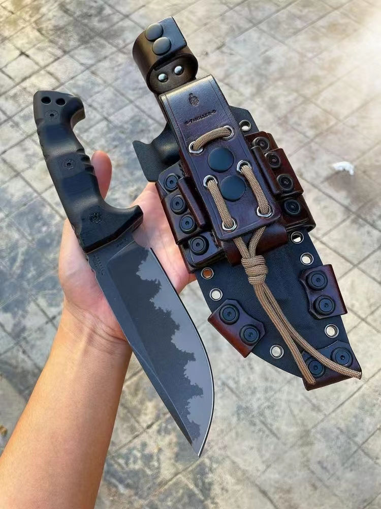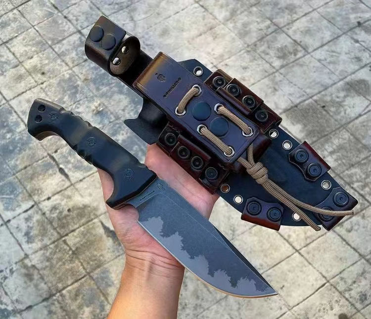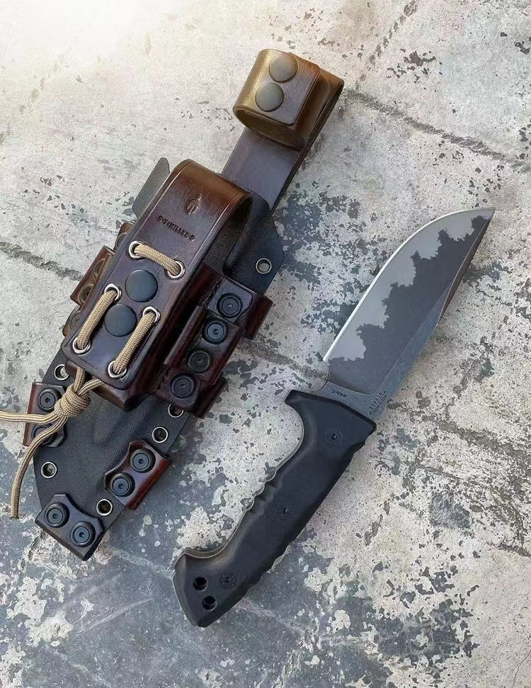 米勒兄弟M33直刀 全长:29.5CM 刃长:9.8CM 柄长:14.5cm 刃宽:4.6CM 刃厚:7MM 钢材:公司提供进口A8高硬度合金钢 硬度:60HRC,专业真空深冷油淬热处理 表面效果:加硬型离子镀钛,迷彩工艺 净量:530G,含鞘900G 柄材:双色G10,沙漠+黑色 刀鞘:加厚型进口 2.4mmK 鞘+意大利进口植鞣皮手工制作刀鞘可装多功能小刀与打火石 风格:战术强悍型,高端品质 包装:手工盒子包装