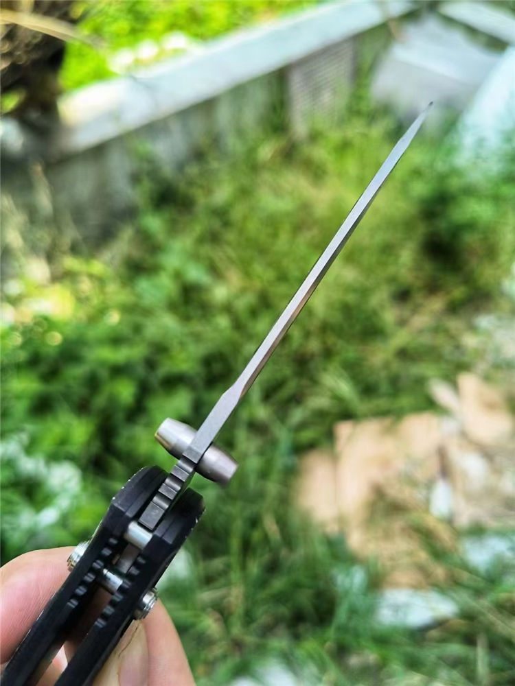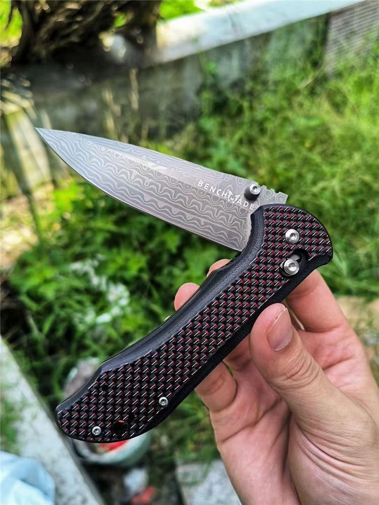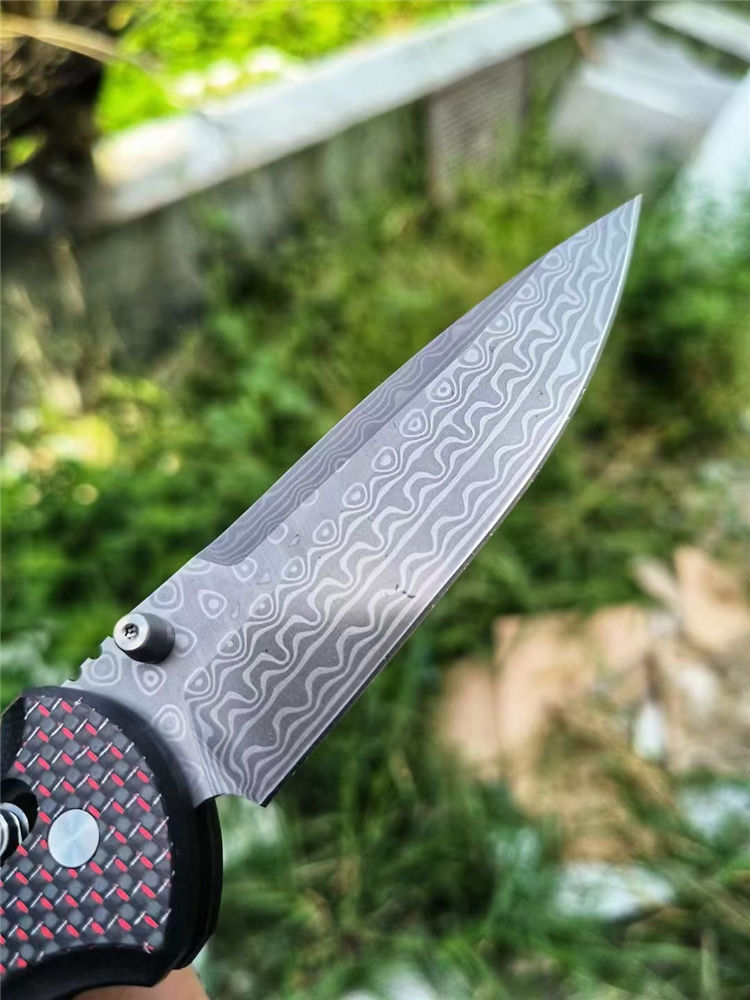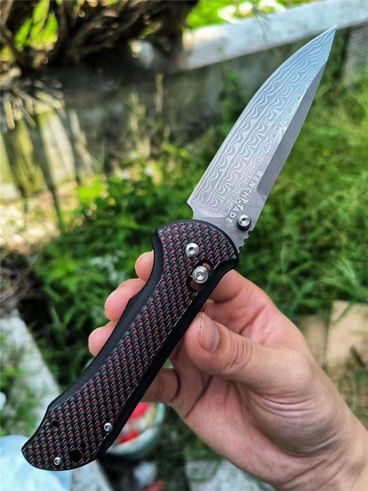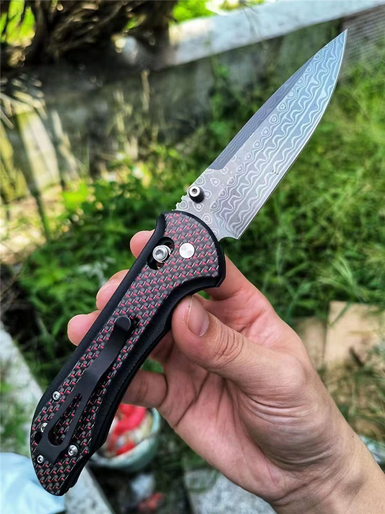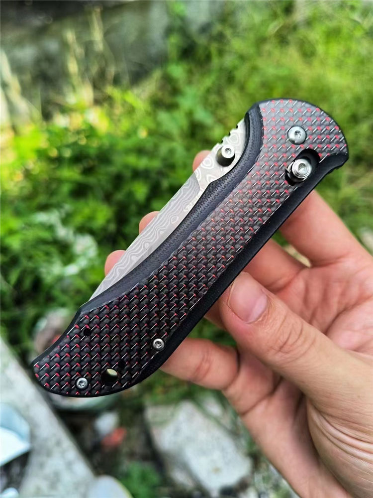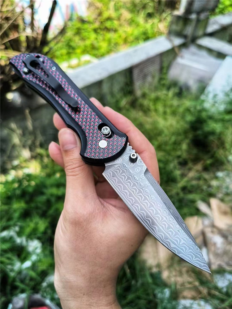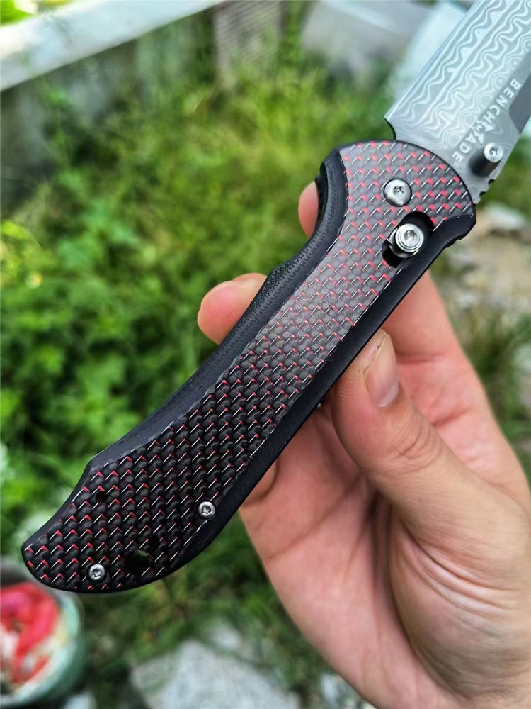 大马士革蝴蝶BM908折刀 全长:20.8cm 刃长:9.0cm 柄长:118mm 刃厚:2.8mm 刃材:大马士革钢 硬度:59-60HRC 柄材:碳纤维+410不锈钢 内衬:AXIS Lock轴锁 净重:136g