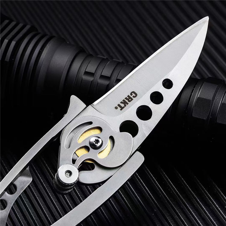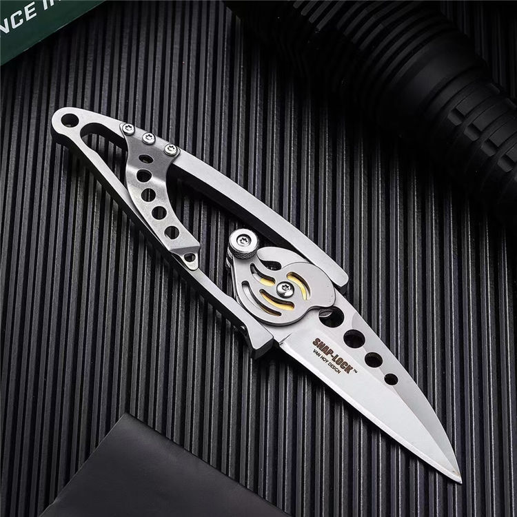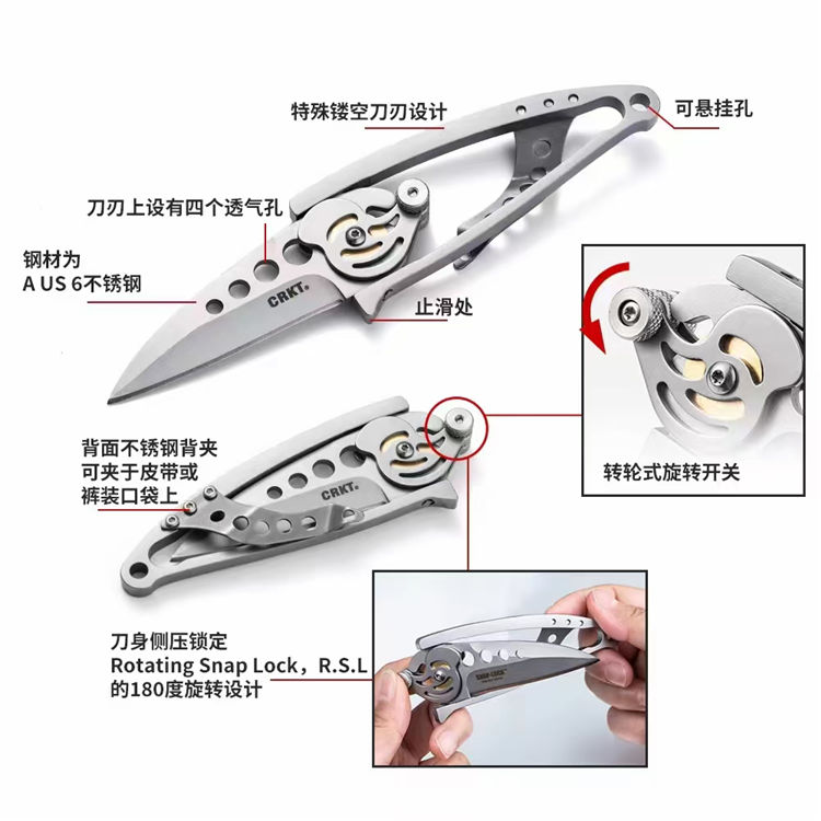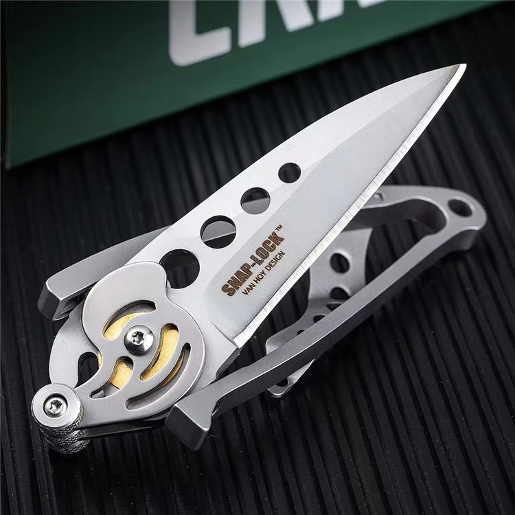 来自北卡罗蓝纳州(North Carolina)的伊凡霍依(Ed Van Hoy)所设计的侧压式锁定(Snap Lock)似乎已成为大家熟悉的杰作。2002年美国刀展中及在A.G.Russell票选中大马士革Snap Lock折刀荣获了最佳创新折刀(Most Innovative Folding Knife)的殊荣。严选上等的材料及革新的概念在这款刀上表露无遗。刀身侧压锁定(Rotating Snap Lock, R.S.L)的180度旋转设计却不影响它结实且实用的功能。曾被称做前卫刀款(far out knife)的伊凡霍依侧压式折刀如今已成为事实,如今您终于可体验这把全新形象的刀品,您当有另一番不同惊喜
