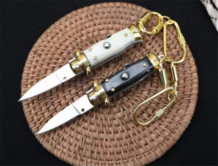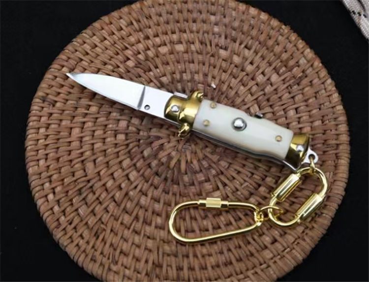 迷你AKC匙扣跳刀 全长:9.5CM 刃长:4.1CM 柄长:5.5MM 刃厚:2.0mm 刃材:440 刀柄:亚力克 开刀方式:弹簧带安全锁