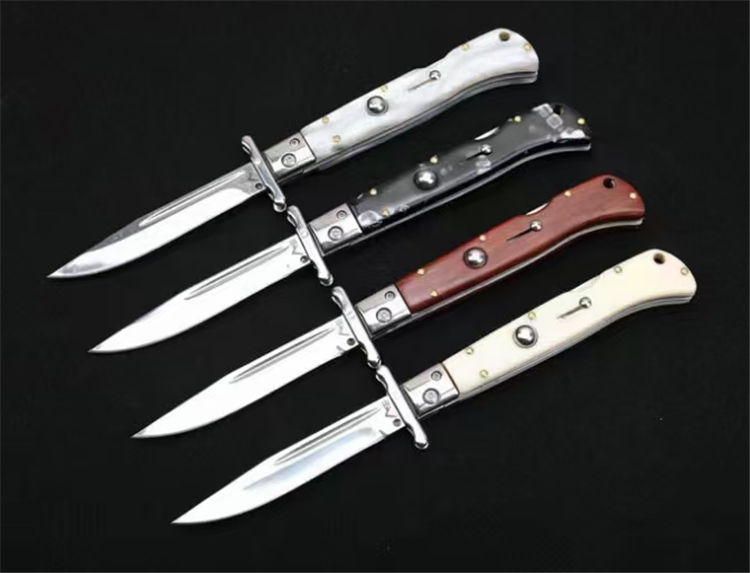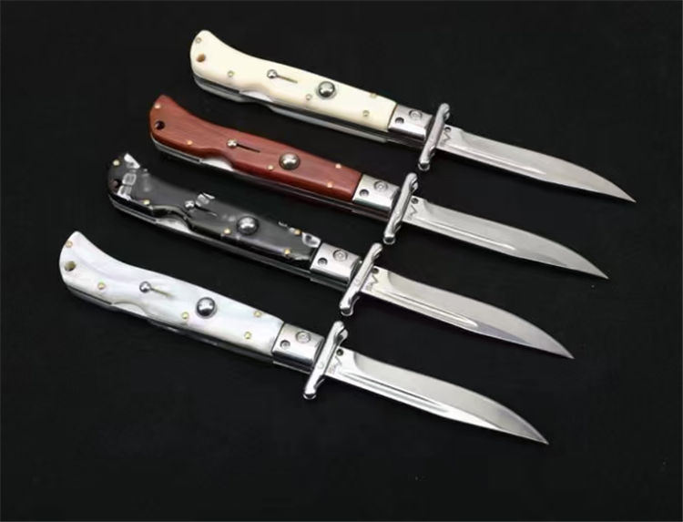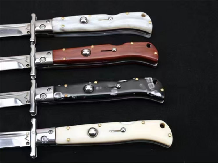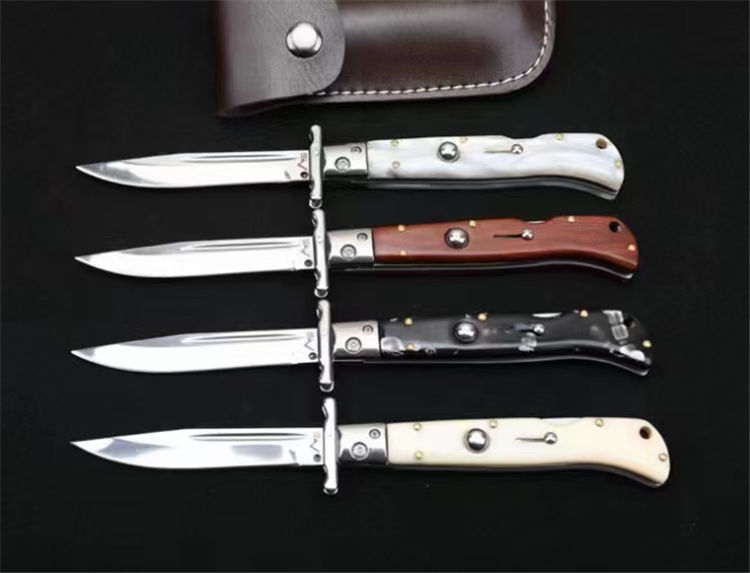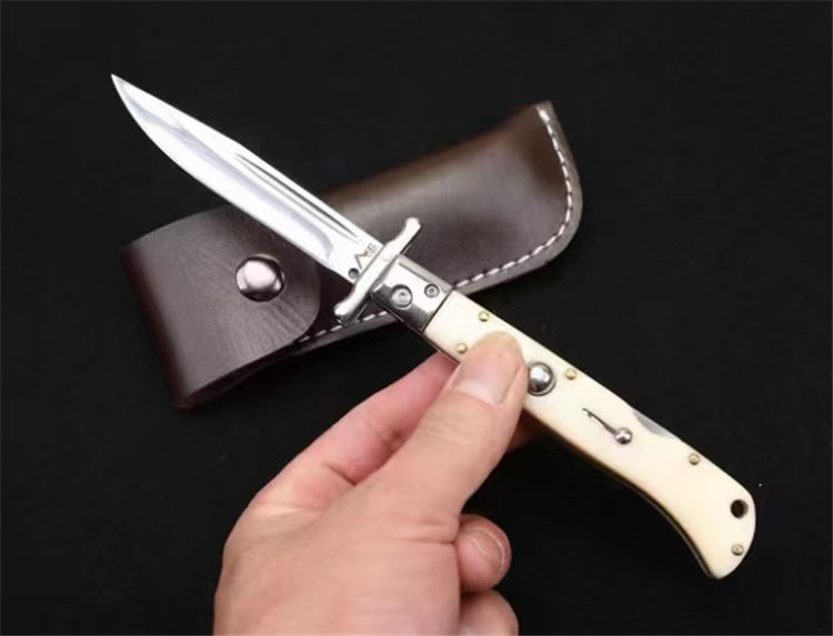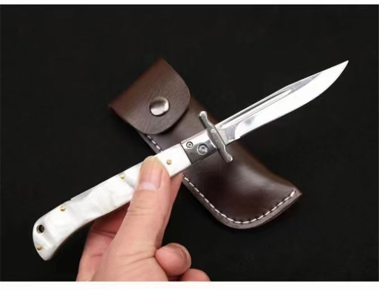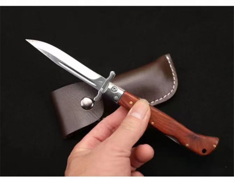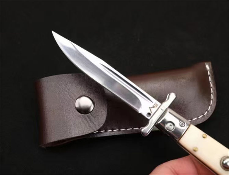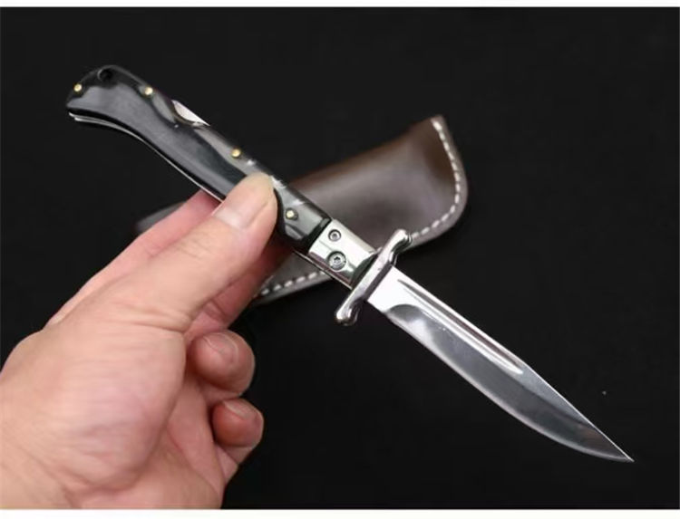 9寸爱国者AKC跳刀 总长:23.5CM 刃长:9.8CM 刃宽:1.43CM 刃厚:2.6MM 刃材:440C 柄长:12.2CM 柄宽:1.8MM 柄厚:18MM 重量:202G 刀鞘:牛皮鞘