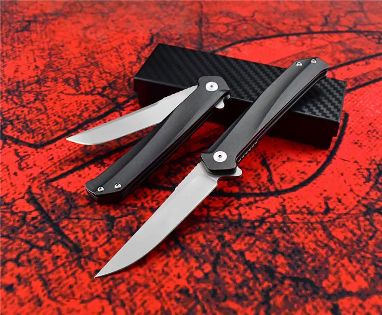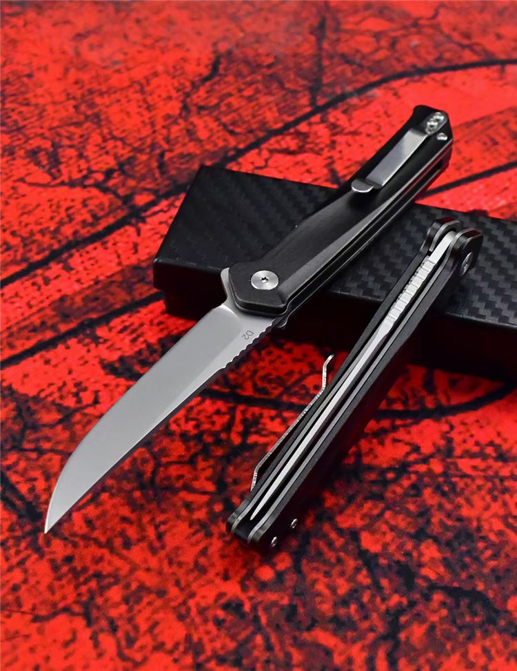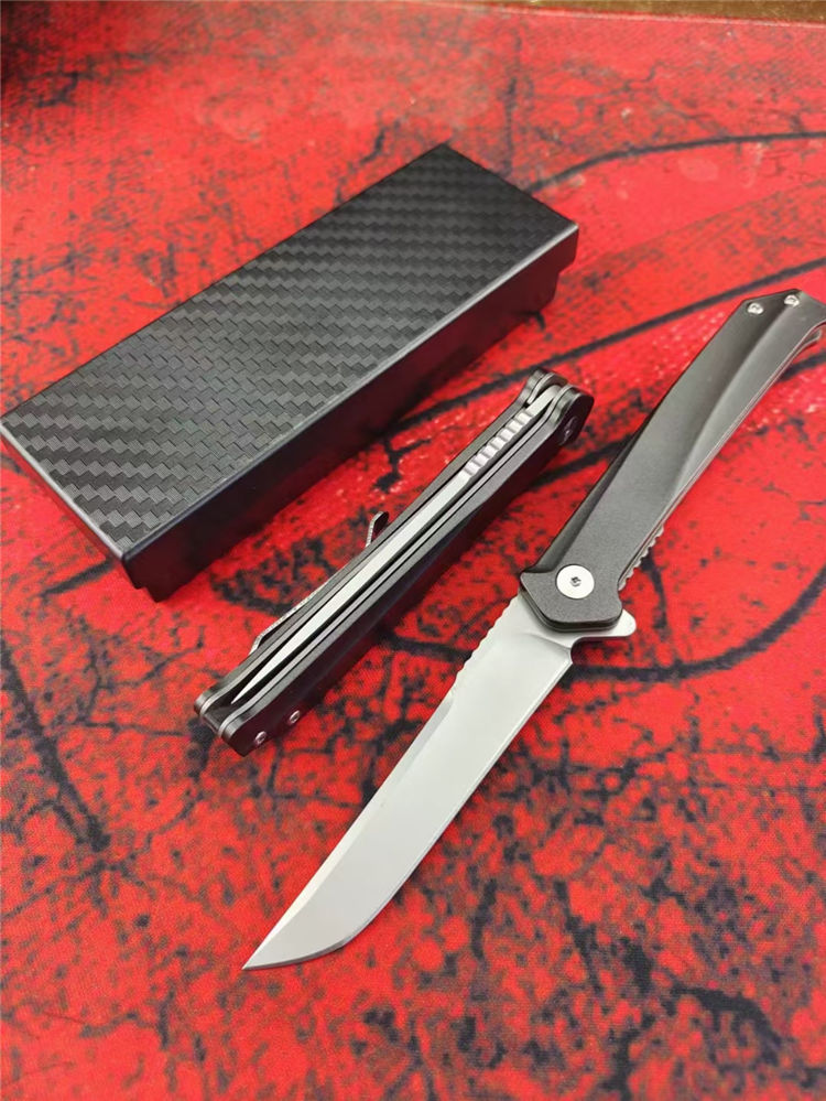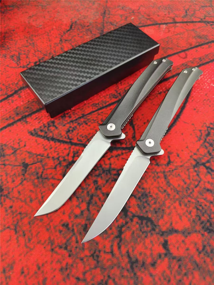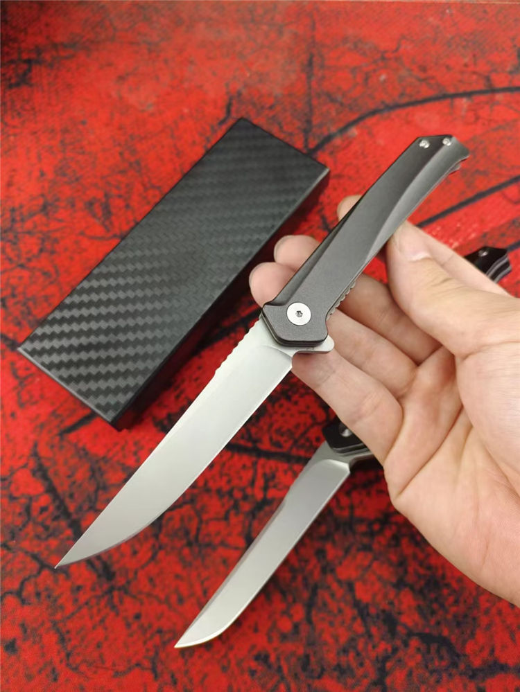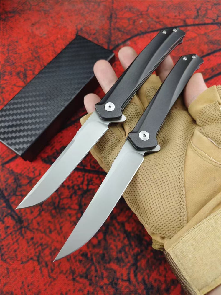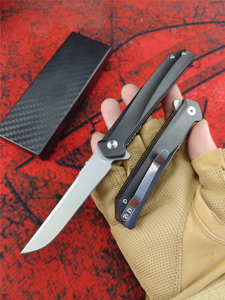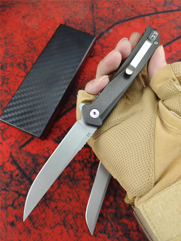 D2天翼折刀 全长:20CM 刃长:8.5CM 柄长:11.5CM 刃厚:3MM 刃材:D2 柄材:T6铝合金+钢片 硬度:59-60HRC 净重:86g 毛重:138g(含礼盒) 包装:礼盒 结构:进口双滚珠轴承一键快开
